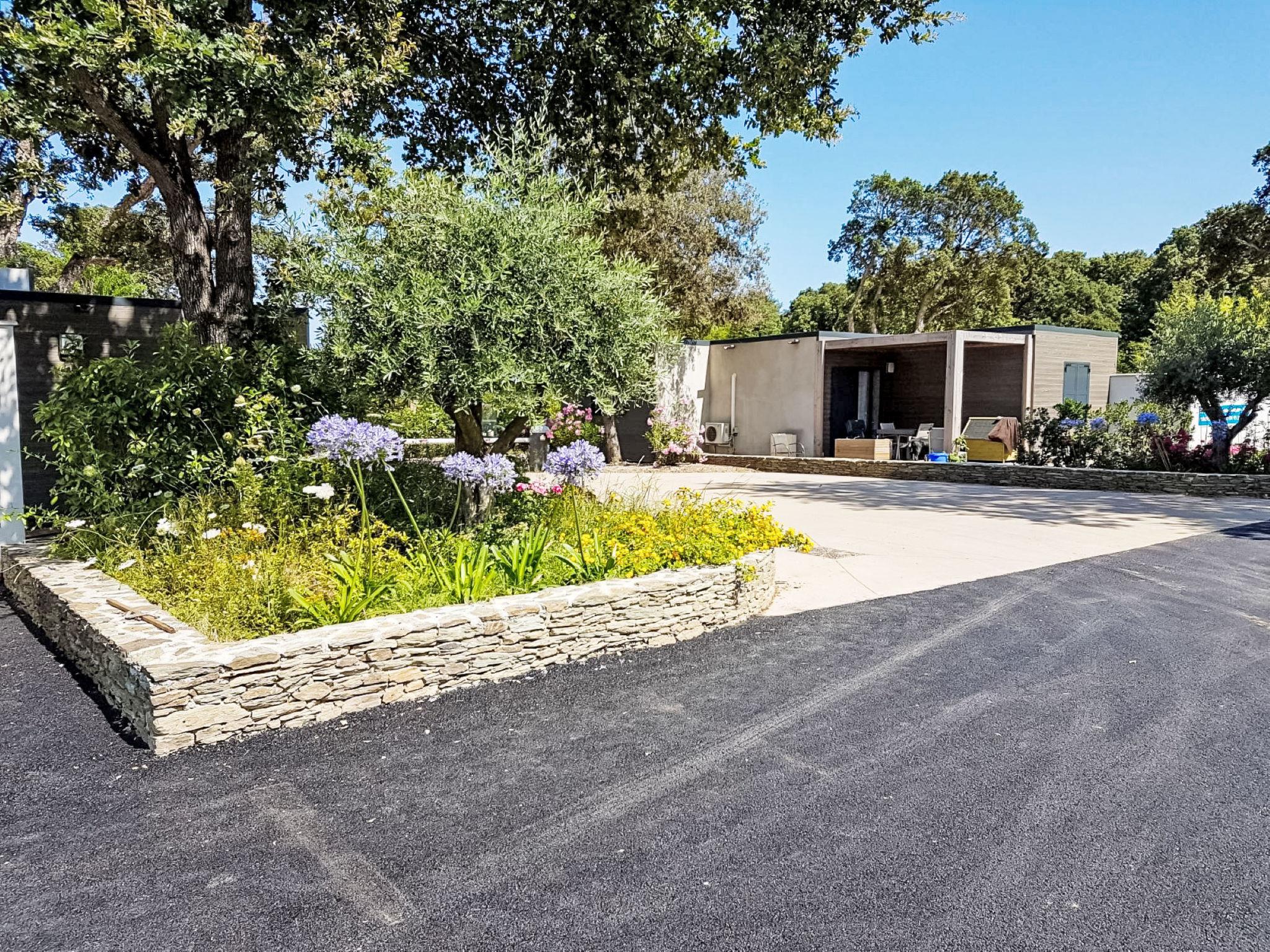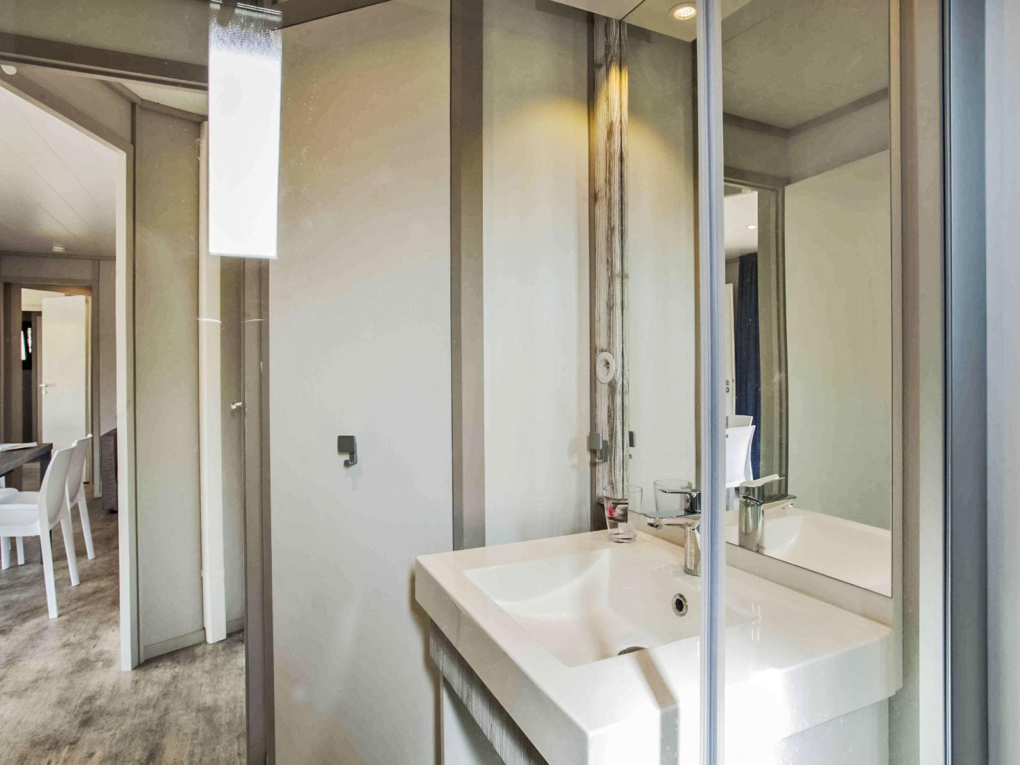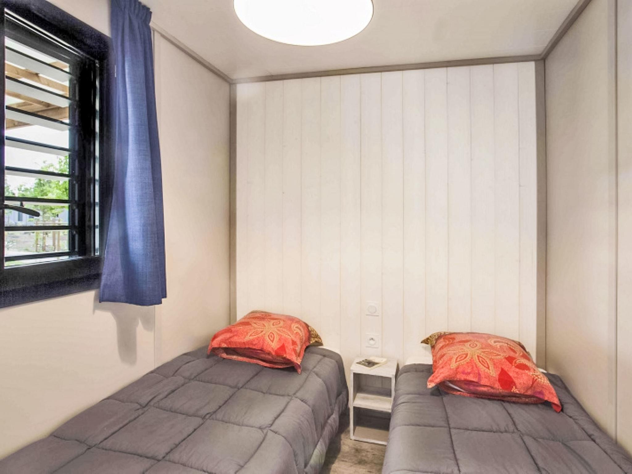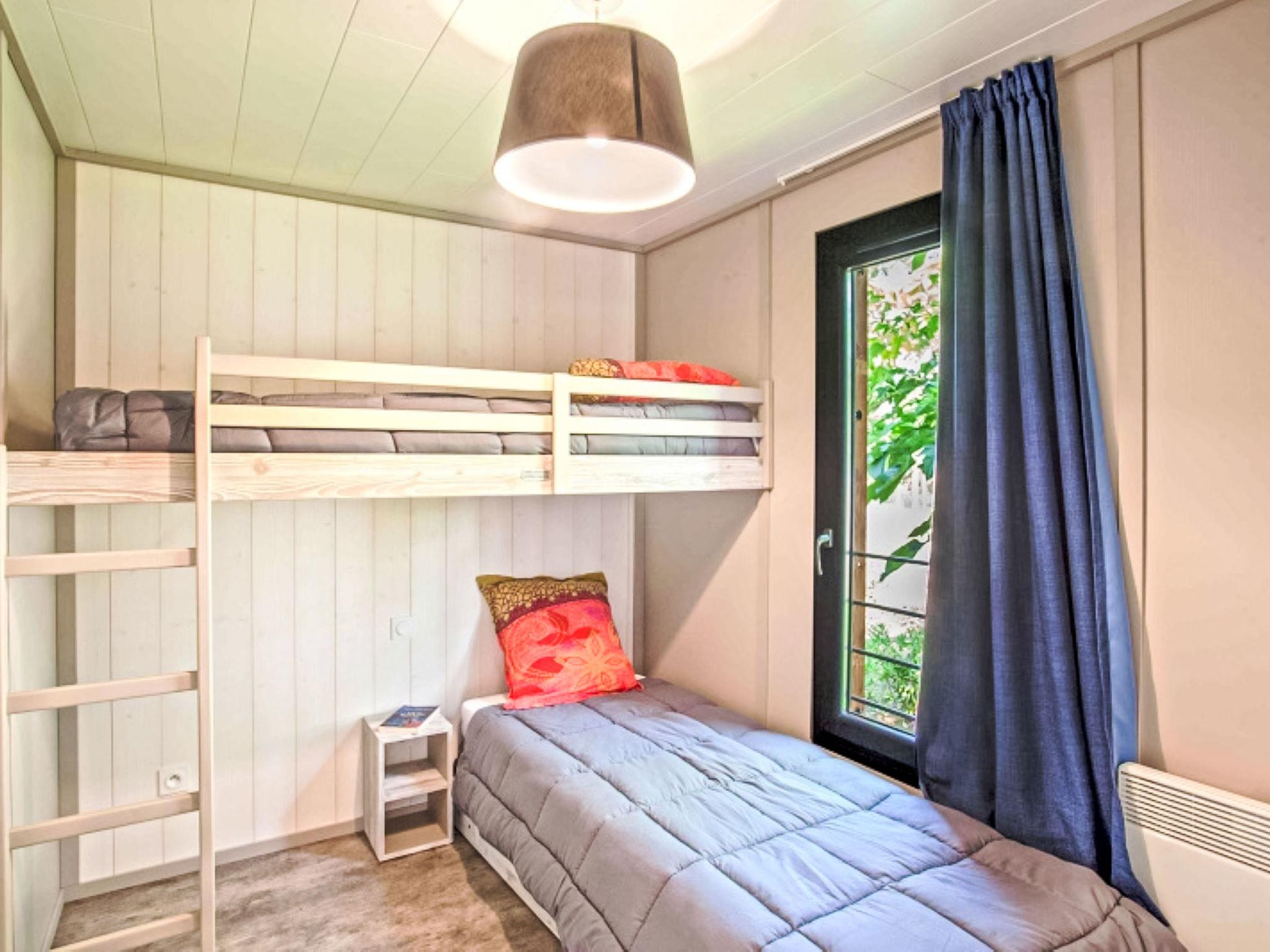 "Lodge Natura 6p", 4-room chalet 56 m2. Comfortable furnishings: living/dining room with dining table and TV (flat screen), air conditioning. Exit to the terrace. 1 room with 1 french bed (160 cm, length 200 cm), shower/WC. 1 room with 2 beds (90 cm, length 190 cm). 1 room with 1 x 2 bunk beds (90 cm, length 190 cm). Kitchenette (oven, dishwasher, 3 induction hot plates, toaster, kettle, microwave, electric coffee machine). Shower, sep. WC. Electric heating. Terrace partly roofed, small garden. Terrace furniture, barbecue (portable). Facilities: hair dryer. Parking (fenced). Please note: non-smokers only. Smoke alarm. Offer by a commercial proprietor according to Art. 155, IV, CGI