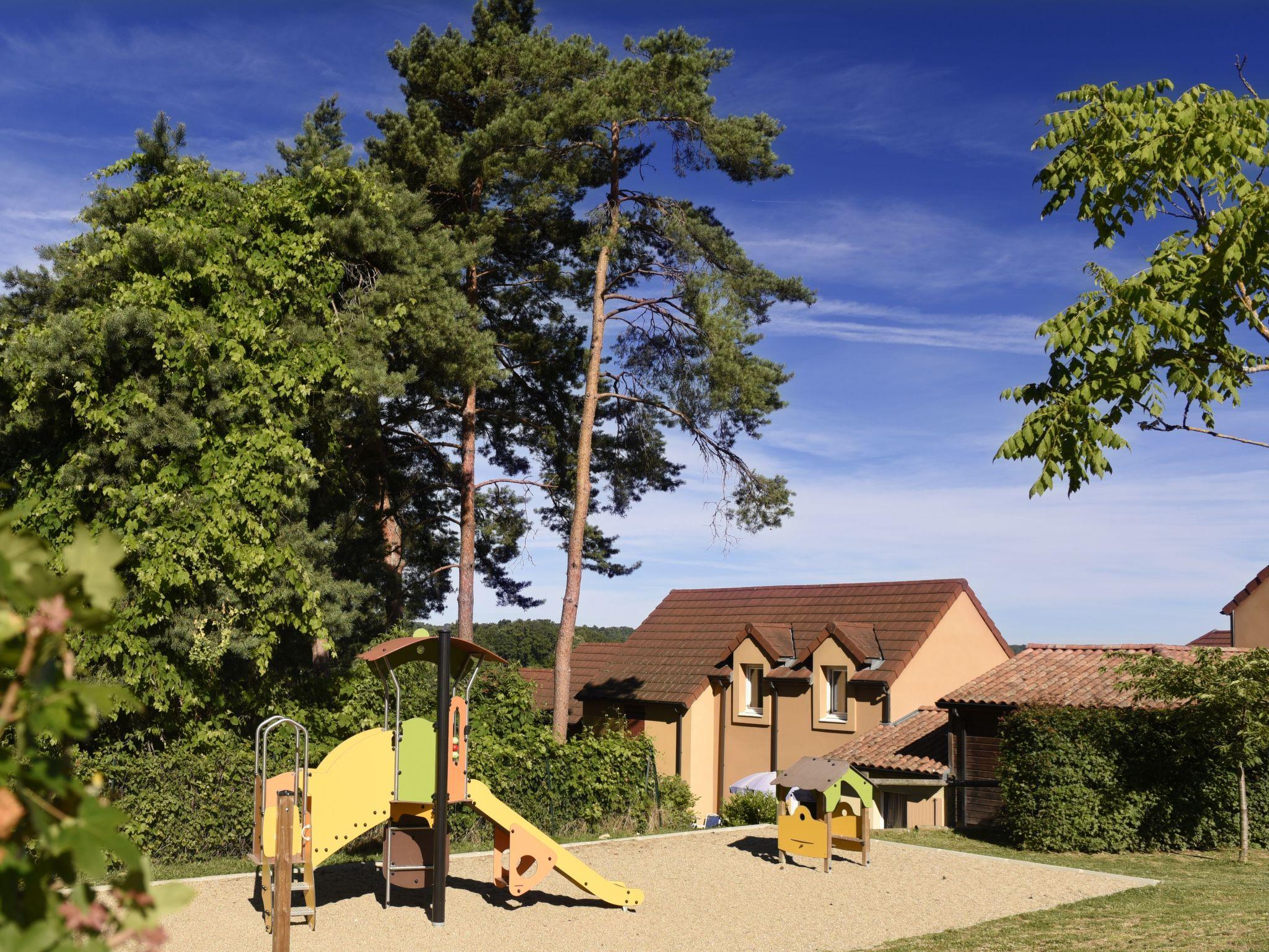 Child friendly resort "Les Coteaux de Sarlat". 100 houses in the residence. 2.5 km from the centre of Sarlat-la-Caneda, on the outskirts, 50 km from the centre of Brive, on a slope. For shared use: property 30'000 m2 (fenced) with lawn and trees, swimming pool heated (17 x 7 m, depth 100 - 140 cm, seasonal availability: 01.May. - 30.Sep.). Children's pool, table tennis, basketball, boccia, children's playground. In the complex: reception, sauna (extra). Fitness room, steam room (extra). Washing machine, tumble dryer (for shared use, extra). Bread roll service. Parking on the premises. Shop 1.7 km. Minigolf 100 m. Please note: Loading and unloading of baggage is possible at the holiday house. The photograph shows a typical example. The holiday properties may differ in living space, floorplan, equipment and furnishing.