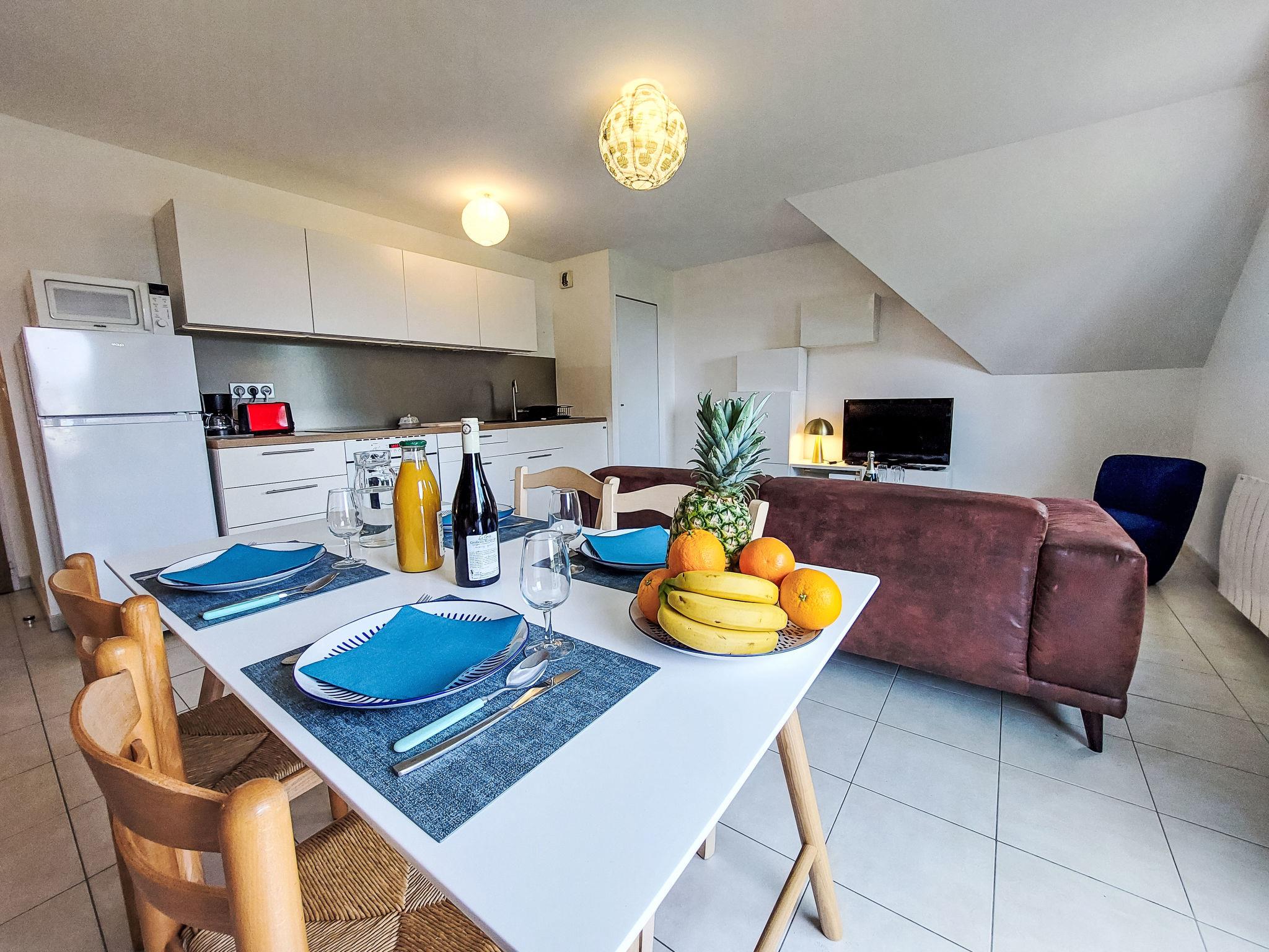 3-room apartment 51 m2 on 1st floor. Very beautiful furnishings: living room with TV (flat screen). Exit to the balcony. 1 room with sloping ceilings with 1 french bed (140 cm, length 190 cm). 1 room with sloping ceilings with 2 beds (90 cm, length 190 cm). Exit to the balcony. Open kitchen (oven, dishwasher, 3 ceramic glass hob hotplates, toaster, microwave, freezer, electric coffee machine). Bathroom, sep. WC. Electric heating. Balcony 8 m2. Balcony furniture. Facilities: washing machine, hair dryer. Internet (WiFi, free). Parking space n 34. Please note: non-smokers only. Smoke alarm. Note: The two single beds (90 cm) can be joined to form a large 180 cm bed, thus offering a modular configuration in the second bedroom. 562400009374M