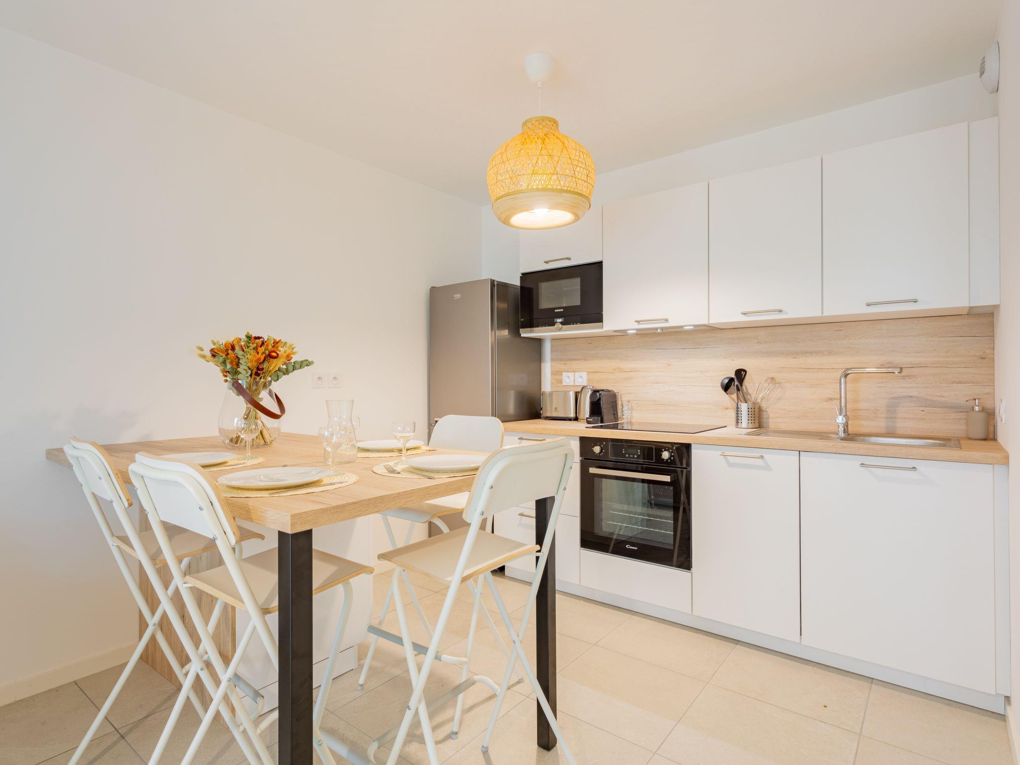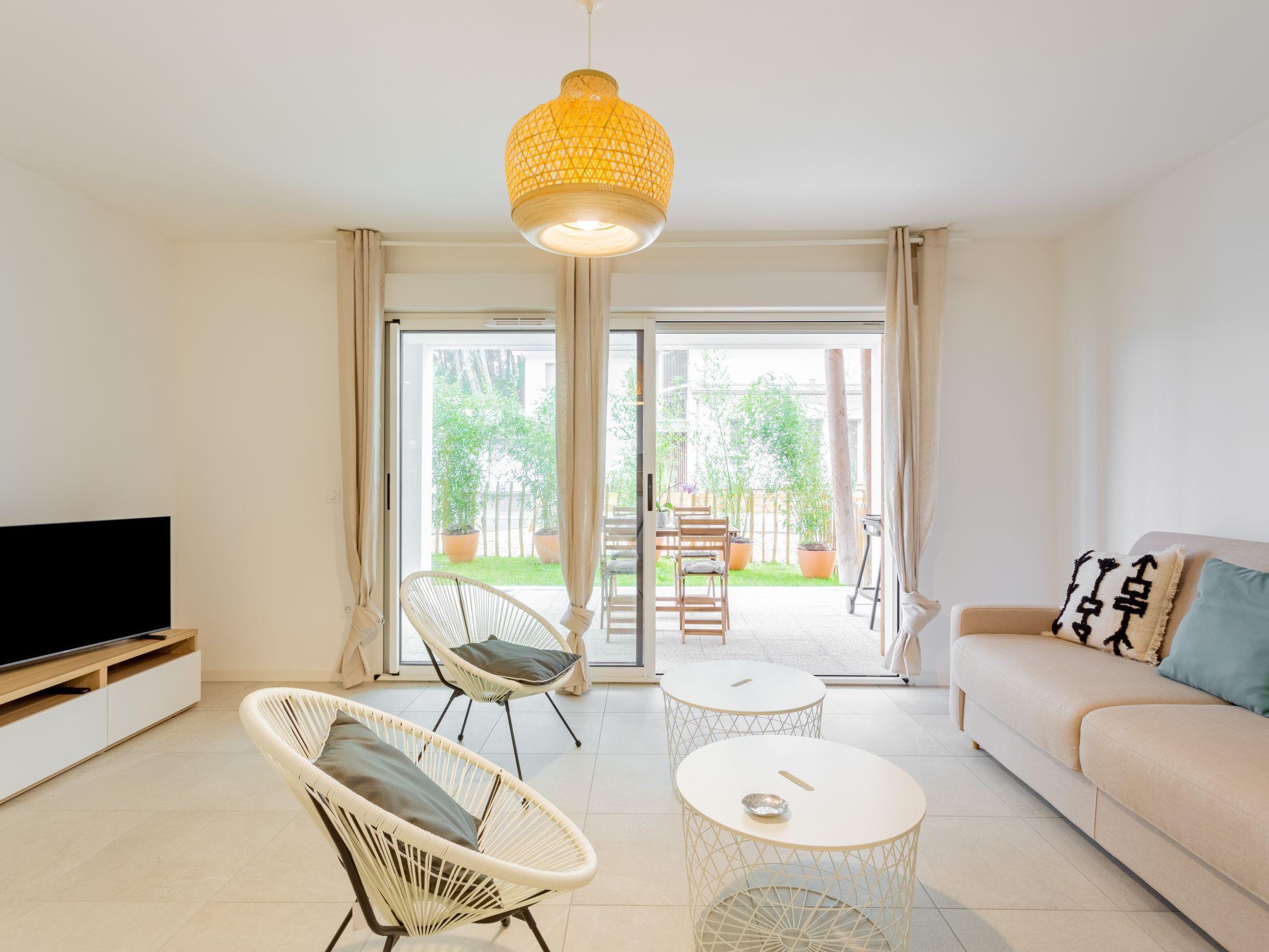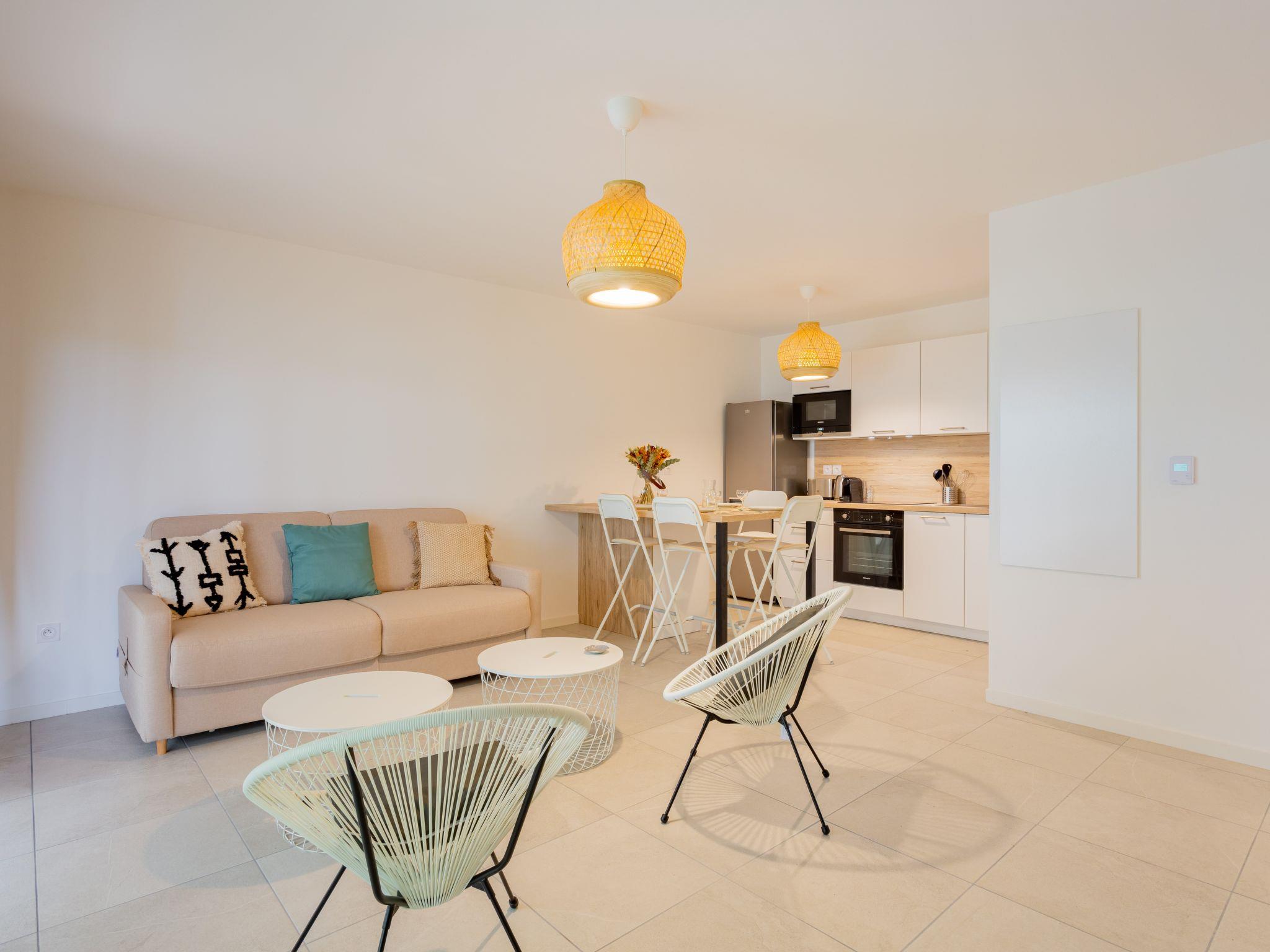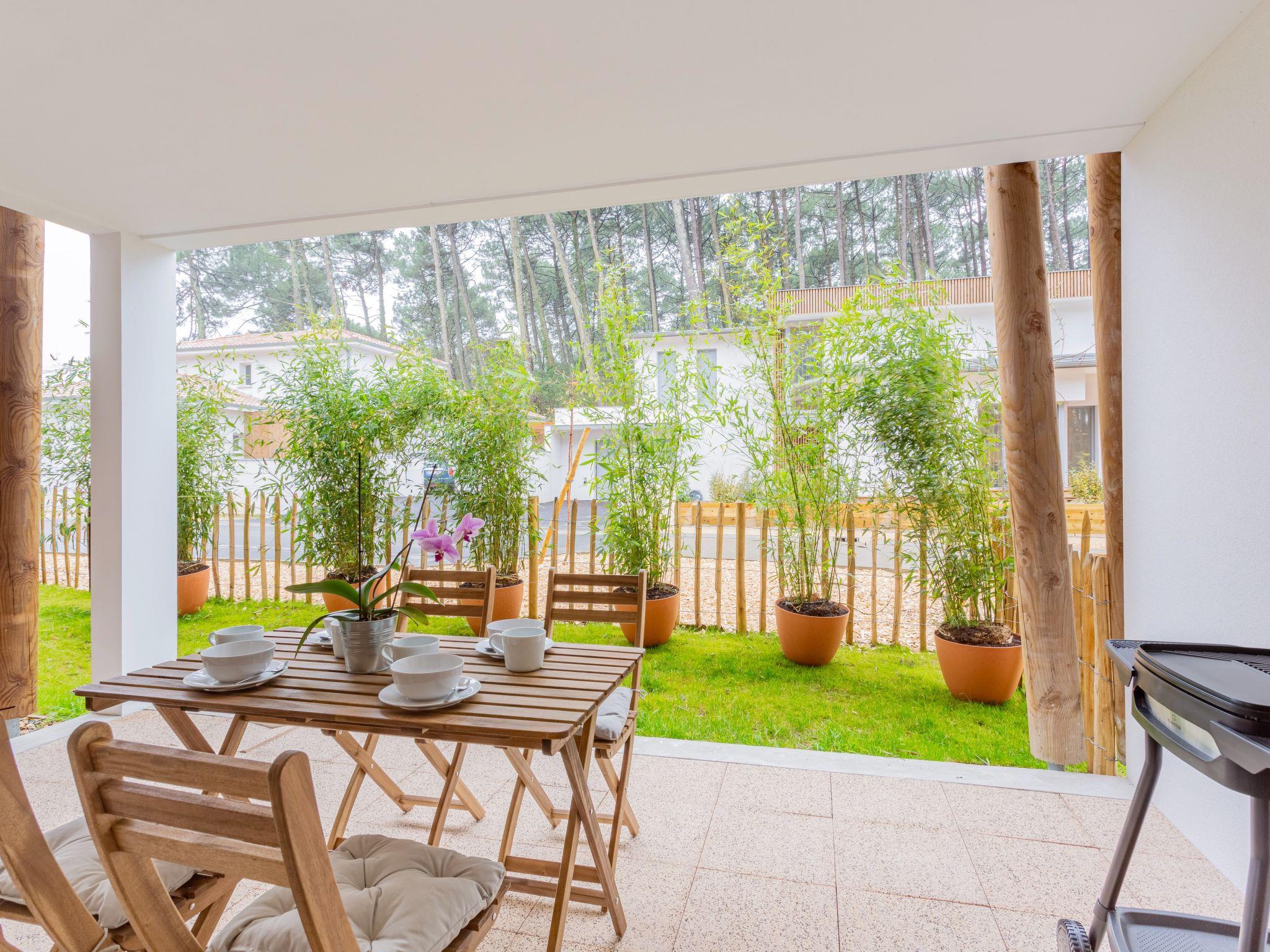 Seignosse Océan 6 km from Hossegor: Residence "Dune Blanche", built in 2021, surrounded by trees. In the resort 500 m from the centre of Seignosse Océan, in a quiet position, 300 m from the sea. Grocery 500 m, supermarket 3 km, restaurant 500 m, bar, bakery, café. Surf school 500 m. Groups of teenagers on request only. The keys‘ handover takes place by the agency hossegor 6 km.