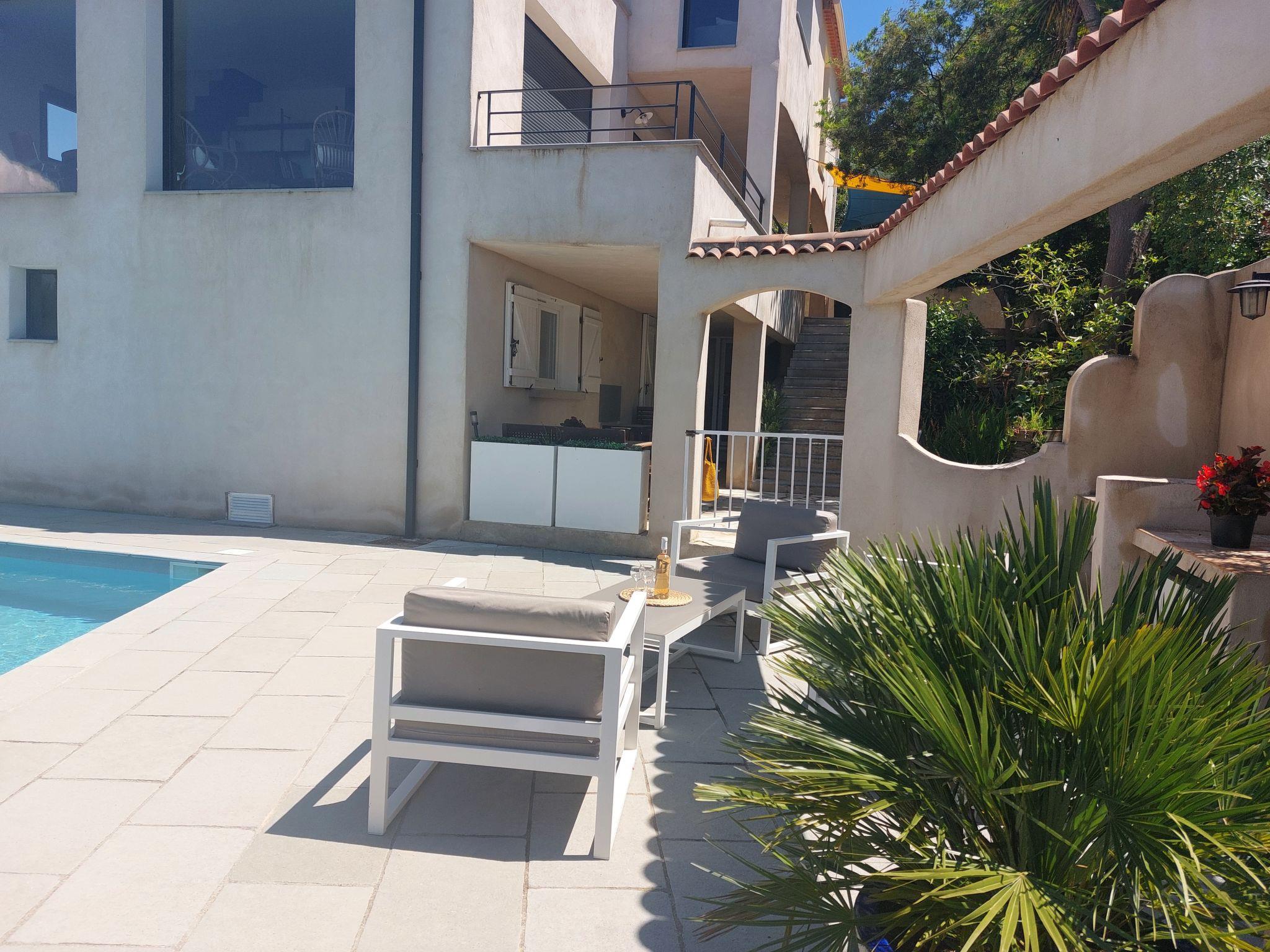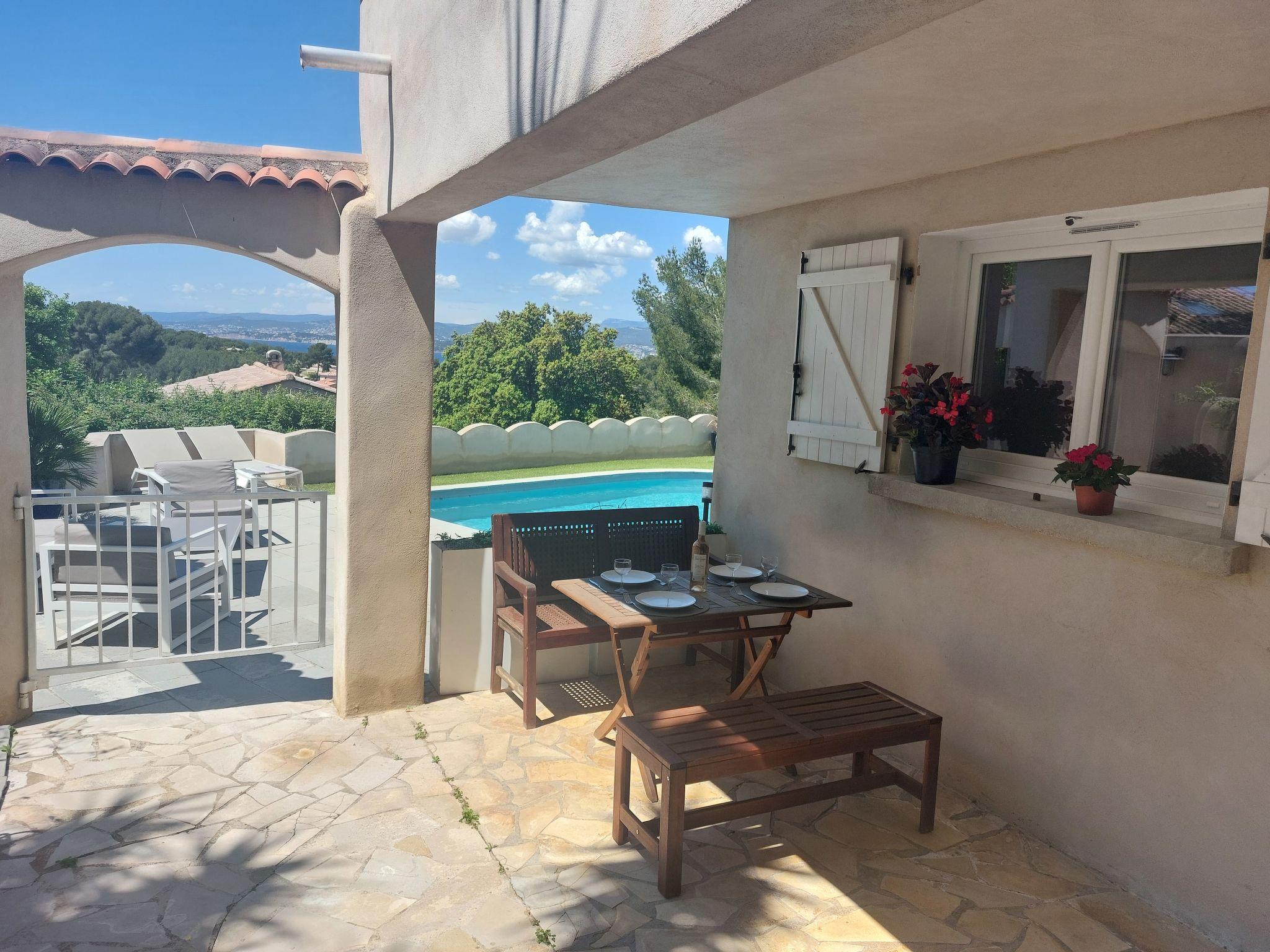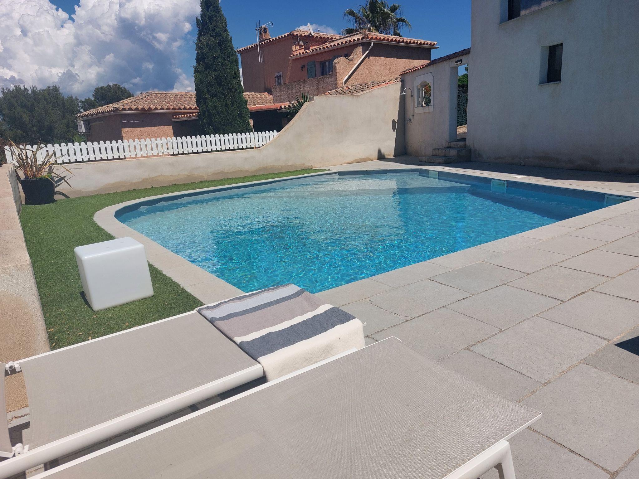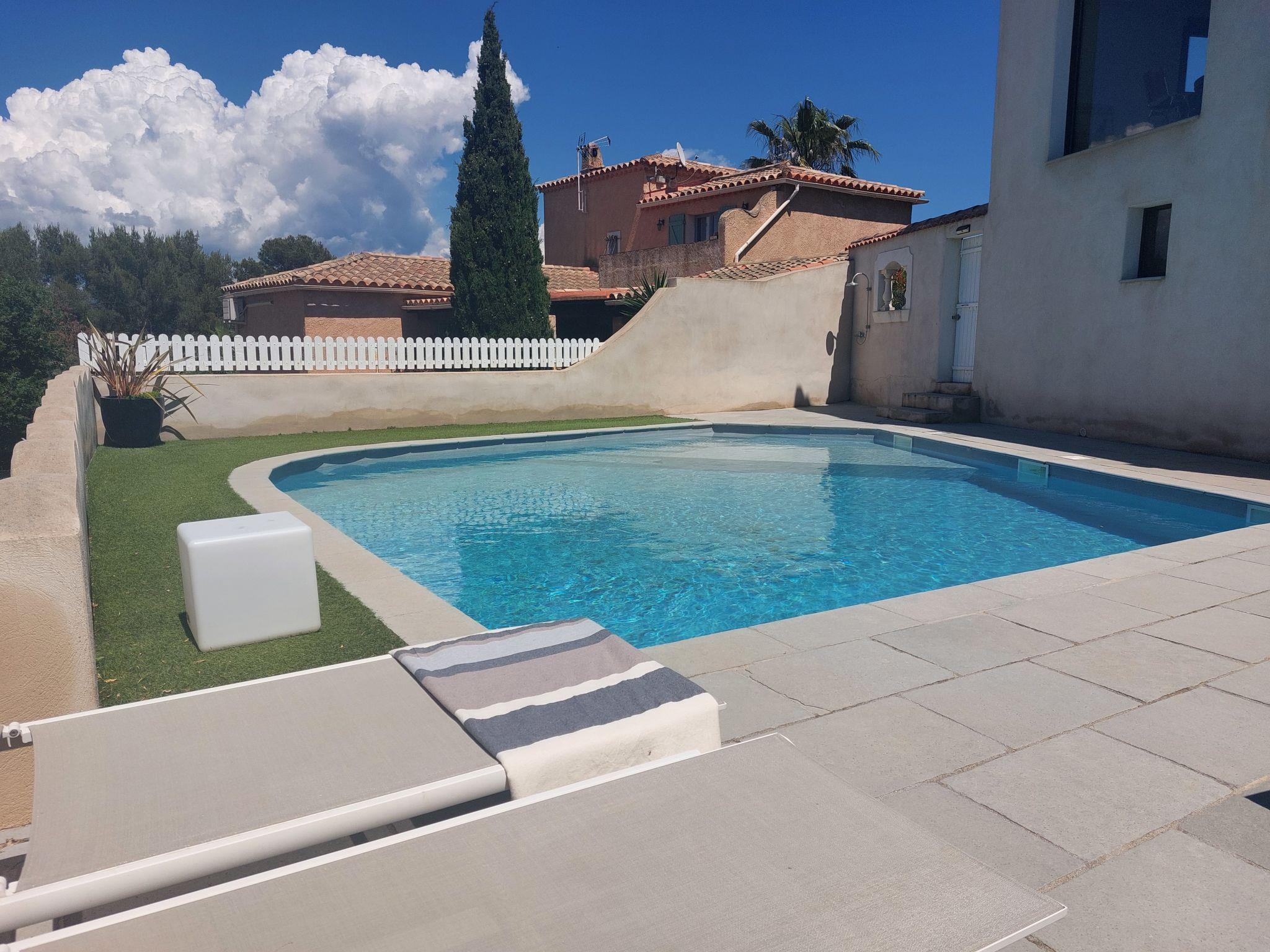 2-family house. 2.9 km from the centre of Six-Four-les-Plages, 6.4 km from the centre of Sanary sur Mer, 13.5 km from the centre of Toulon, in a quiet position in the residential district, 2 km from the sea. Private: well-kept terraced garden, 500 m2 (fenced), swimming pool fenced (5 x 5 m, depth 50 - 150 cm, seasonal availability: 01.Jan. - 31.Dec.) with alarm system. Unconventional pool shape. Parking. Grocery 2 km, supermarket 3.2 km, restaurant 2 km, bar 2 km, bakery 2 km, café 2 km, bus stop 350 m, railway station "Toulon" 13.6 km, ferry "Quai Saint Pierre Le Brusc" 2.1 km, sandy beach "Le Brusc" 2.1 km (small). Sports harbour 2.1 km, golf course (18 hole) 16 km. Nearby attractions: Iles des Embiez, Ile du Gaou, Ile de Porquerolle, Calanques de Cassis. Hiking paths: La foret de Janas, Le Faron, Evenos. Owner lives in separate semi-detached house.