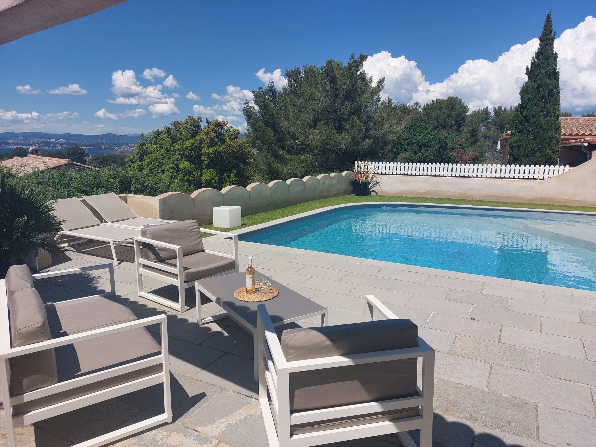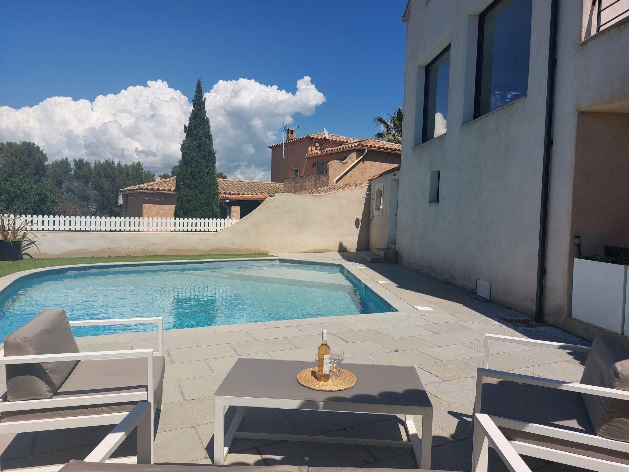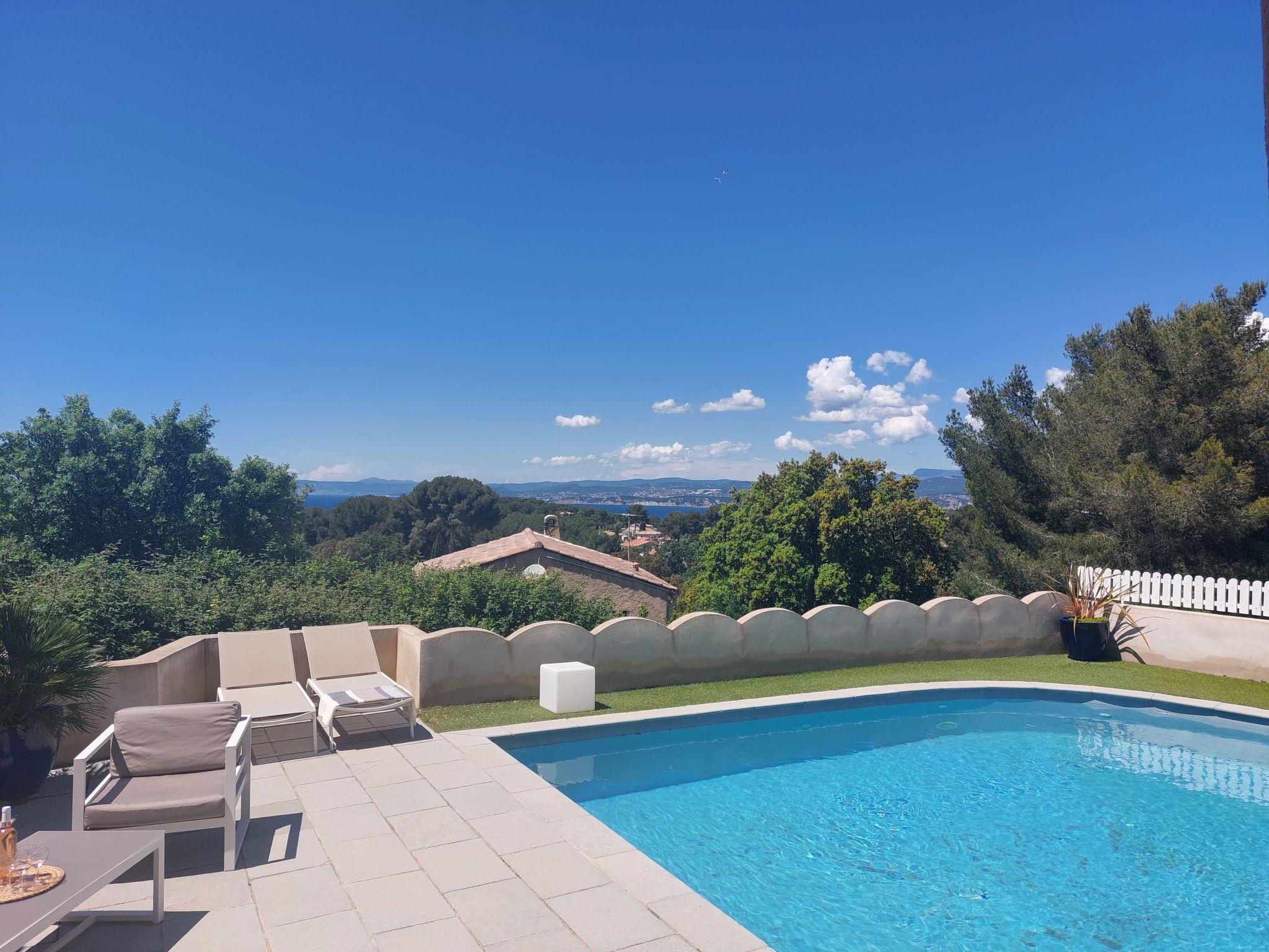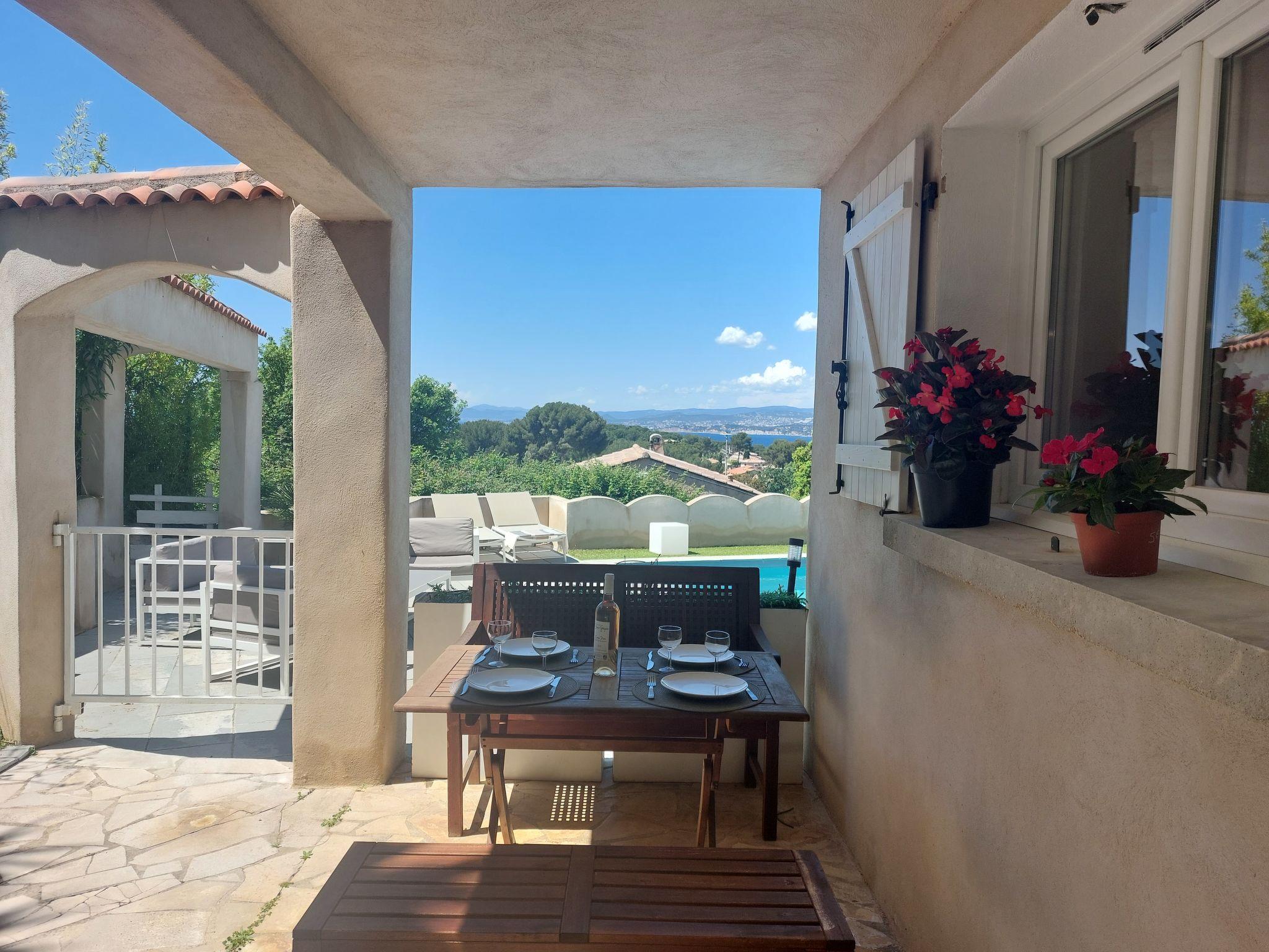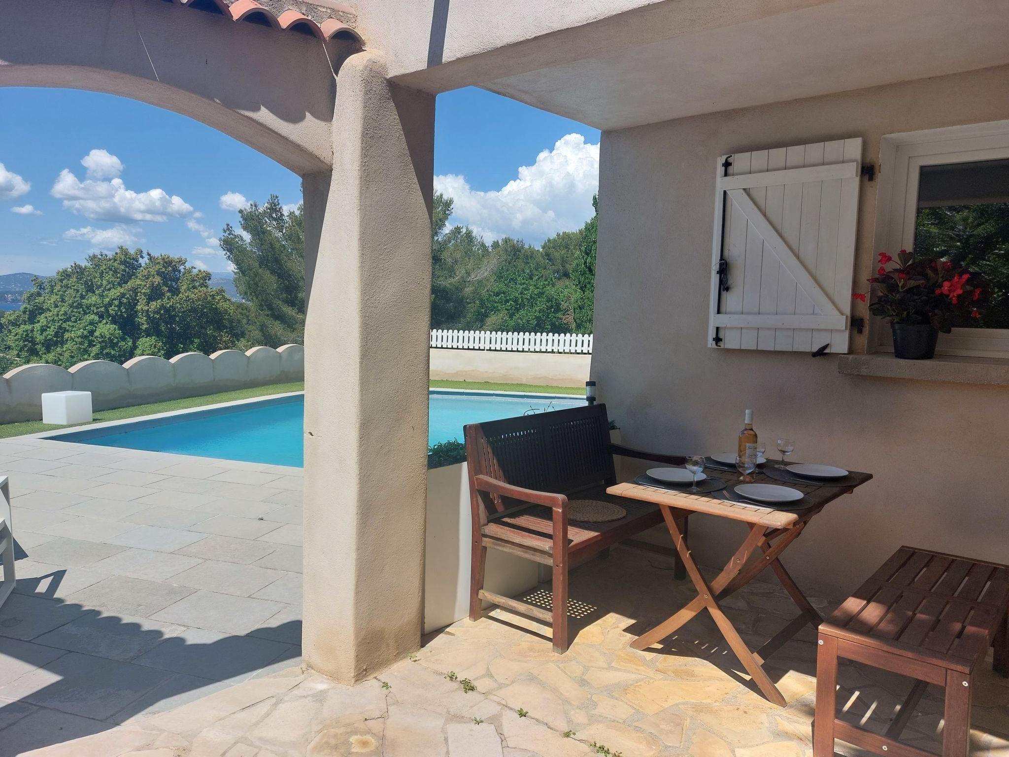 2-family house. 2.9 km from the centre of Six-Four-les-Plages, 6.4 km from the centre of Sanary sur Mer, 13.5 km from the centre of Toulon, in a quiet position in the residential district, 2 km from the sea. Private: well-kept terraced garden, 500 m2 (fenced), swimming pool fenced (5 x 5 m, depth 50 - 150 cm, seasonal availability: 01.Jan. - 31.Dec.) with alarm system. Unconventional pool shape. Parking. Grocery 2 km, supermarket 3.2 km, restaurant 2 km, bar 2 km, bakery 2 km, café 2 km, bus stop 350 m, railway station "Toulon" 13.6 km, ferry "Quai Saint Pierre Le Brusc" 2.1 km, sandy beach "Le Brusc" 2.1 km (small). Sports harbour 2.1 km, golf course (18 hole) 16 km. Nearby attractions: Iles des Embiez, Ile du Gaou, Ile de Porquerolle, Calanques de Cassis. Hiking paths: La foret de Janas, Le Faron, Evenos. Owner lives in separate semi-detached house.