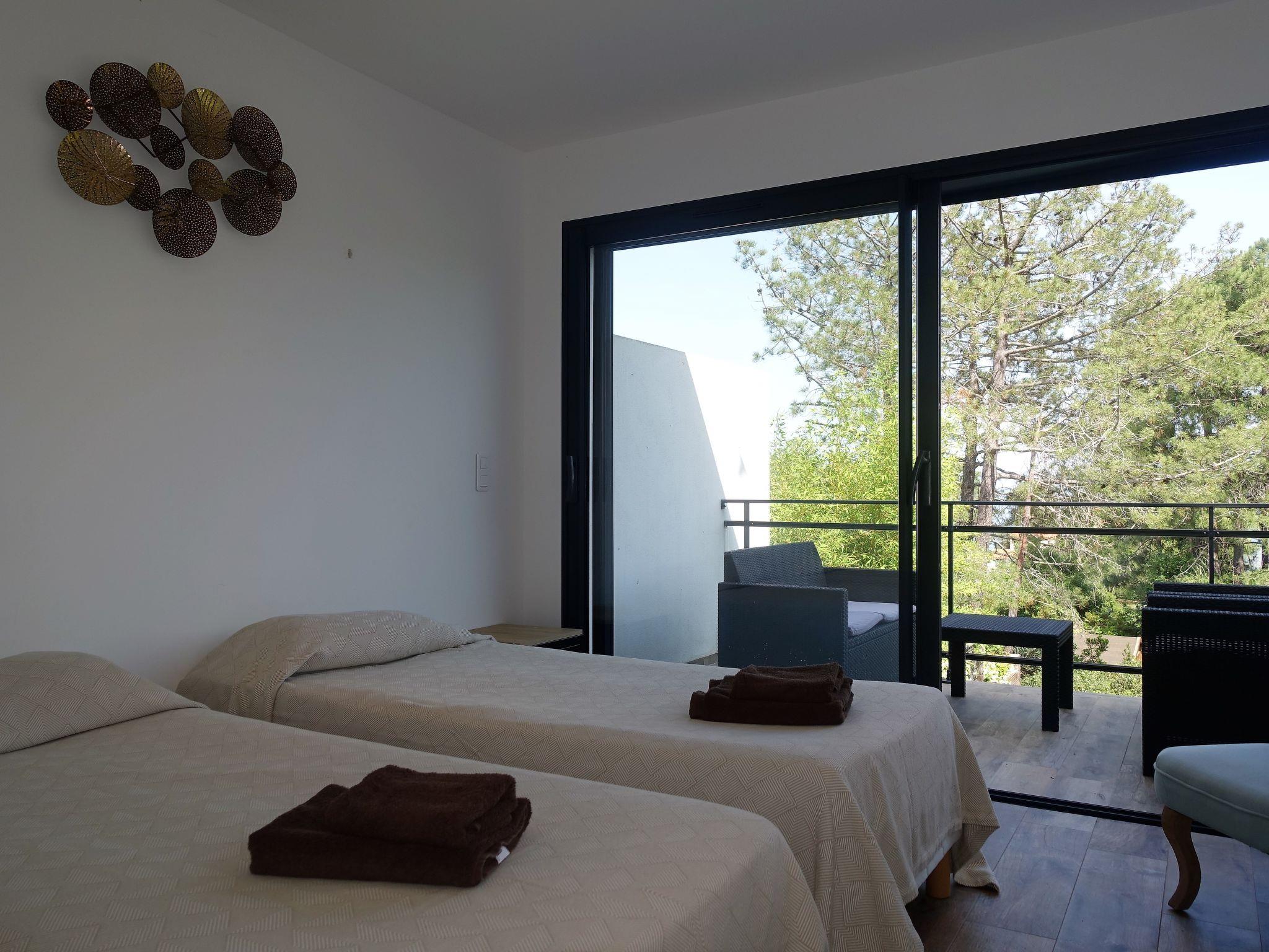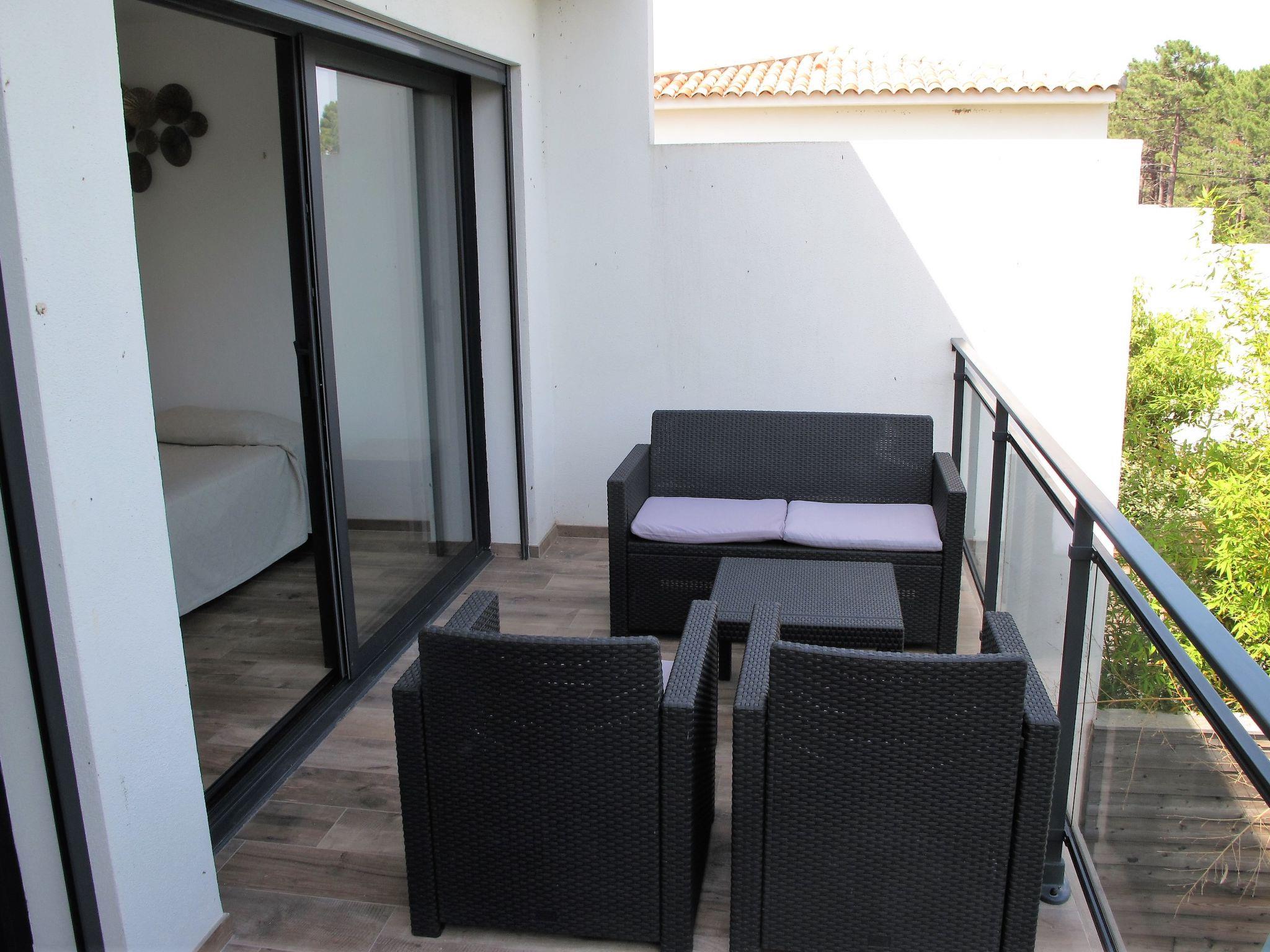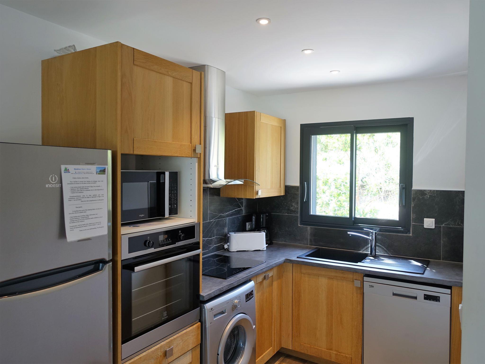 "Les Jardins d'Ève, F3", 3-room maisonette 75 m2. Object suitable for 4 adults + 2 children. Comfortable and modern furnishings: living/dining room with 1 double sofabed (160 cm, length 190 cm), TV (flat screen). Exit to the terrace, to the swimming pool. Open kitchen (oven, dishwasher, 4 induction hot plates, toaster, kettle, microwave, electric coffee machine). Sep. WC. Electric heating. Upper floor: 1 room with 1 french bed (160 cm, length 200 cm). Exit to the balcony. 1 room with 2 beds (90 cm, length 200 cm). Exit to the balcony. Bath/WC, shower/WC. Electric heating. Terrace. Terrace furniture, deck chairs (4). Beautiful view of the sea and the forest. Facilities: washing machine, safe, iron, hair dryer. Internet (WiFi, extra). Parking at the house. Please note: maximum 1 pet/ dog allowed. Smoke alarm. Offer by a commercial proprietor according to Art. 155, IV, CGI