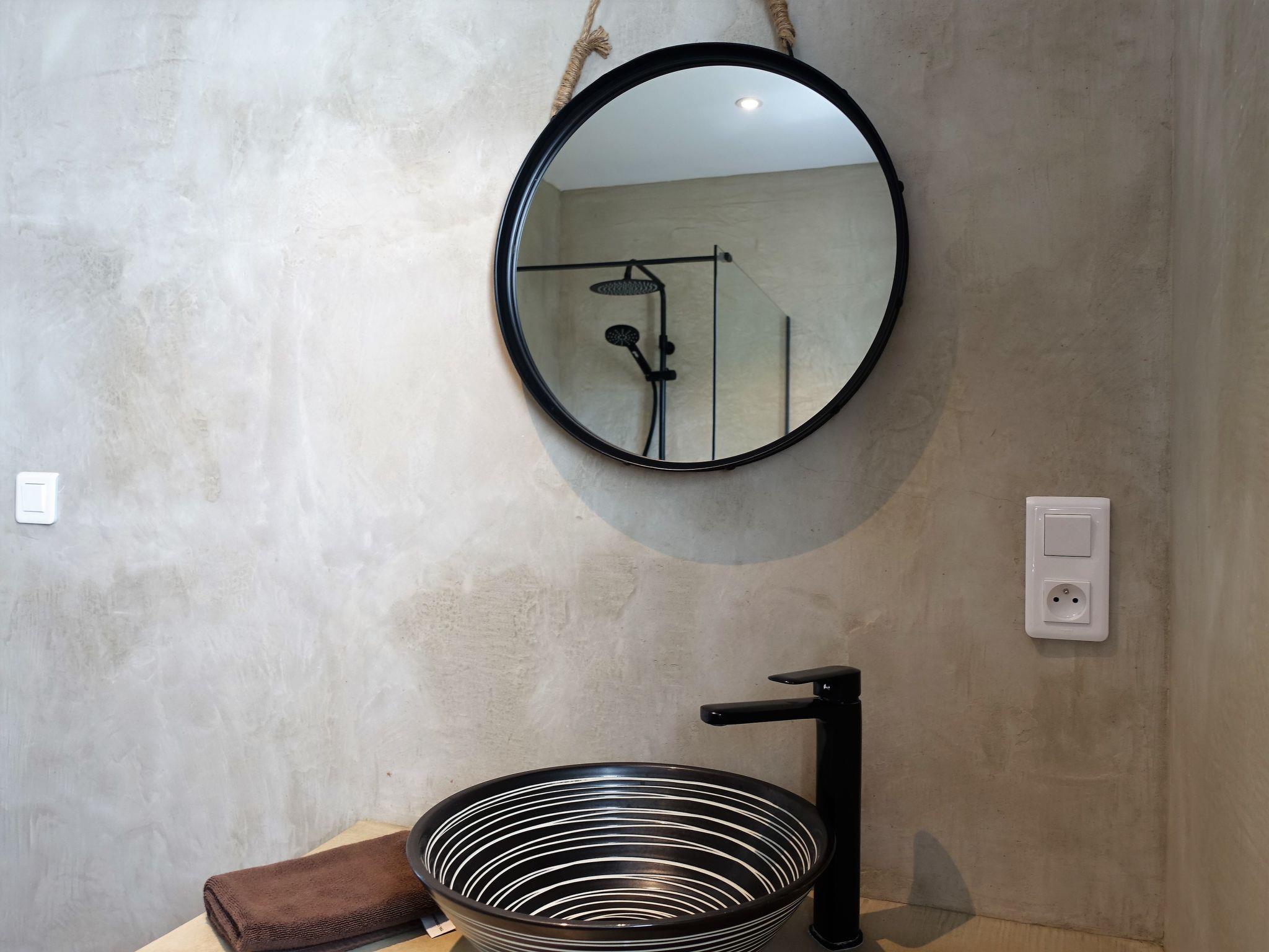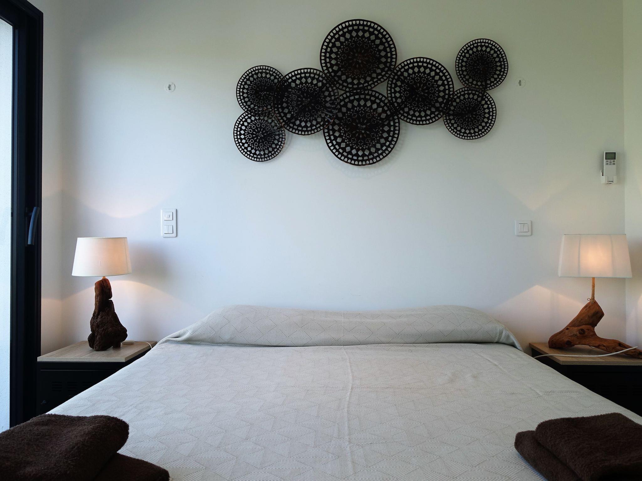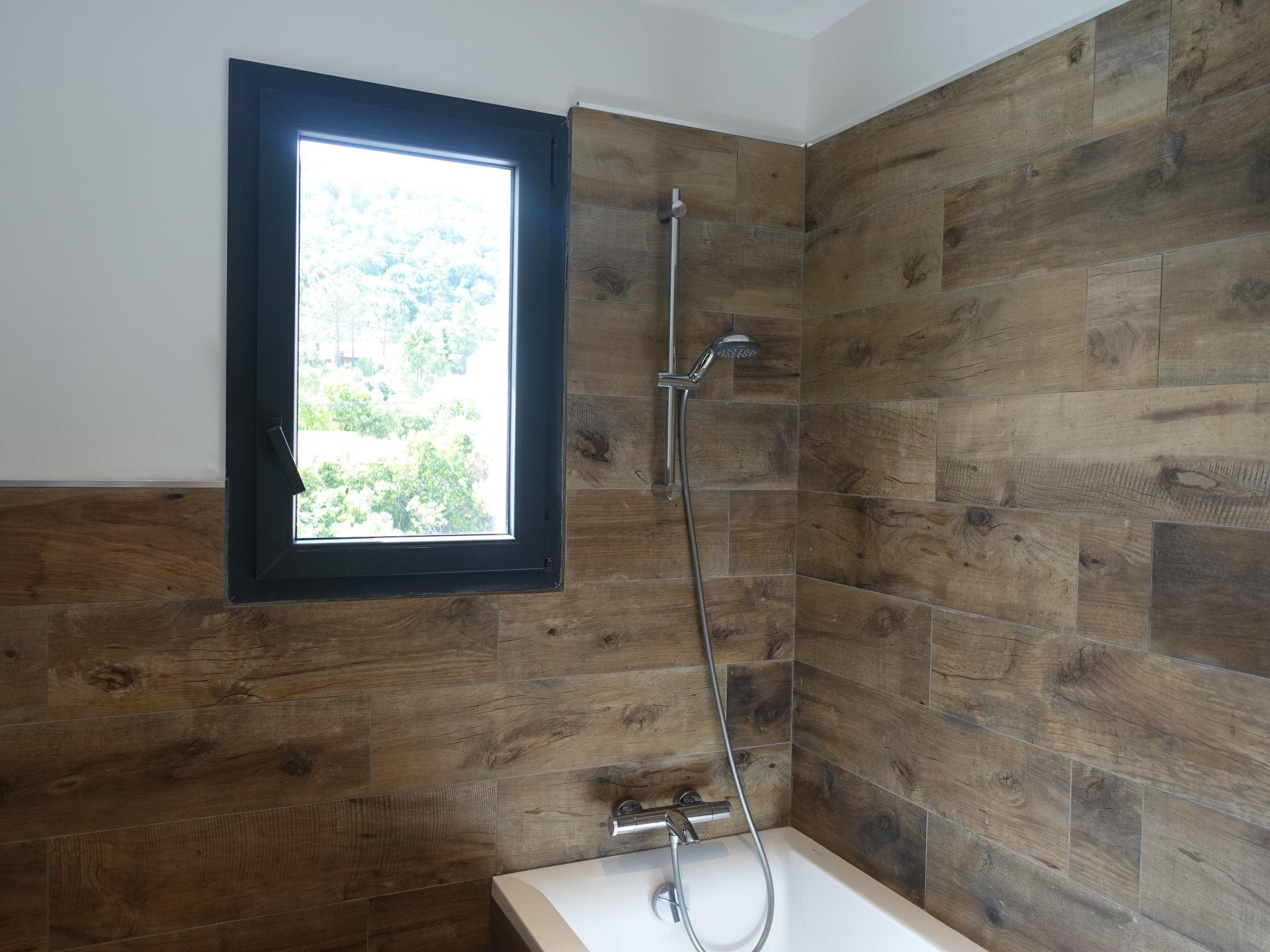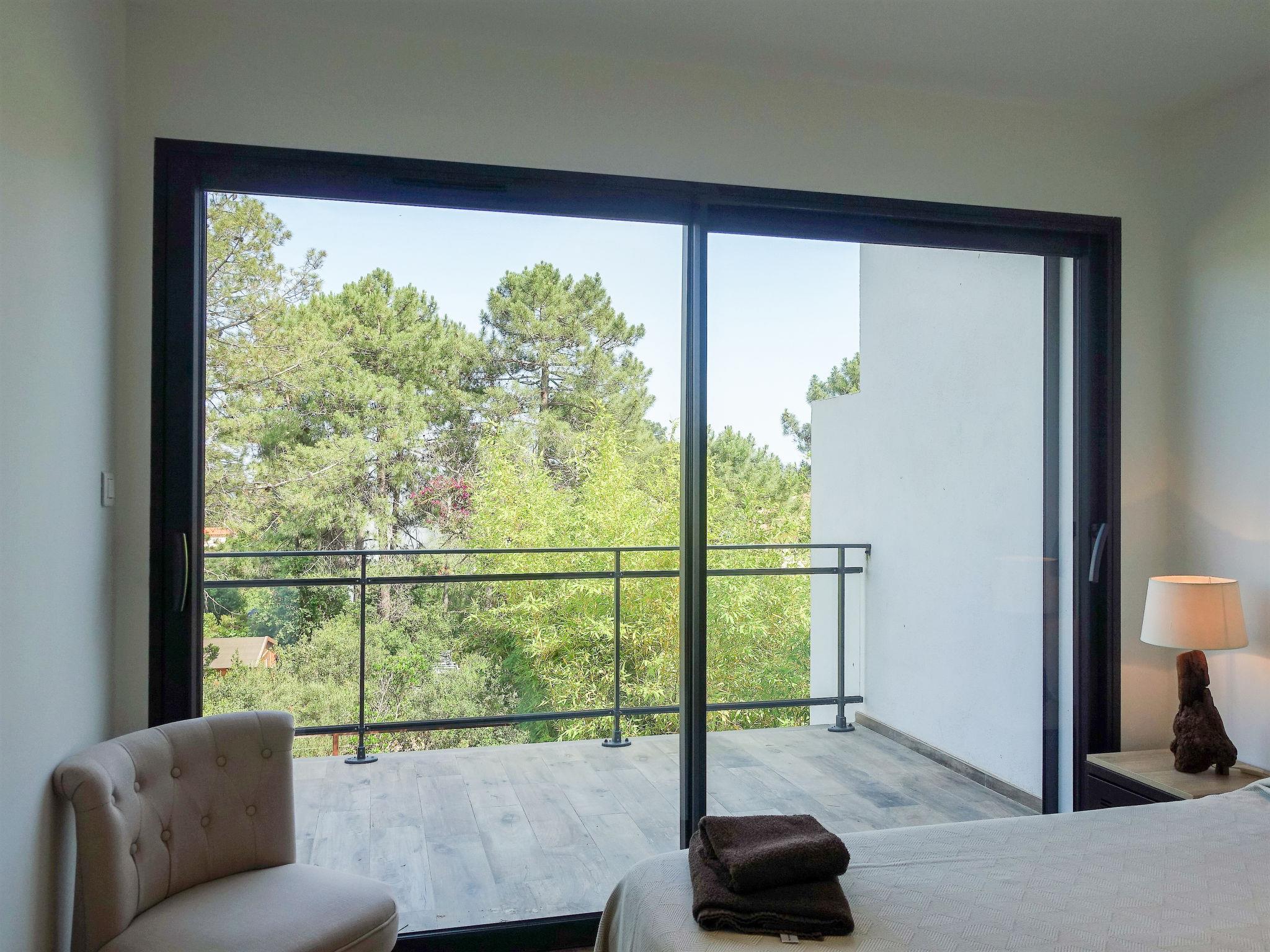 "Les Jardins d'Ève, F3", 3-room maisonette 75 m2. Object suitable for 4 adults + 2 children. Comfortable and modern furnishings: living/dining room with 1 double sofabed (160 cm, length 190 cm), TV (flat screen). Exit to the terrace, to the swimming pool. Open kitchen (oven, dishwasher, 4 induction hot plates, toaster, kettle, microwave, electric coffee machine). Sep. WC. Electric heating. Upper floor: 1 room with 1 french bed (160 cm, length 200 cm). Exit to the balcony. 1 room with 2 beds (90 cm, length 200 cm). Exit to the balcony. Bath/WC, shower/WC. Electric heating. Terrace. Terrace furniture, deck chairs (4). Beautiful view of the sea and the forest. Facilities: washing machine, safe, iron, hair dryer. Internet (WiFi, extra). Parking at the house. Please note: maximum 1 pet/ dog allowed. Smoke alarm. Offer by a commercial proprietor according to Art. 155, IV, CGI