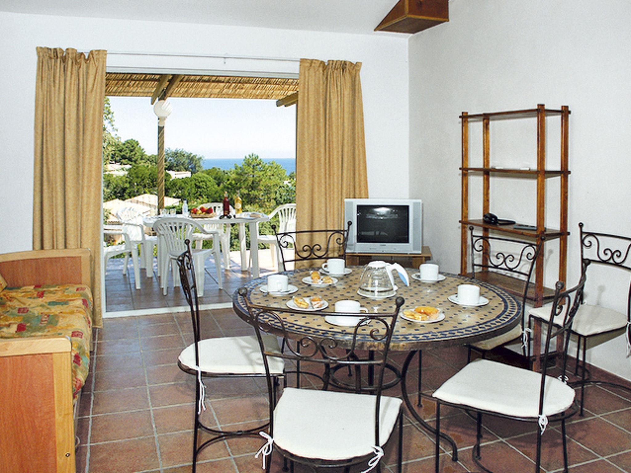 Ossibility of breakfast at the reception bar. Pets are not allowed in the pool and bar area. Beautiful resort "Mare e Monte", surrounded by trees. 30 houses in the residence. 9 km from the centre of Solenzara, 33 km from the centre of Porto Vecchio, 105 km from the centre of Bastia, in a sunny position on a slope, 300 m from the sea, 300 m from the beach, direct access to the beach, in the countryside. For shared use: natural state property, terraced garden, swimming pool fenced (120 m2, seasonal availability: 09.Apr. - 29.Oct.). WC in the pool area, table tennis, boccia, children's playground. In the complex: reception, bar, lounge with TV, WiFi. Bread roll service and breakfast (extra). Parking on the premises. Shop 1.5 km, supermarket 8 km, restaurant 1.9 km, bus stop 9 km, sandy beach "Baie de Canella" 900 m, rocky beach 300 m. Sports harbour 9.4 km. Nearby attractions: Solenzara 9 km, Porto-Vecchio 30 km, Bonifacio 58 km. Hiking paths: Aiguilles de Bavella 39 km. Please note: car recommended. The photograph shows a typical example.
