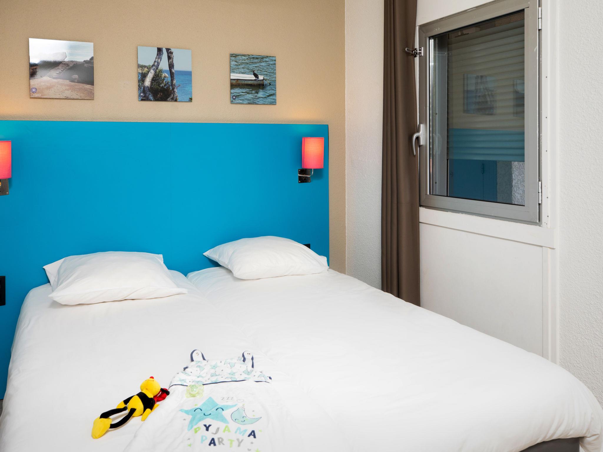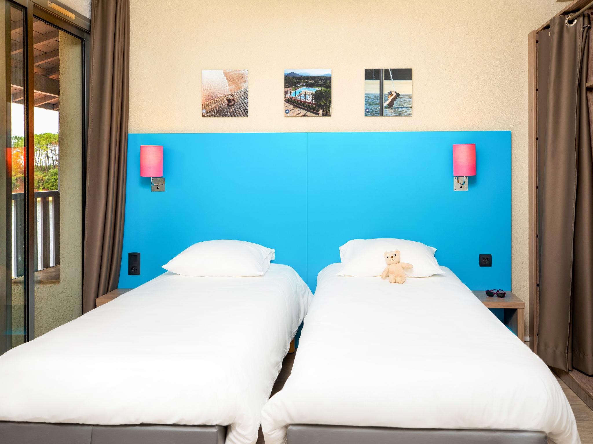 "Sowell Family Pignada Plage", 3-room apartment 42 to 52 m2. Beautiful and cosy furnishings: living/sleeping room with 1 double sofabed, dining table and TV. Exit to the balcony, to the terrace. 1 room with 2 beds (80 cm). 1 room with 2 sleeping facilities (2 x 80 cm). Open kitchen (dishwasher, 2 ceramic glass hob hotplates, toaster, kettle, freezer, electric coffee machine, combination microwave). Shower, sep. WC. Electric heating. Balcony or terrace. View of the lake. Facilities: safe. Internet (WiFi, free). Maximum 1 pet/ dog allowed. Offer by a private individual according to Art. 155, IV of CGI. 36863708/8763169
