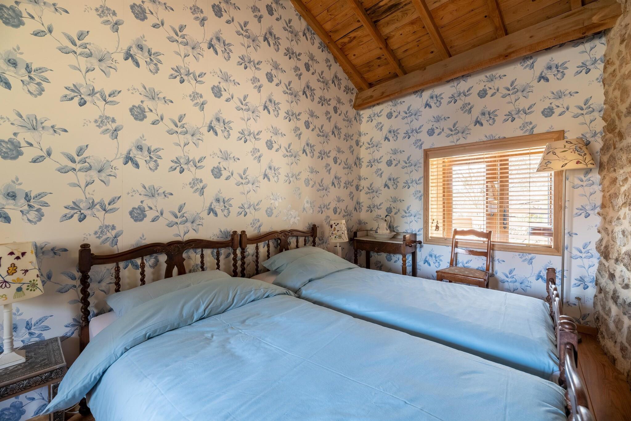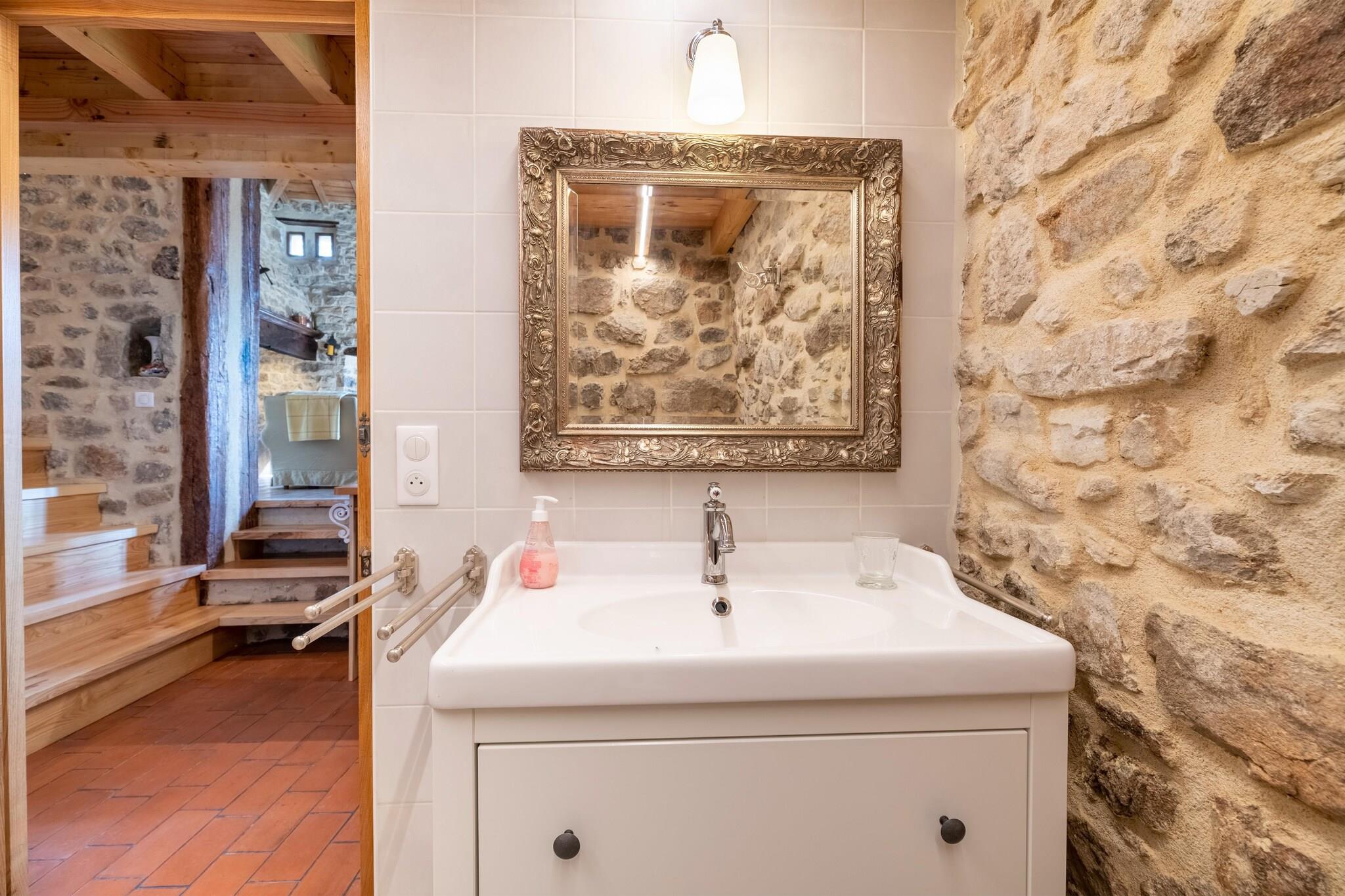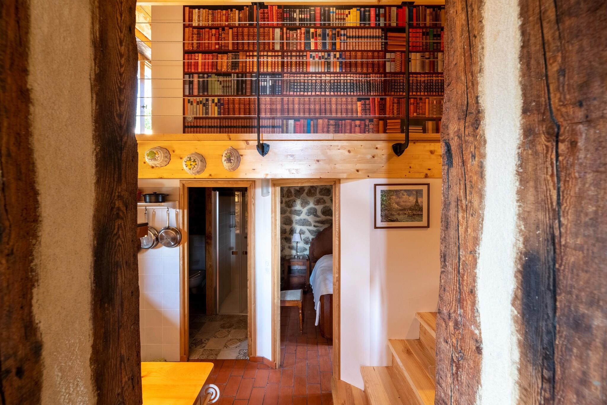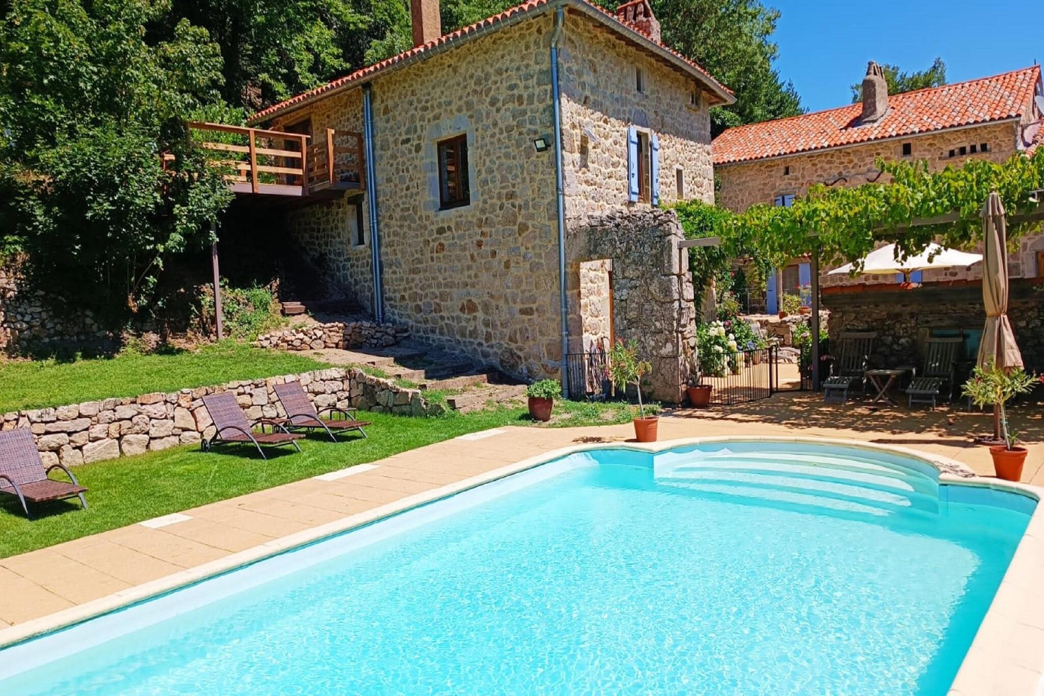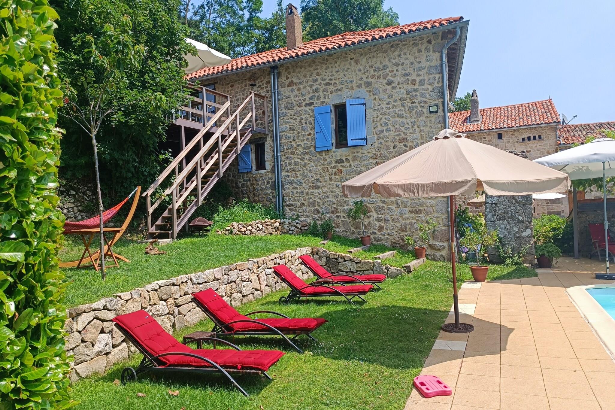 This beautiful holiday home (the 'high house') is located on the same piece of land as the owner's house (the 'big house'). Collectively they are called Les Brus de l'Adret and have their origins in the 14th century. Since then, the buildings have been carefully restored with an eye for the authentic elements such as the granite walls, oak floors, a custom kitchen and a huge fireplace. The holiday home is located in the north of the Ardèche and is very suitable for holidays with family or friends. The house is located on a large property with chestnut and acacia trees, surrounded by forests and meadows. You can enjoy walking and in the center, which is 5 km away, you will find several nice shops and restaurants. The house is located on a very quiet road, in a beautiful wooded area at an altitude of 750 m and with the famous 11th-century Chateau de Maisonseule at the rear. You share the swimming pool with the friendly owner couple. You will almost always have the pool to yourself. The saltwater pool is a little further behind the studio and you will also find a romantic terrace with a pergola covered with grapes. Over the centuries it has served as a farm and as the home of the grandparents. The private terrace offers a beautiful view of the pool. The other residence, the main house, is occupied by the owner of the property.