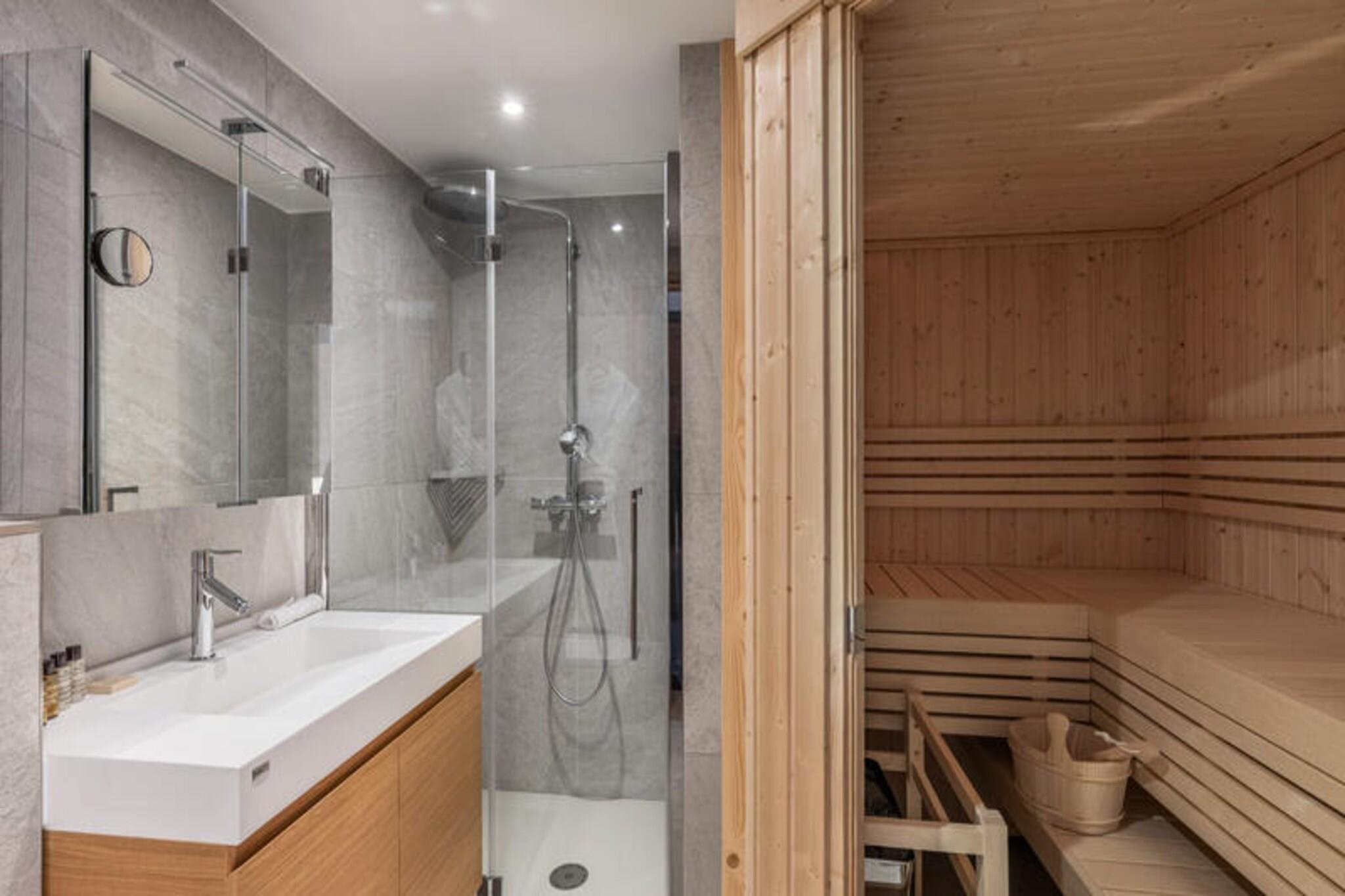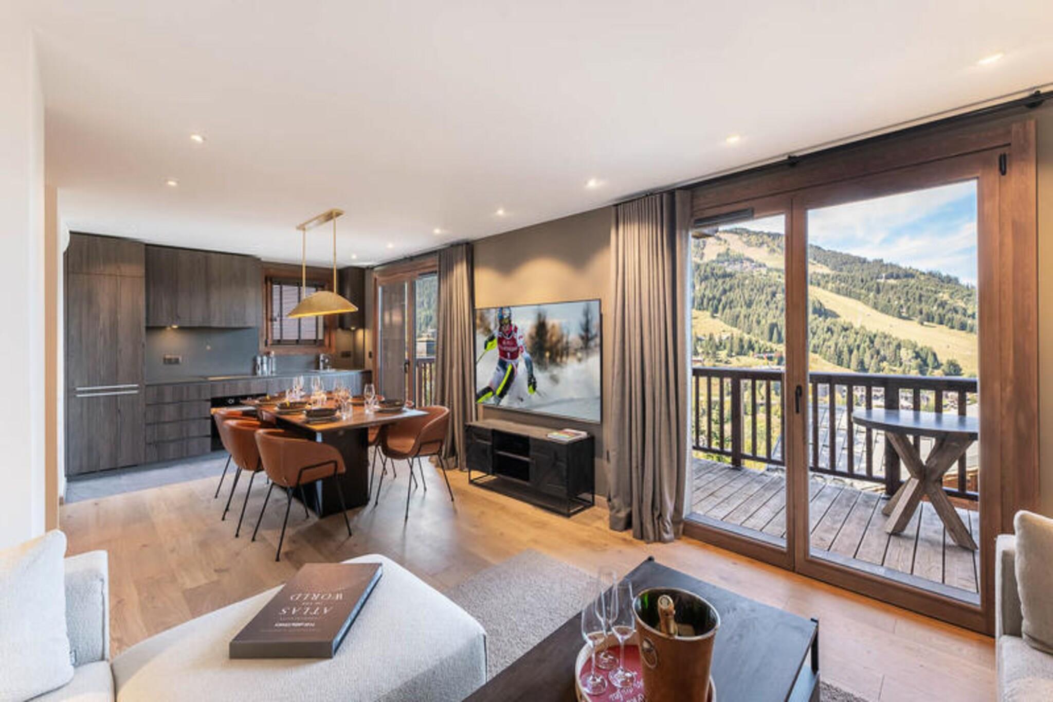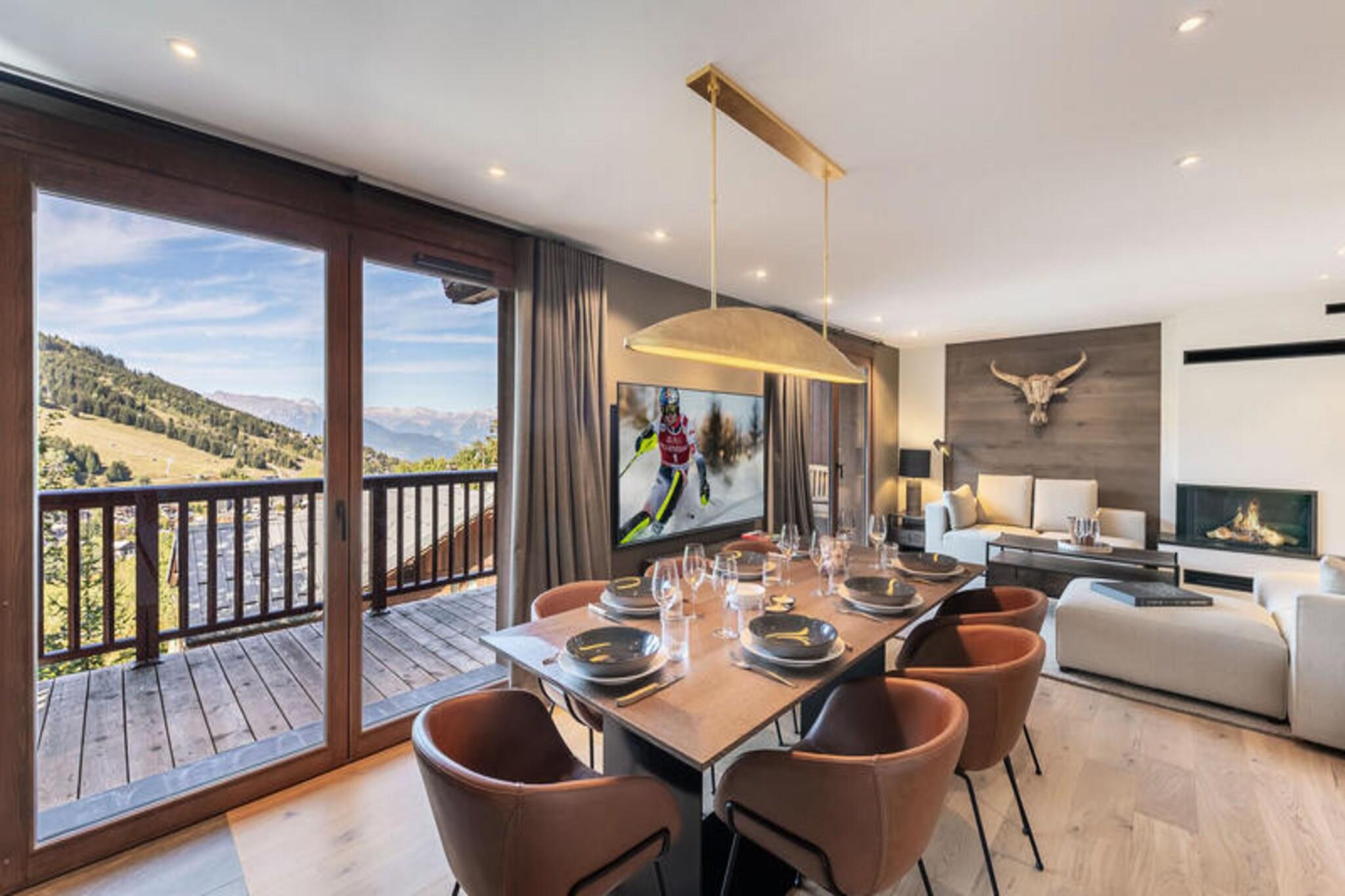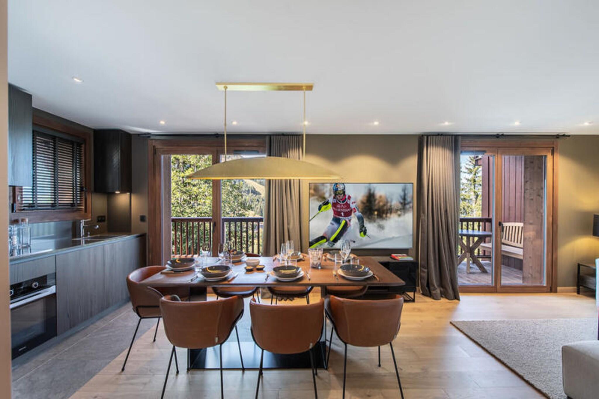 This luxurious 100m² apartment, located in a two-unit chalet, comfortably accommodates up to 7 people across 3 bedrooms. Two of the bedrooms are en-suite, including one with a double bed (180x200) and another with a set of bunk beds and a pull-out bed. The apartment is non-smoking and does not allow pets. Additional features include a TV lounge with a gas fireplace and a sauna for four people, perfect for unwinding after a day on the slopes. Located just 400 meters from the Ariondaz gondola, this apartment offers direct access to the 3 Valleys ski area, renowned for its extensive and varied slopes. Courchevel Moriond’s shops, restaurants, and the French Ski School are also within easy reach, ensuring that all your needs are met while enjoying the serene surroundings of the Glaciers area. The apartment features an open, fully equipped kitchen with two refrigerators, an oven, a dishwasher, and a microwave. The dining area can seat up to 10 guests, and the property includes a ski locker with a boot dryer for 10 pairs of boots. For added convenience, the apartment includes a washing machine and dryer, and a cellar for additional storage.