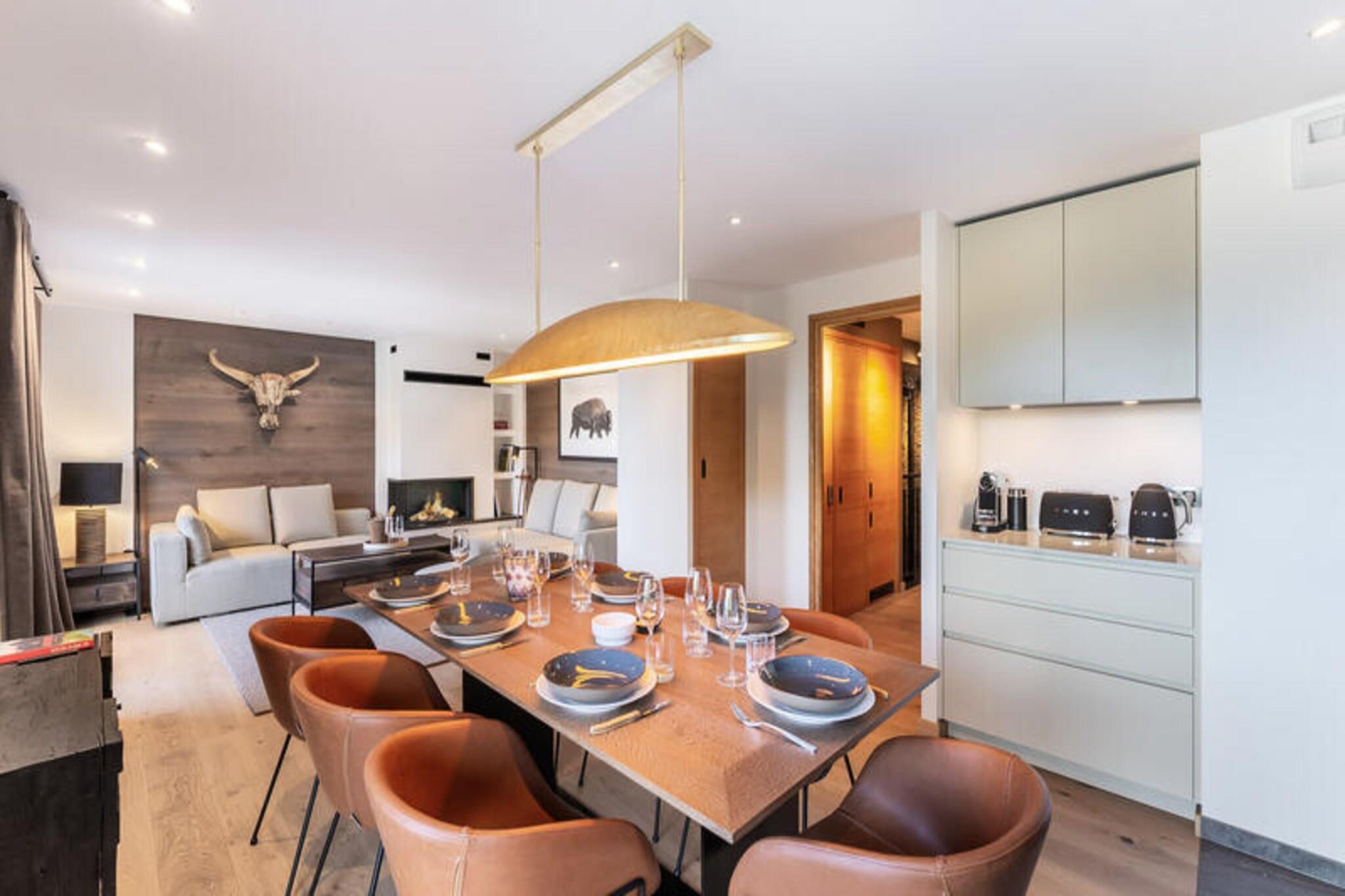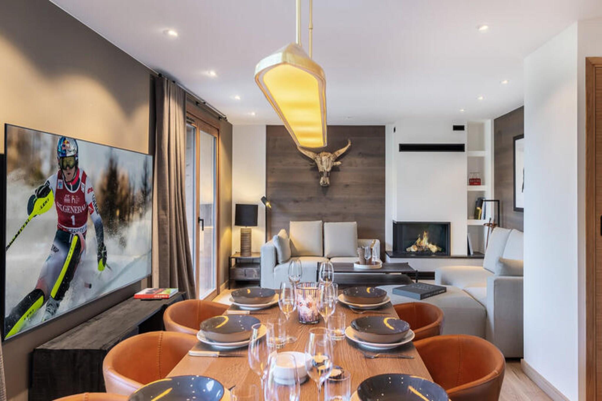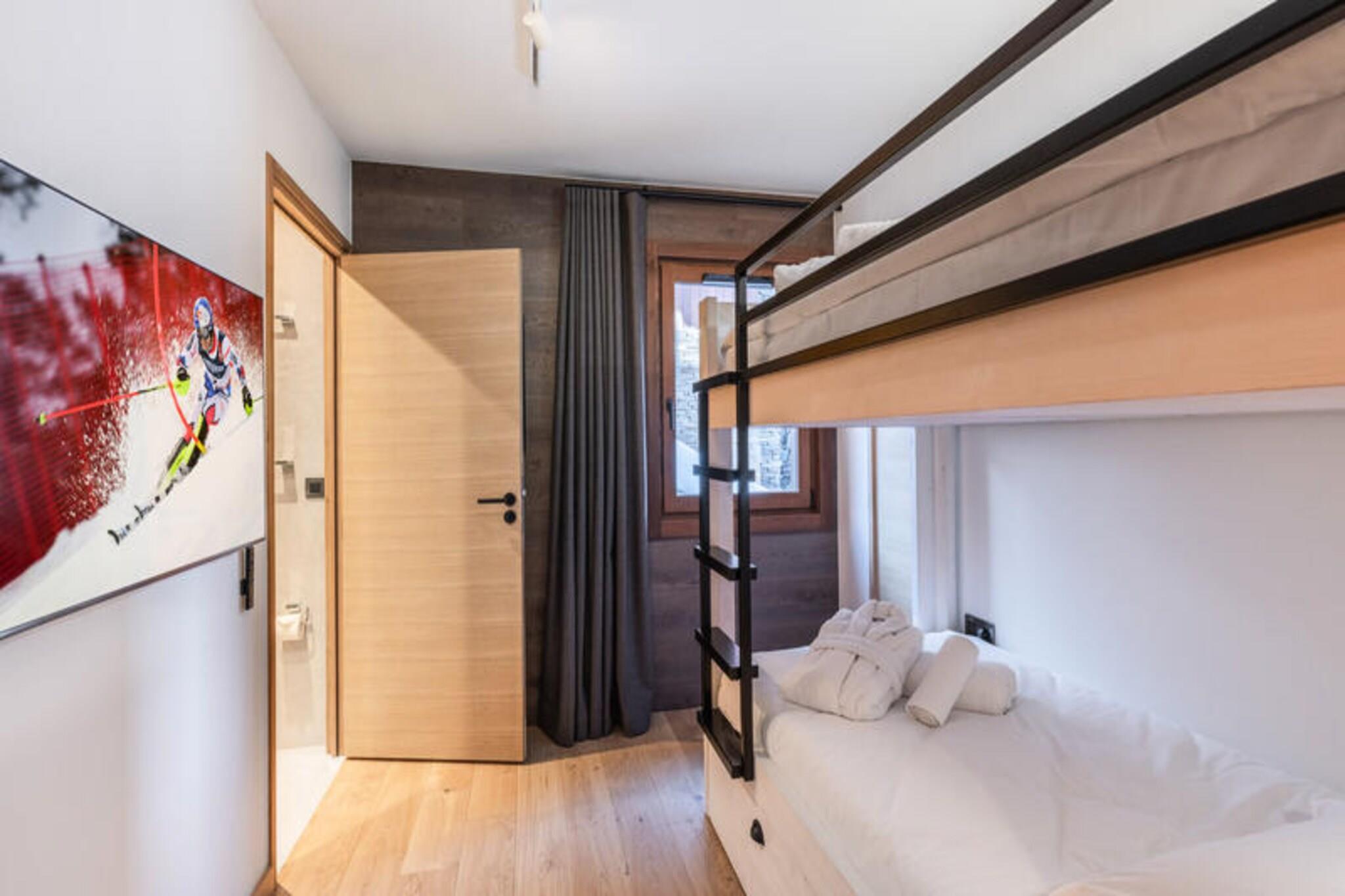 This luxurious 100m² apartment, located in a two-unit chalet, comfortably accommodates up to 7 people across 3 bedrooms. Two of the bedrooms are en-suite, including one with a double bed (180x200) and another with a set of bunk beds and a pull-out bed. The apartment is non-smoking and does not allow pets. Additional features include a TV lounge with a gas fireplace and a sauna for four people, perfect for unwinding after a day on the slopes. Located just 400 meters from the Ariondaz gondola, this apartment offers direct access to the 3 Valleys ski area, renowned for its extensive and varied slopes. Courchevel Moriond’s shops, restaurants, and the French Ski School are also within easy reach, ensuring that all your needs are met while enjoying the serene surroundings of the Glaciers area. The apartment features an open, fully equipped kitchen with two refrigerators, an oven, a dishwasher, and a microwave. The dining area can seat up to 10 guests, and the property includes a ski locker with a boot dryer for 10 pairs of boots. For added convenience, the apartment includes a washing machine and dryer, and a cellar for additional storage.