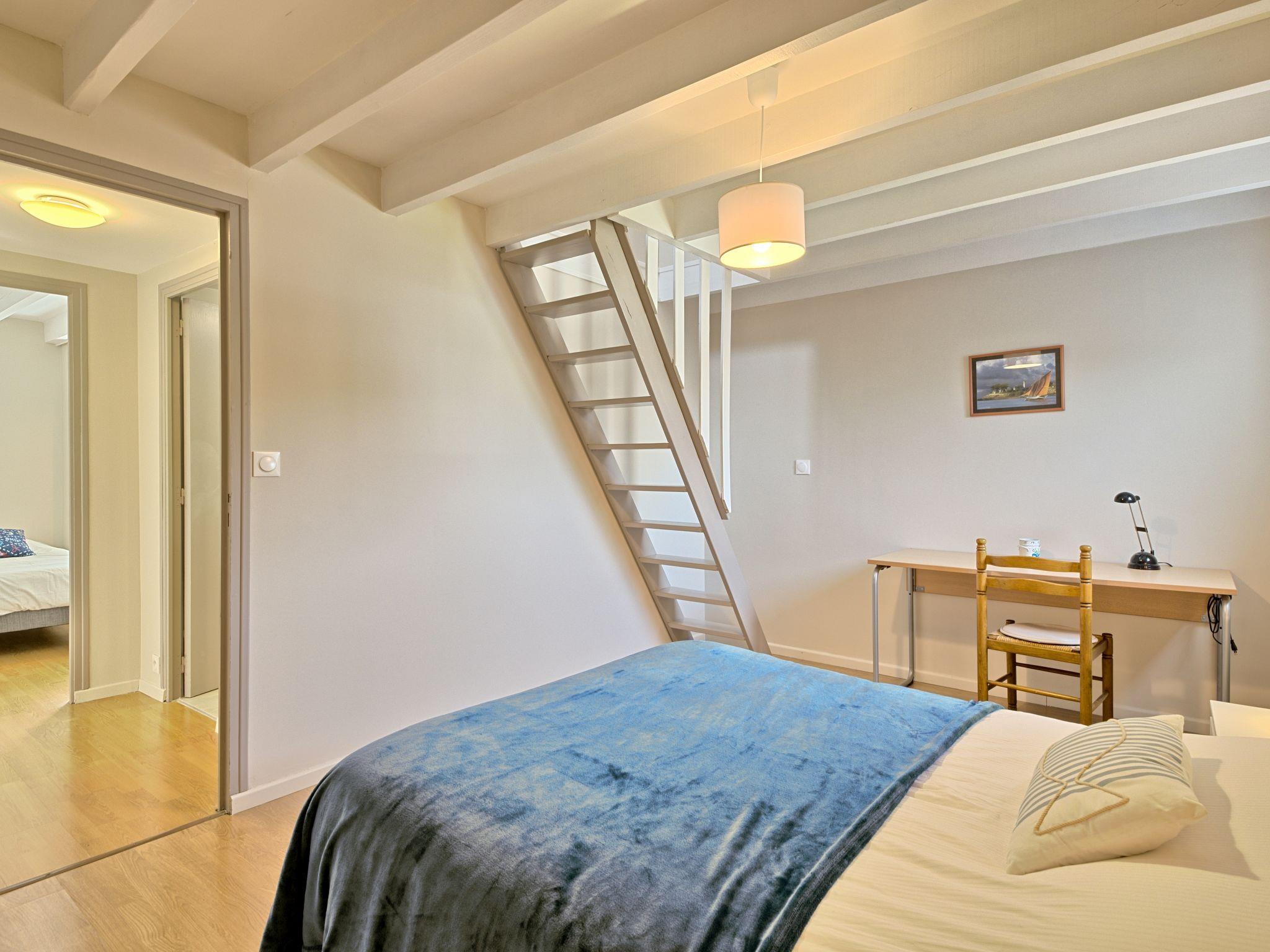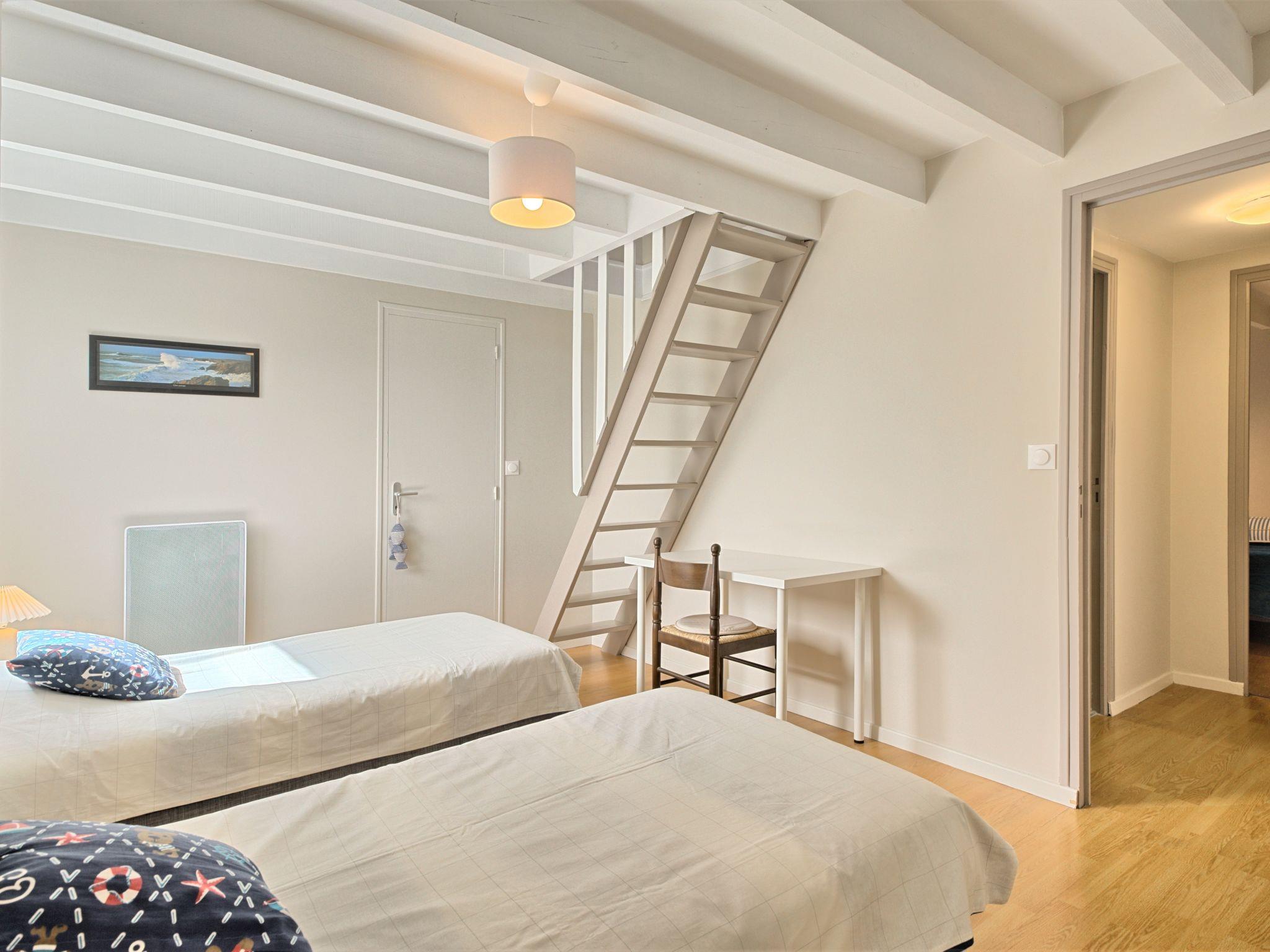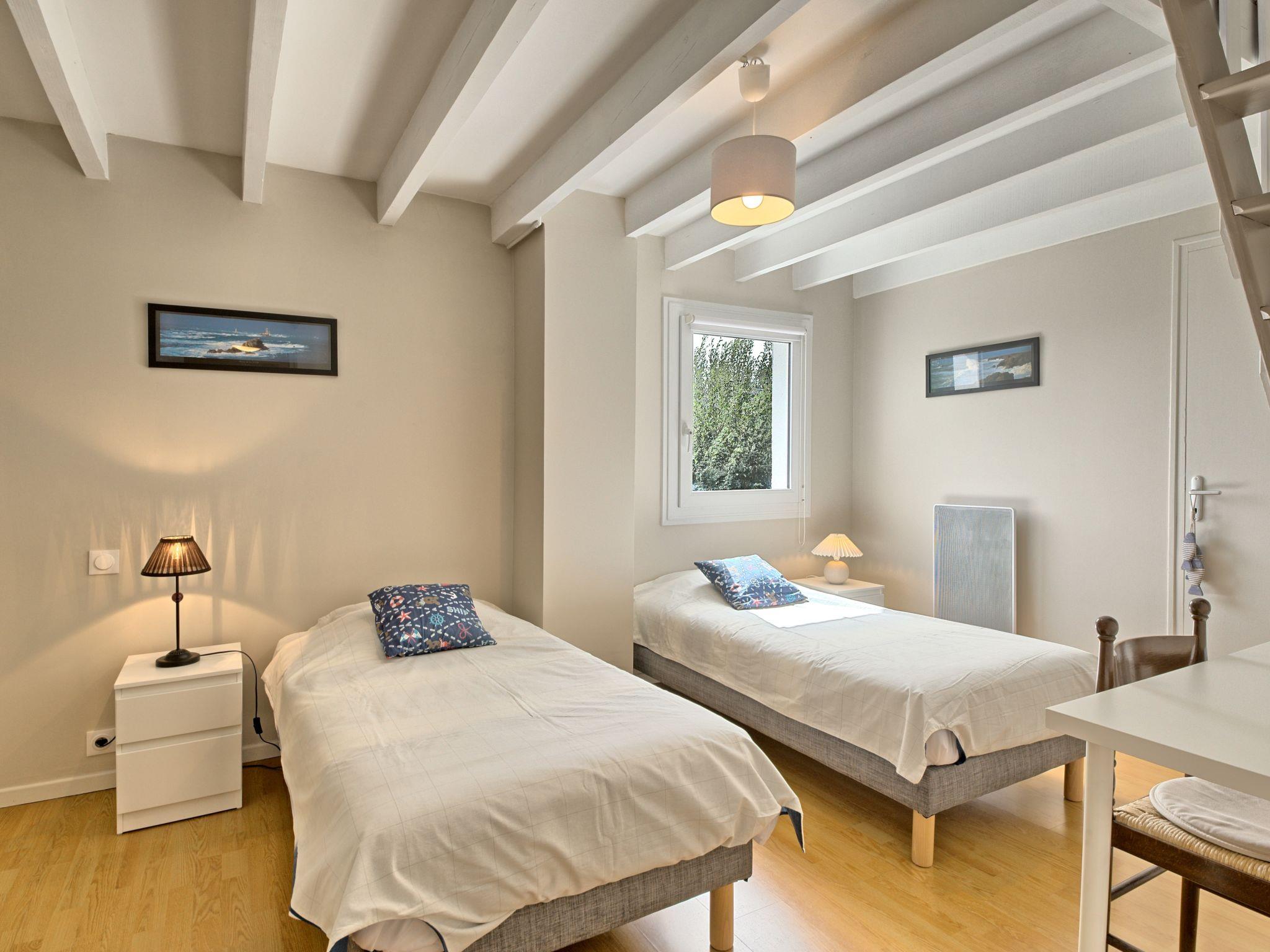 4-room house 86 m2 on 2 levels. Fully renovated in 2022, beautiful furnishings: living/dining room with TV (flat screen). Exit to the terrace. 1 room with 1 french bed (140 cm, length 190 cm), shower. Open kitchen (oven, dishwasher, 3 induction hot plates, toaster, kettle, microwave, freezer, electric coffee machine, Capsules for coffee machine (NESPRESSO) extra). Sep. WC. Upper floor: 1 room with 1 double bed (2 x 80 cm, length 200 cm). 1 room with 2 beds (90 cm, length 190 cm). Shower, sep. WC. Electric heating. 2 terraces 40 m2, south facing position and west facing position terrace 20 m2, east facing position. Terrace furniture, electric barbecue, deck chairs (4). Facilities: washing machine, dryer, iron, children's high chair, baby cot. Internet (WiFi, free). Please note: non-smoking house. Smoke alarm. Note: The 2 bedrooms upstairs each have a relaxation area on the mezzanine (access by a steep staircase). Offer by a private individual according to Art. 155, IV of CGI. 56214000073R7
