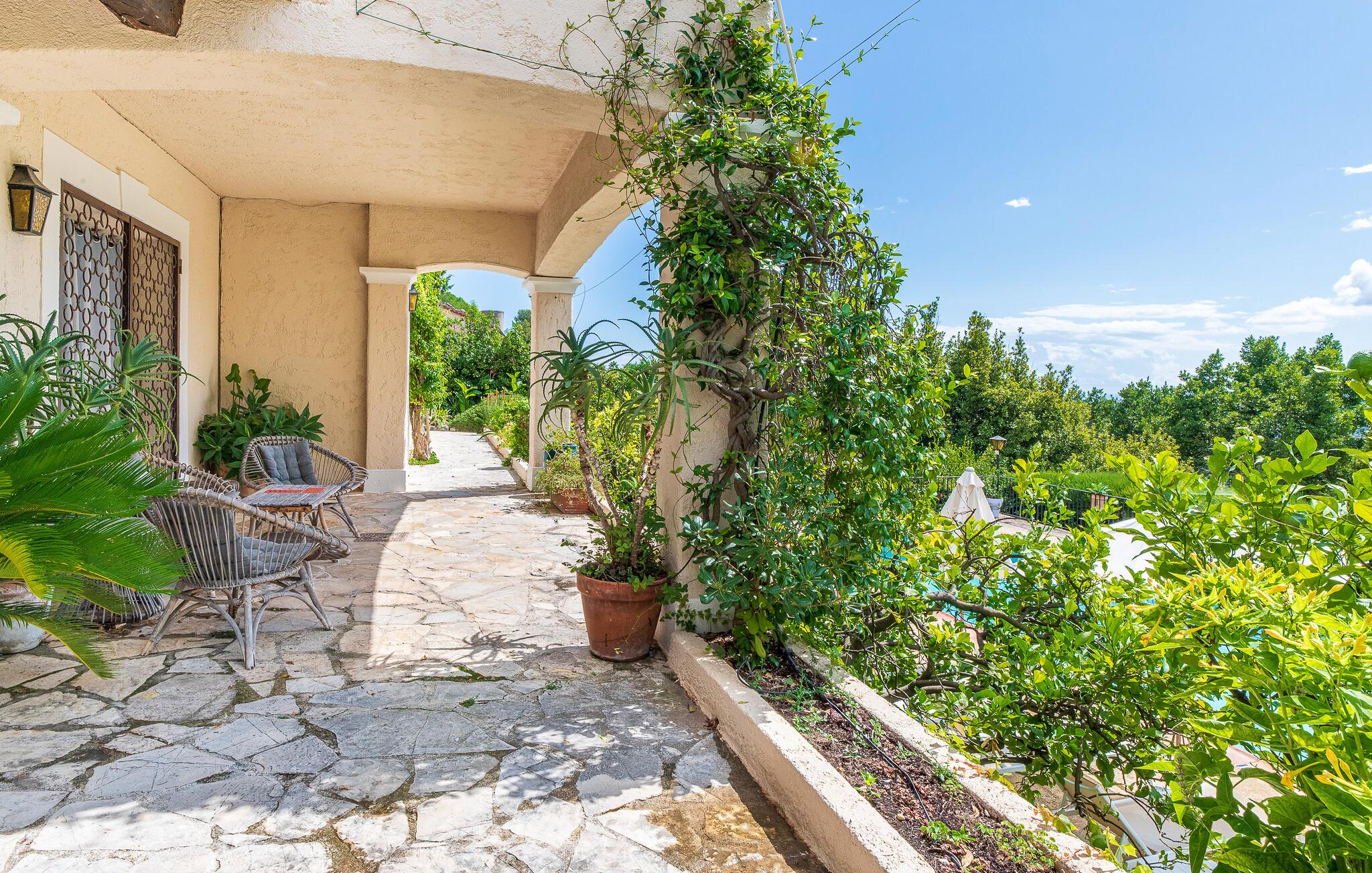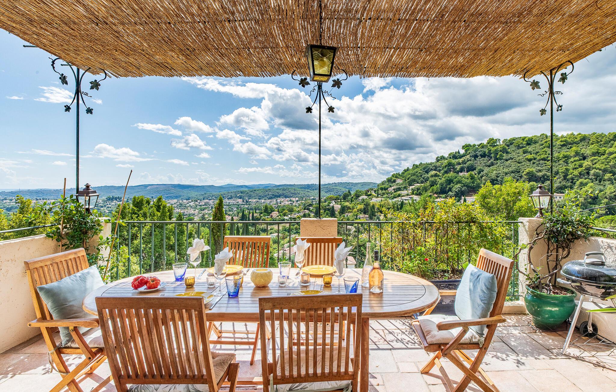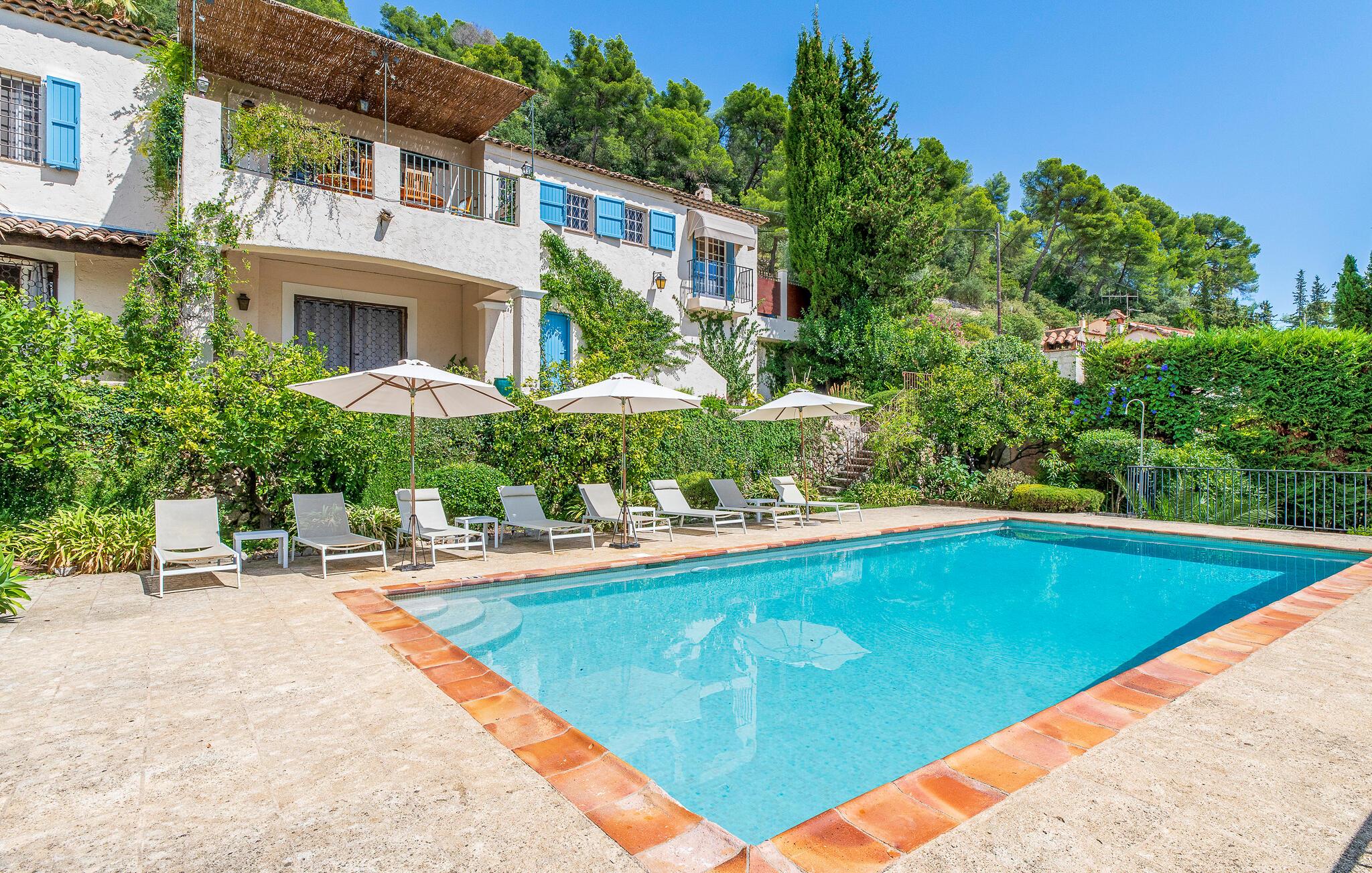 Mit dieser Unterkunft steht einem gelungenen Urlaub nichts im Wege! Diese traumhafte Villa mit einer ganz besonderen Atmosphäre öffnet Ihnen ihre Türen für einen entspannten Urlaub in der renommierten Künstlerstadt Saint-Paul de Vence. Das Innere der Unterkunft, die sich über zwei Ebenen erstreckt, genießt eine komfortable Ausstattung und ist geschmackvoll dekoriert. Harmonische Farbkonzepte ziehen sich durch das ganze Haus und vermitteln in jedem Raum ein wohliges Gefühl. Auch die geräumige Küche ist perfekt eingerichtet. Sammeln Sie hier Ihre Lieben um den langen Holztisch für die gemeinsamen Mahlzeiten oder für kleine Snacks zwischendurch. Durch das Wohnzimmer mit Bibliothek gelangen Sie auf die herrliche Terrasse mit einem sich bis hin zum Mittelmeer ausbreitenden Panoramablick, der Ihnen mit Sicherheit den Atem verschlägt. Die große Sonnenterrasse, die unten vor dem Haus den erfrischenden Außenpool umgibt, lädt mit komfortablen Sonnenliegen und Sonnenschirm zum langersehnten Nichtstun ein. Die zwei vollständig unabhängigen, ebenerdigen Schlafzimmer mit ihren schmiedeisernen Terrassentüren sind nur von außen erreichbar. Auch wenn es Ihnen schwer fällt, sollten Sie diesen wunderschönen Ort für einige spannende Ausflüge verlassen, um die Sehenswürdigkeiten der Region zu besuchen, wie beispielsweise die imposante Festung von Saint Paul de Vence, ein kulturelles Mekka sowie Treffpunkt für Künstler, Schriftsteller und andere Persönlichkeiten. Sehenswert sind auch viele der Orte direkt an der Küste, wie zum Beispiel Saint-Tropez, Cannes, Nizza, Eze und Monaco, die charmanten Bergdörfer im Hinterland sowie die provenzalischen, sehr lebhaften Märkte, auf denen Sie allerlei regionale Spezialitäten kaufen können.