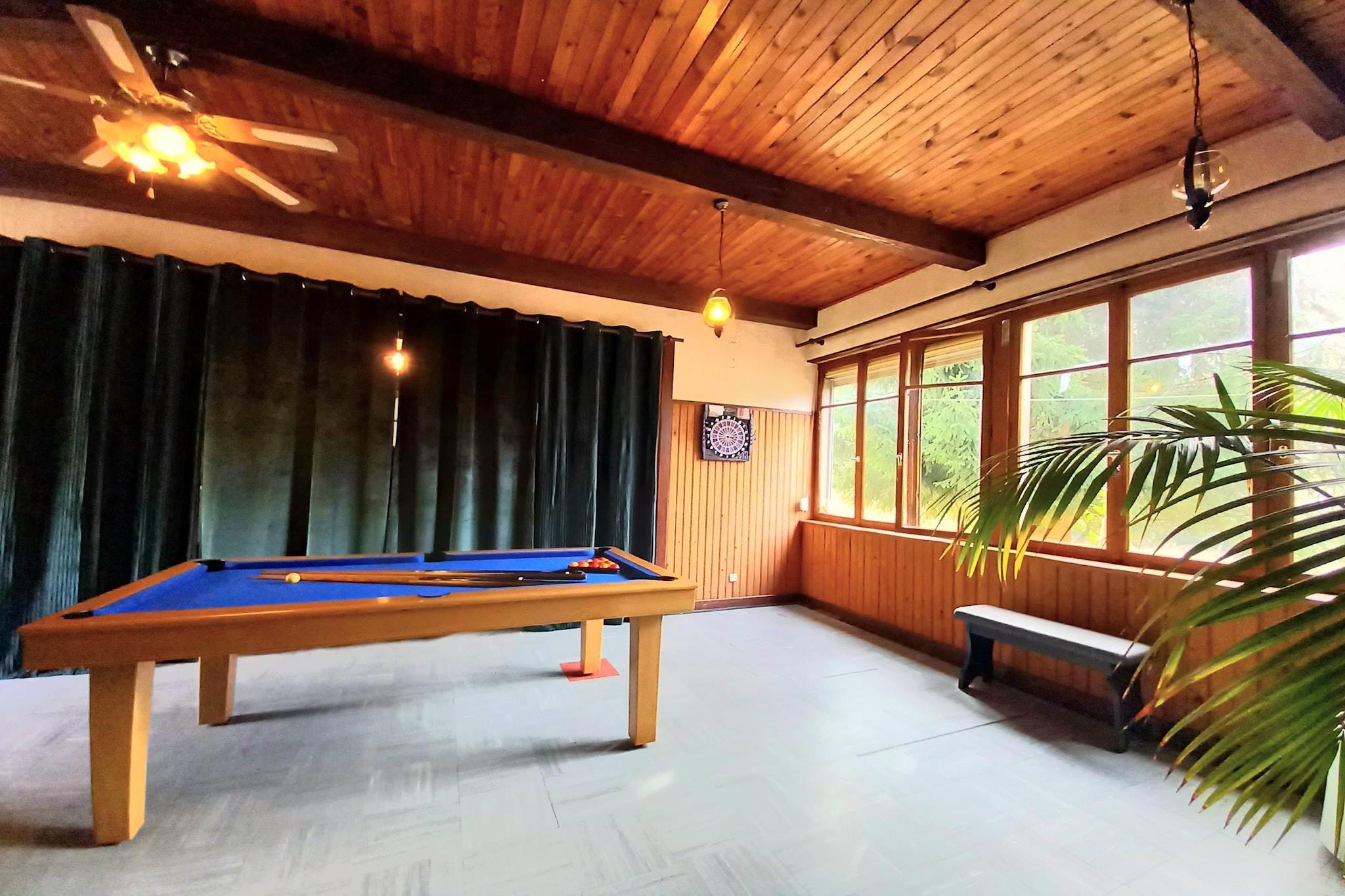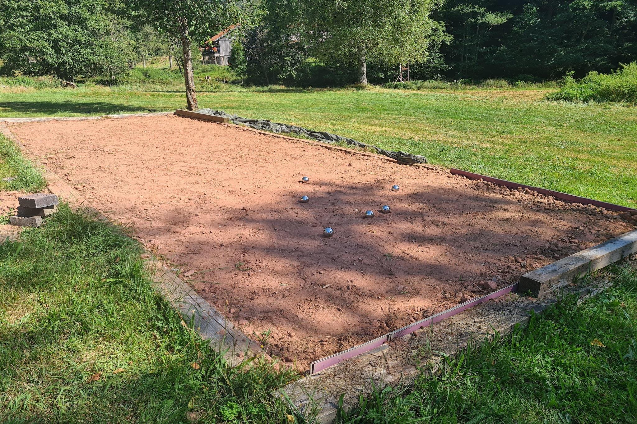 On the 1st floor: (open kitchen(electric kettle, toaster, cooker, hood, coffee machine, oven, microwave, fridge, fridge-freezer), Living/diningroom(single sofa bed, TV, dining table), bedroom(single bed, double bed), bedroom(double bed), bathroom(shower, washbasin, toilet, washing machine), children's bed, high chair, iron) recreation room(dining table, bar, darts, toys), cot, heating, courtyard, terrace, garden(1500 m2), bicycle storage, garden furniture, BBQ, parking, pond, pond, boules court