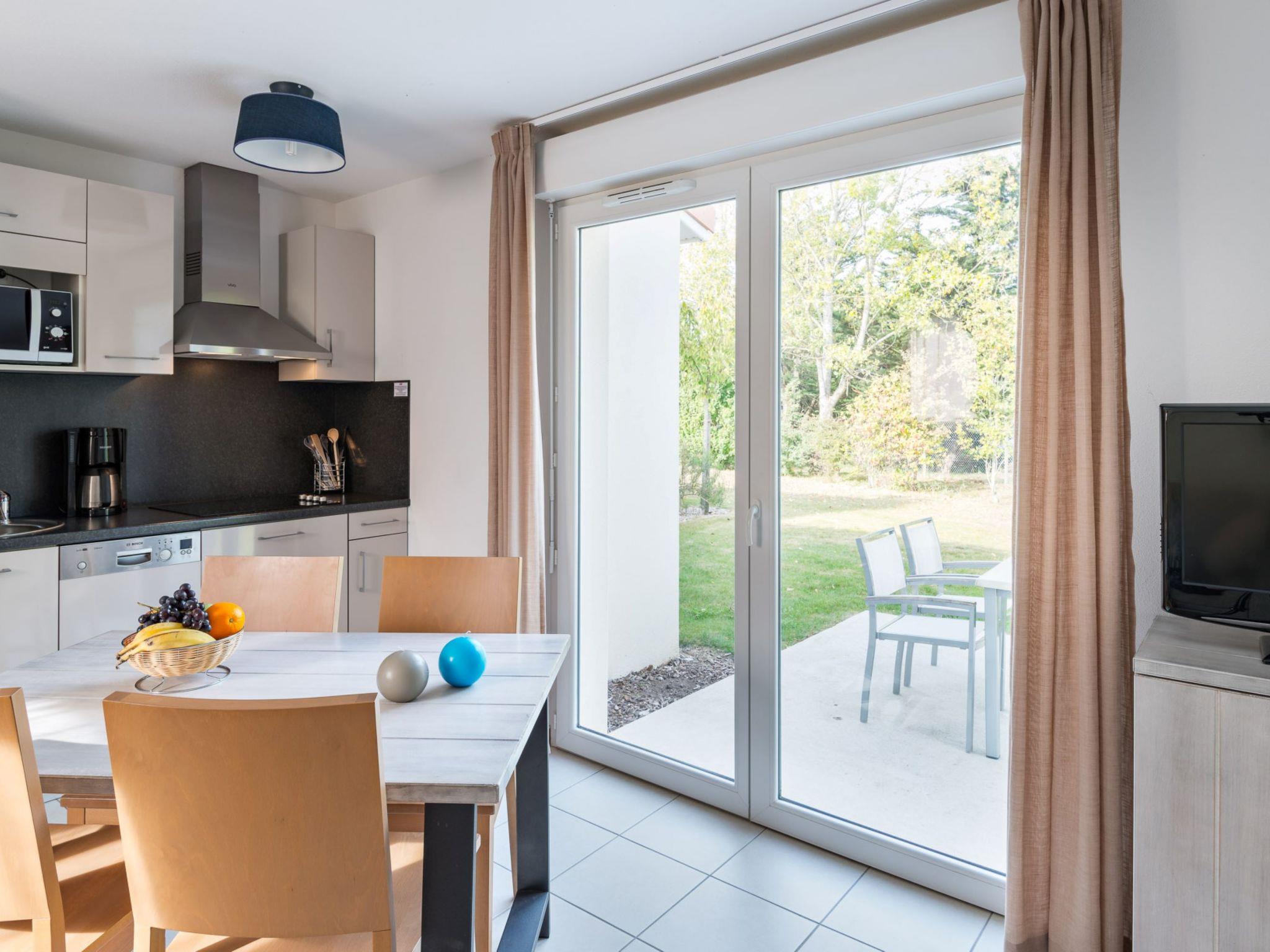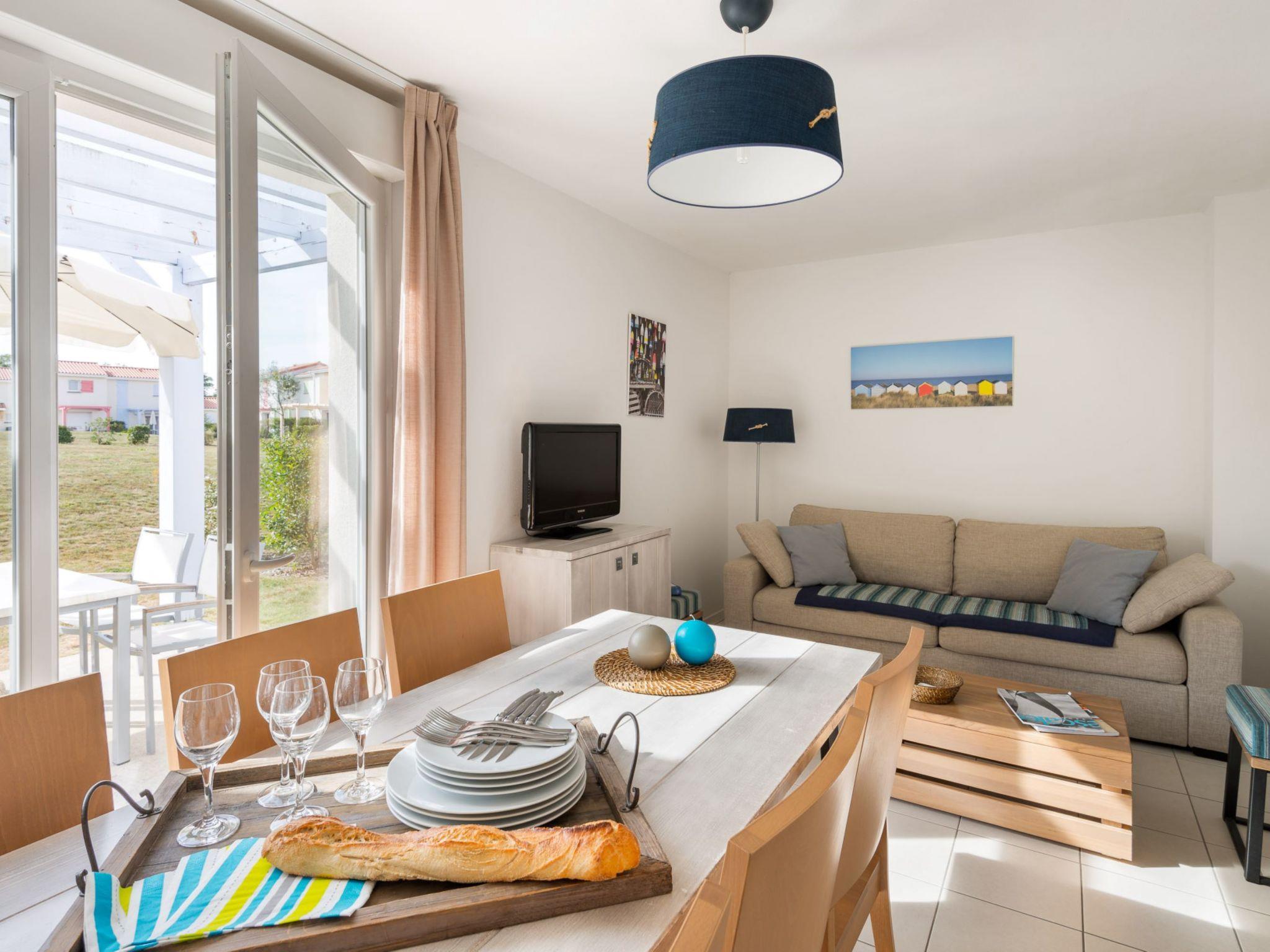 Child friendly resort "Le Village de la Mer", 2 storeys. 71 houses in the residence. 7 km from the centre of Talmont-Saint-Hilaire, 7 km from the sea, in a cul-de-sac, in the countryside. For shared use: property 12 ha with plants, meadow, swimming pool heated (24 x 9 m, depth 90 - 150 cm, seasonal availability: 15.May. - 15.Sep.). Tennis, table tennis. In the complex: sauna (extra). Fitness room, steam room (extra). Hot tub (extra). Billiard table, storage room for bicycles, washing machine, tumble dryer (for shared use, extra). Motor access to the house. Footpath to the house. Parking. Shop 6 km, bus stop "Centre Equestre" 1.6 km, sandy beach "Plage du Veillon" 7 km. Golf course (18 hole) 3 km. Please note: the photograph shows a typical example. The holiday properties may differ in living space, floorplan, equipment and furnishing.