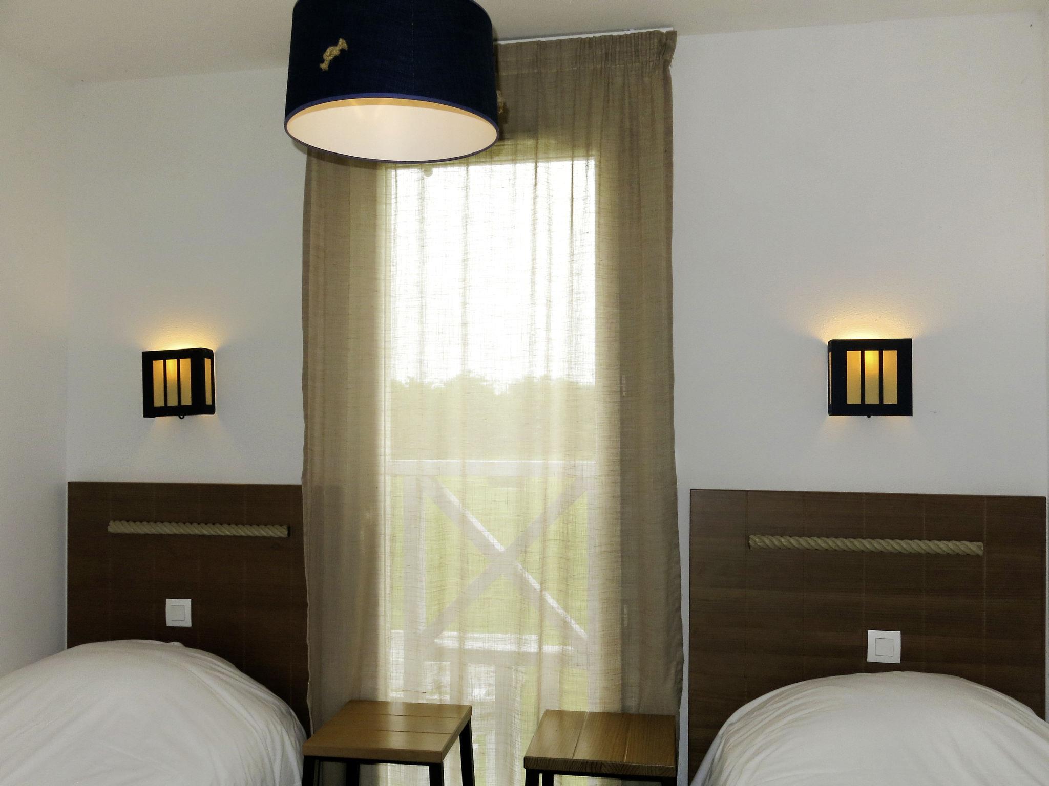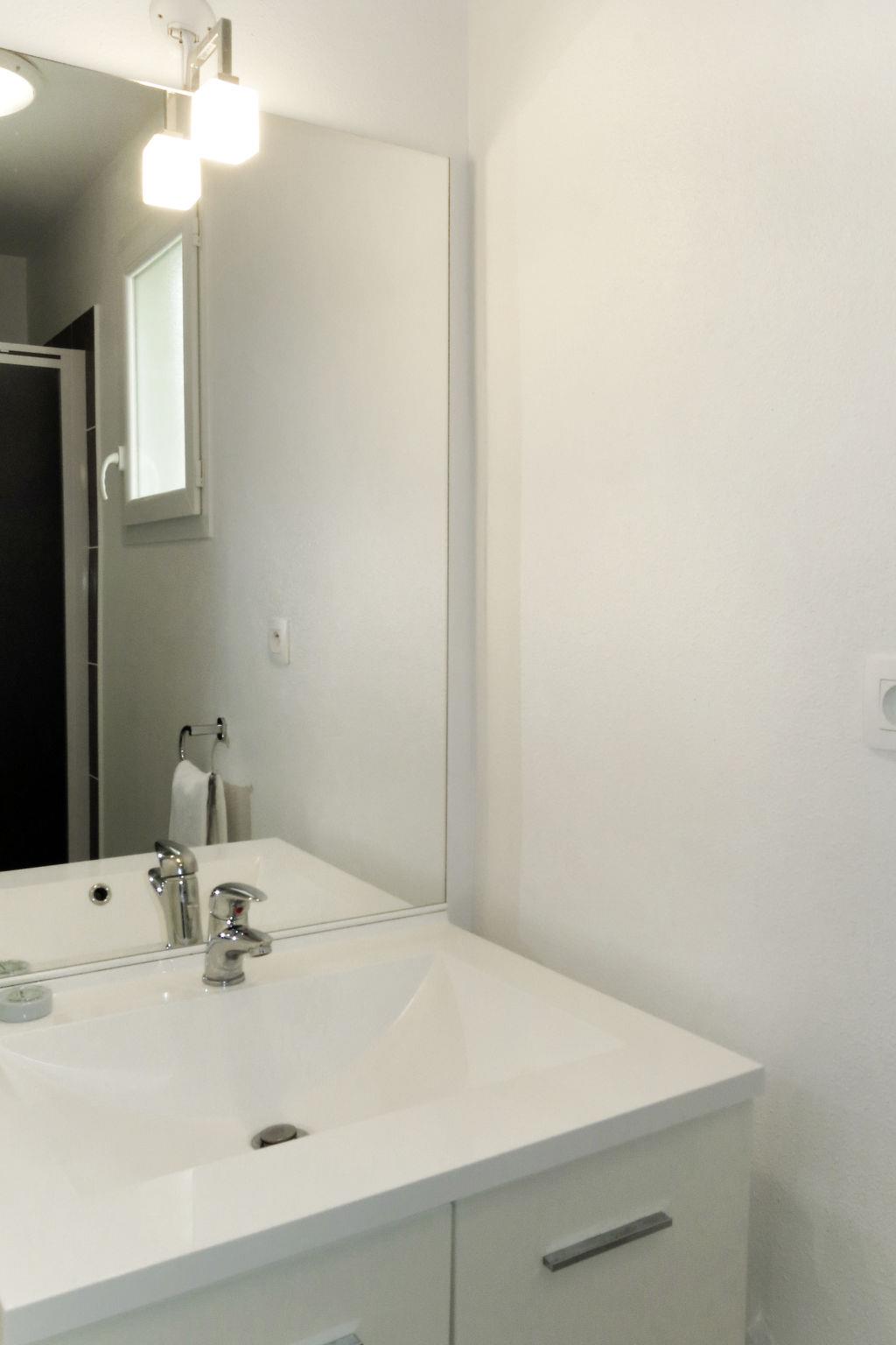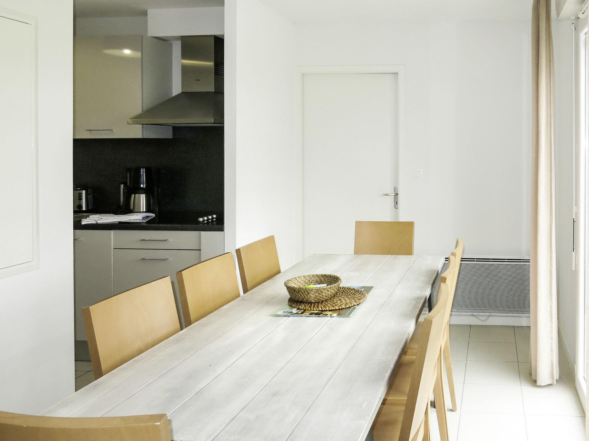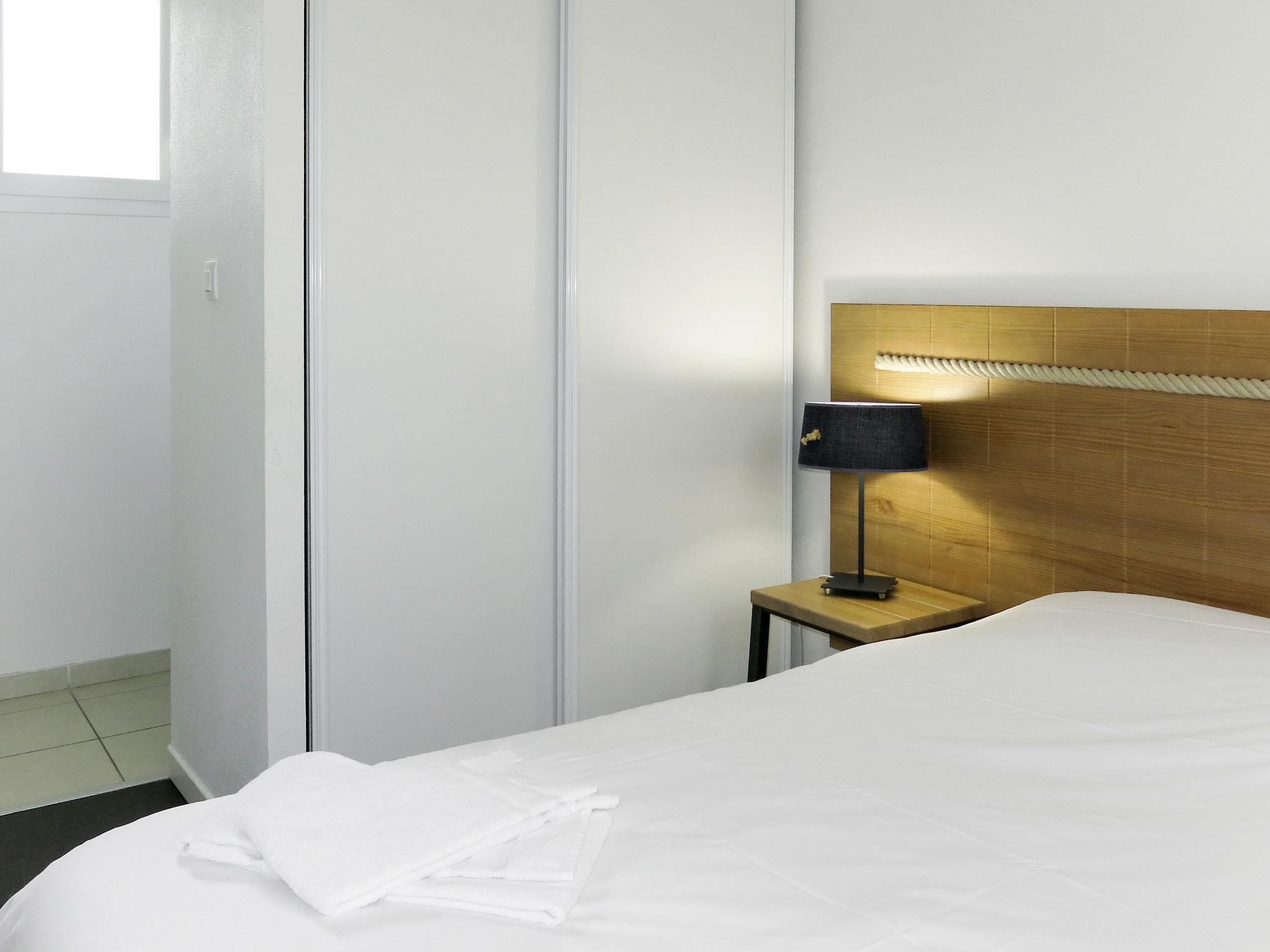 "Le Village de la Mer", 4-room terraced house 58 m2 on 2 levels. Object suitable for 6 adults. Beautiful furnishings: living/sleeping room with 1 double sofabed, dining table and TV. Exit to the terrace. 1 room with 1 french bed and shower. Kitchenette (dishwasher, 2 ceramic glass hob hotplates, toaster, kettle, microwave, electric coffee machine). Sep. WC. Upper floor: 2 rooms, each room with 2 beds (80 cm). Bath/WC. Electric heating. Terrace. Terrace furniture. Facilities: children's high chair, baby cot (extra). Please note: maximum 2 pets/ dogs allowed. Smoke alarm, fire extinguisher.