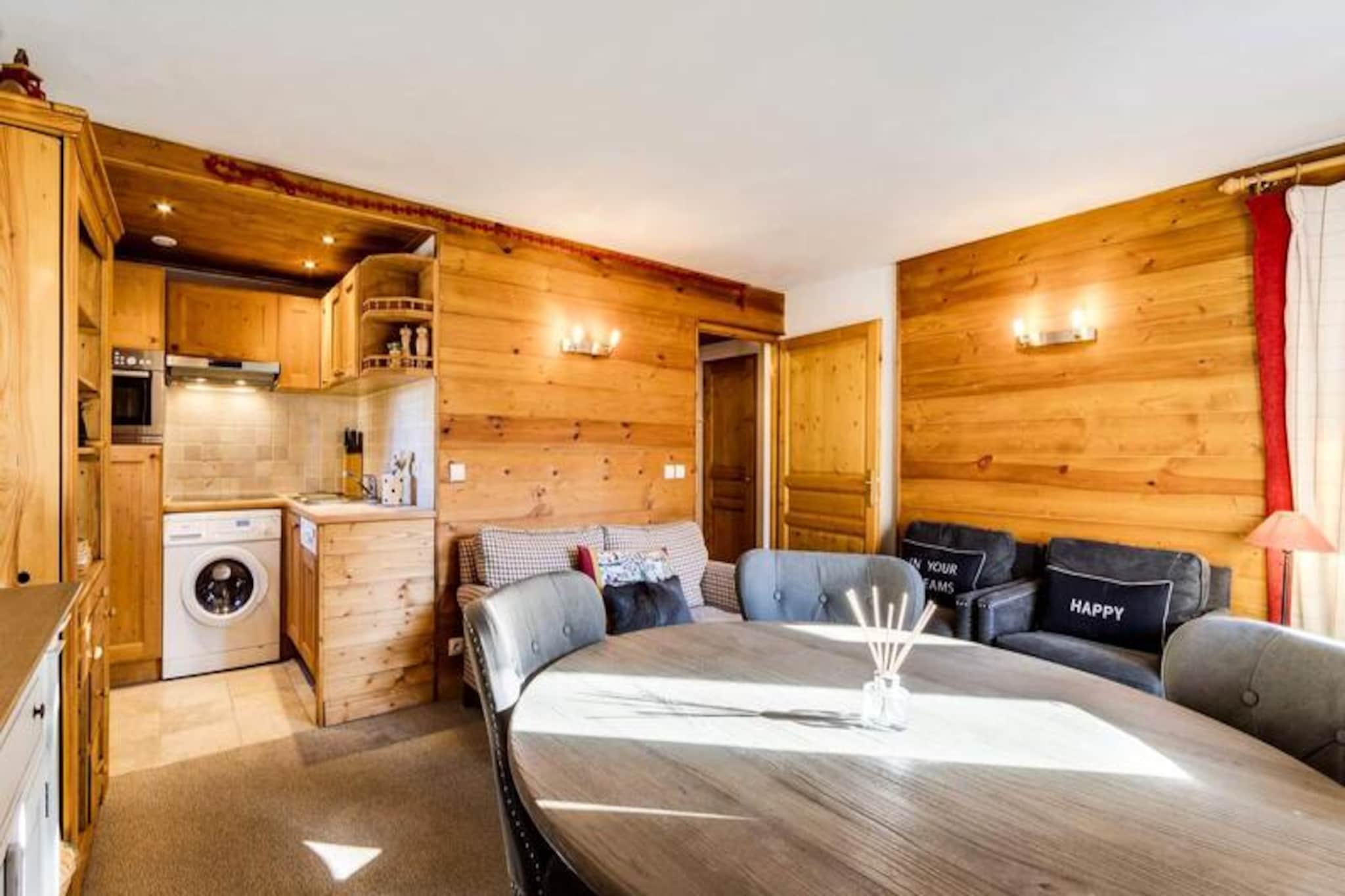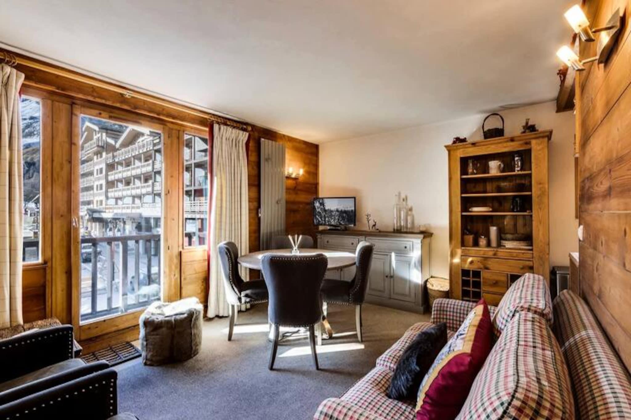 In the heart of Val d'Isère Village, where tradition meets alpine elegance, this charming apartment offers an unparalleled mountain retreat. Imagine waking up to the sun illuminating the snow-covered slopes, stepping onto your south-facing balcony to breathe in the crisp mountain air, and knowing the ski slopes are just meters away. The picturesque surroundings, crafted from stone and wood in authentic Savoyard style, create a warm and inviting atmosphere for your holiday escape. \n\nDesigned for up to four guests, this second-floor apartment in the Saturne residence combines comfort and practicality. The living room features a flat-screen TV, Wi-Fi, and a cozy sofa, while the kitchen is equipped with modern appliances including a combination microwave/oven, ceramic hob, dishwasher, and washer/dryer. The sleeping arrangements include a double bedroom and a cabin bedroom with bunk beds, ensuring restful nights after days of adventure. A bathroom with a bathtub and heated towel rail, along with a separate toilet, adds to the convenience. The ski locker and covered parking space make your stay seamless and stress-free.\n\nVal d'Isère Village boasts direct access to the slopes, shops, and restaurants, making it an ideal base for exploring the resort. Enjoy après-ski at Coin des Amis or Le Doudoune Club, savor local flavors at La Corniche, or take advantage of special rates at the INTERSPORT Front de Neige MATTIS shop for ski rentals. The vibrant atmosphere and proximity to key facilities ensure every moment is filled with excitement and ease.\n\nWhether you’re here for thrilling ski days, cozy evenings, or simply to soak in the alpine charm, this apartment offers the perfect blend of comfort and location. Let the magic of Val d'Isère Village create unforgettable memories for your mountain getaway.