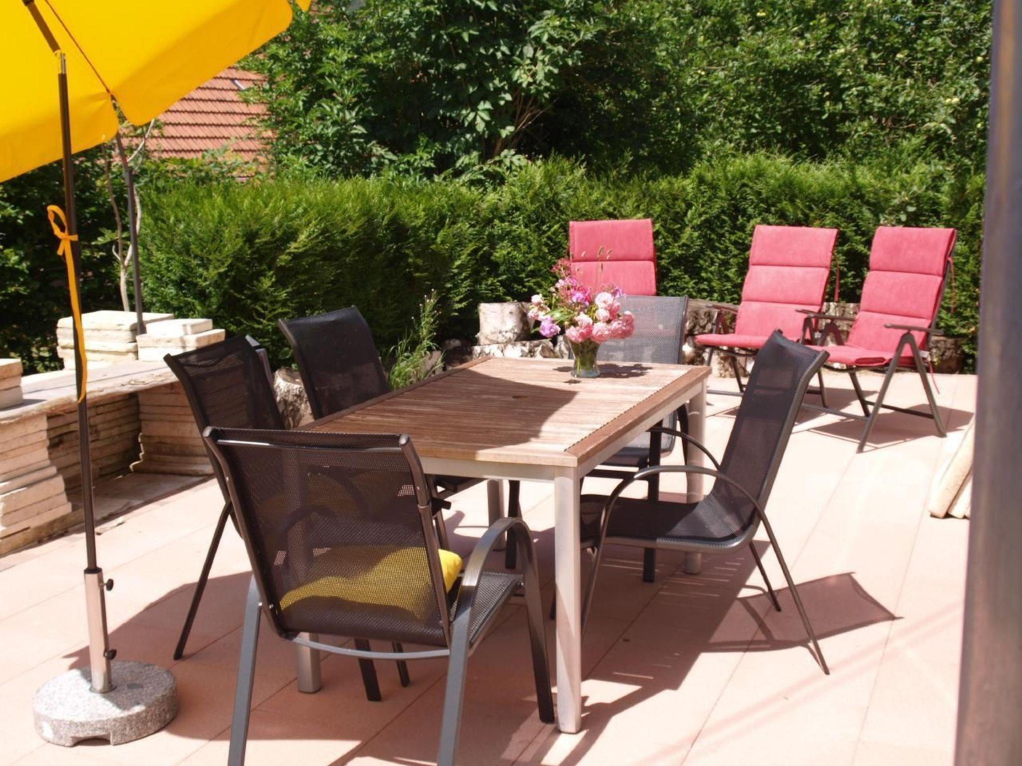 The large terrace is furnished with a large table, garden chairs and a plancha.