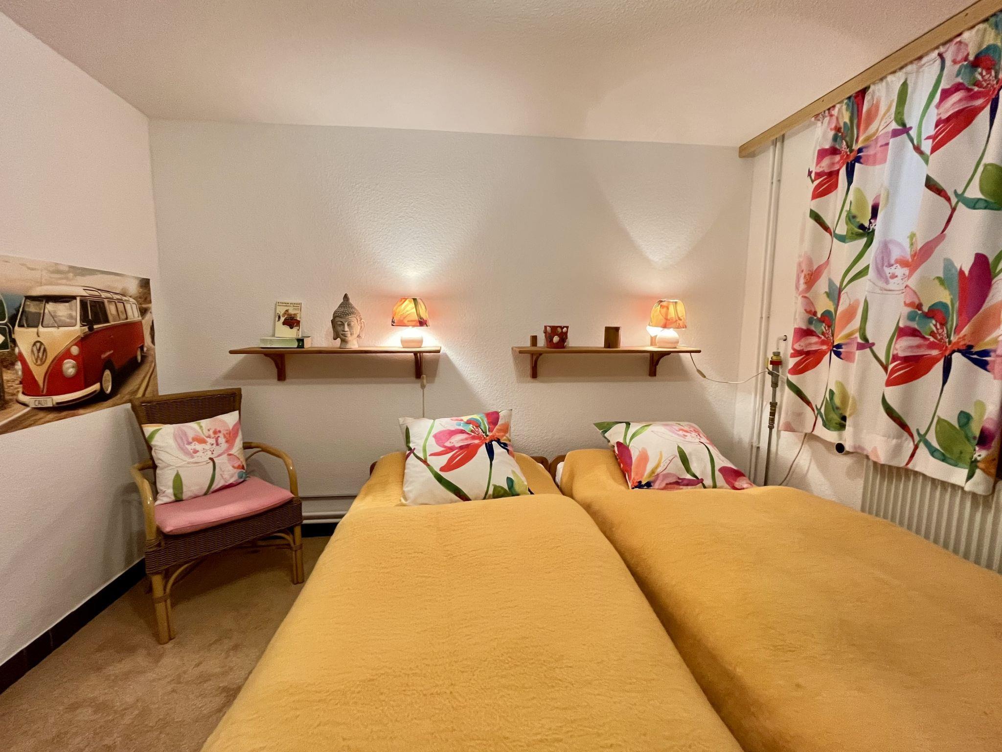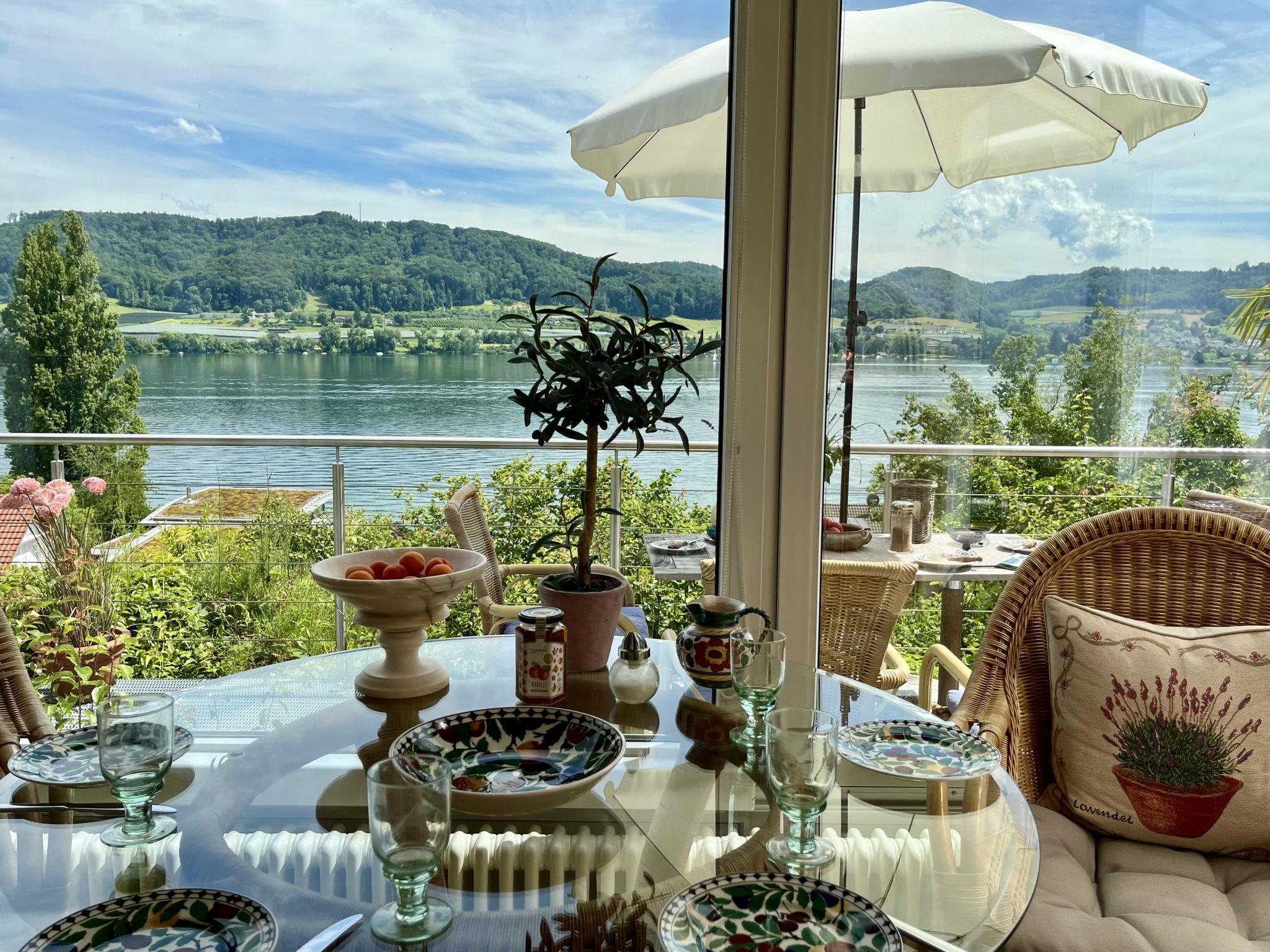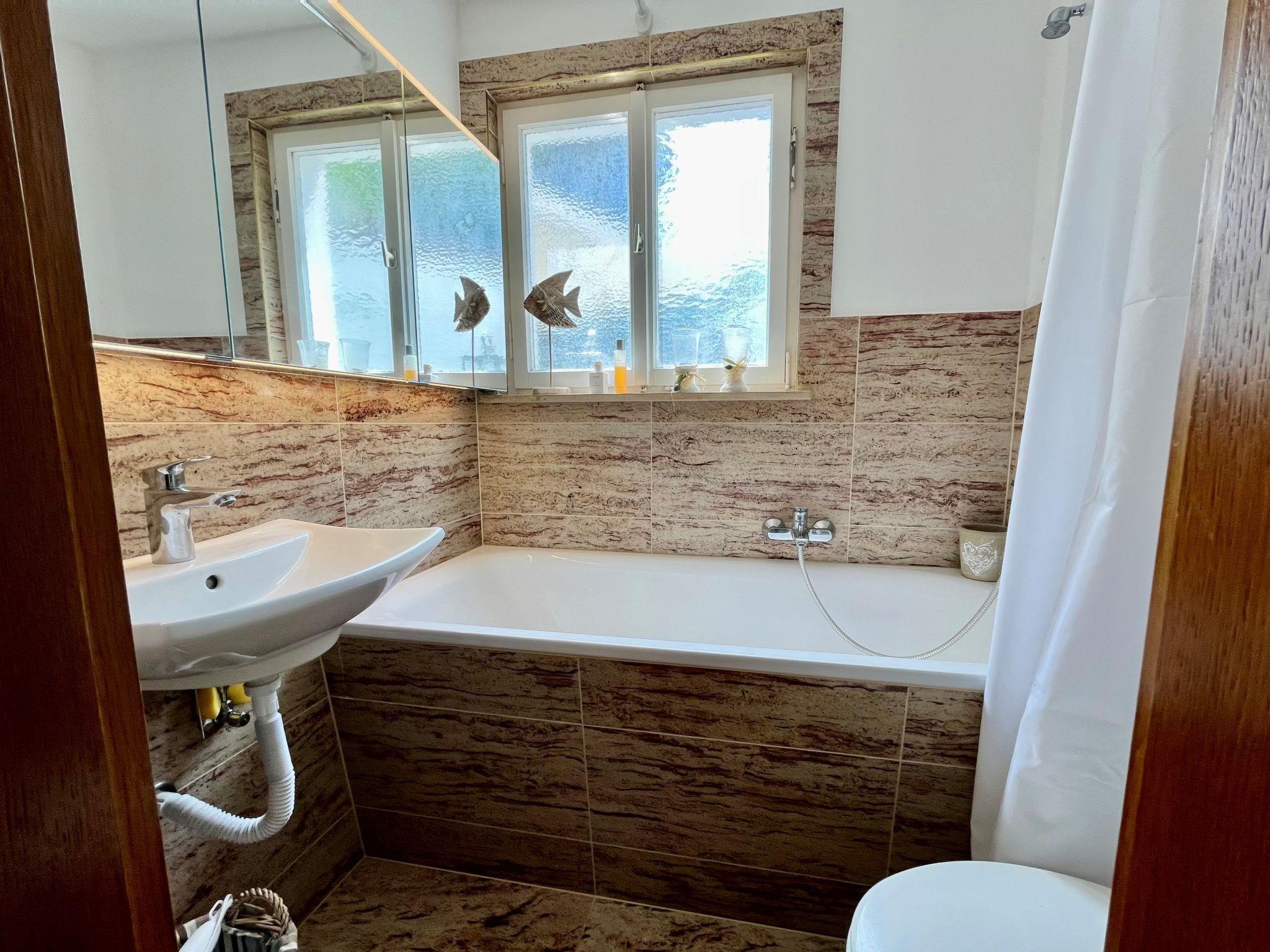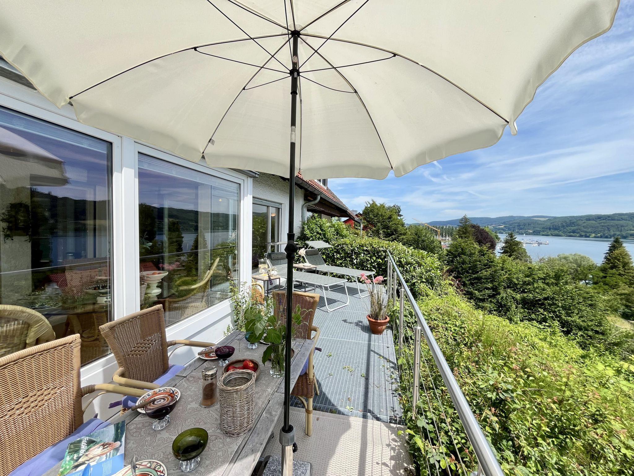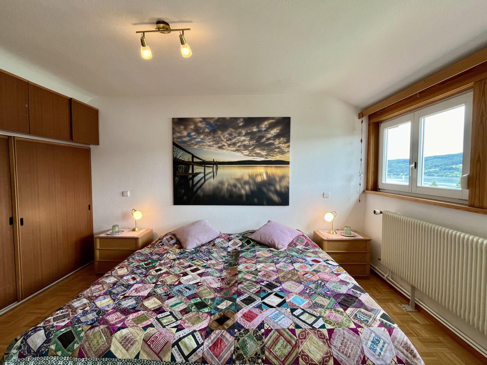 "Seepanorama", 4-room semi-detached house 90 m2 on 3 levels. Bright, partly renovated in 2022, beautiful and cosy furnishings: living room with satellite TV (flat screen), hi-fi system. Walk-through room with dining table. Exit to the balcony, to the terrace. Open kitchen (oven, dishwasher, 4 ceramic glass hob hotplates, kettle, electric coffee machine). Bath/WC. Heating. On the lower ground floor: 1 double bedroom with 1 double bed (2 x 90 cm, length 200 cm). Walk-through room with 2 x 1 bunk beds (90 cm, length 200 cm), hand-basin. Upper floor: 1 double bedroom with 1 double bed (180 cm, length 200 cm). Large balcony, south facing position, large terrace, south facing position and west facing position. Terrace furniture, balcony furniture, electric barbecue (portable), deck chairs (2). Marvellous view of the lake. Facilities: washing machine, dryer, hair dryer. Internet (WiFi, free). Parking at the house. Please note: not suitable for small children. Non-smoking house. Smoke alarm, fire extinguisher. For reasons of space, the oven, washing machine and tumble dryer are located in the basement of the house. Bed layout is flexible. There are more sleeping options available than the maximum number of people allowed which may, however, not be exceeded.