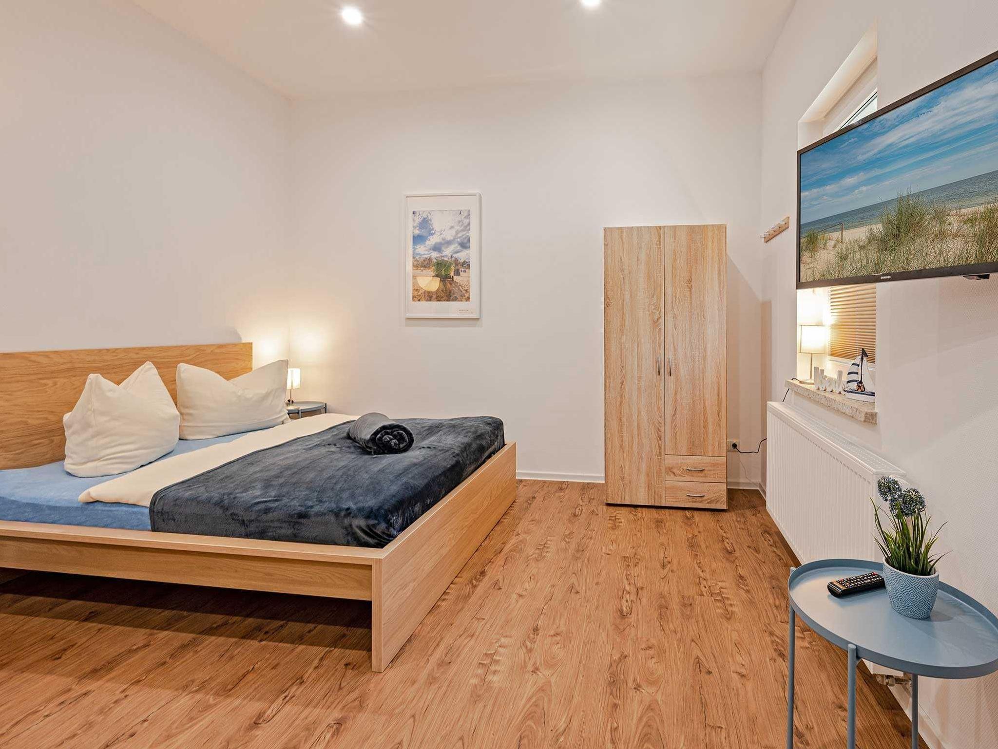 - Essplatz, Doppelbett (1,60 breit), Kleiderschrank, Flachbild-TV, Pantryküche (Kühlschrank, 2 Kochplatten, Spüle) mit Geschirr, Kaffeemaschine, Wasserkocher, Toaster