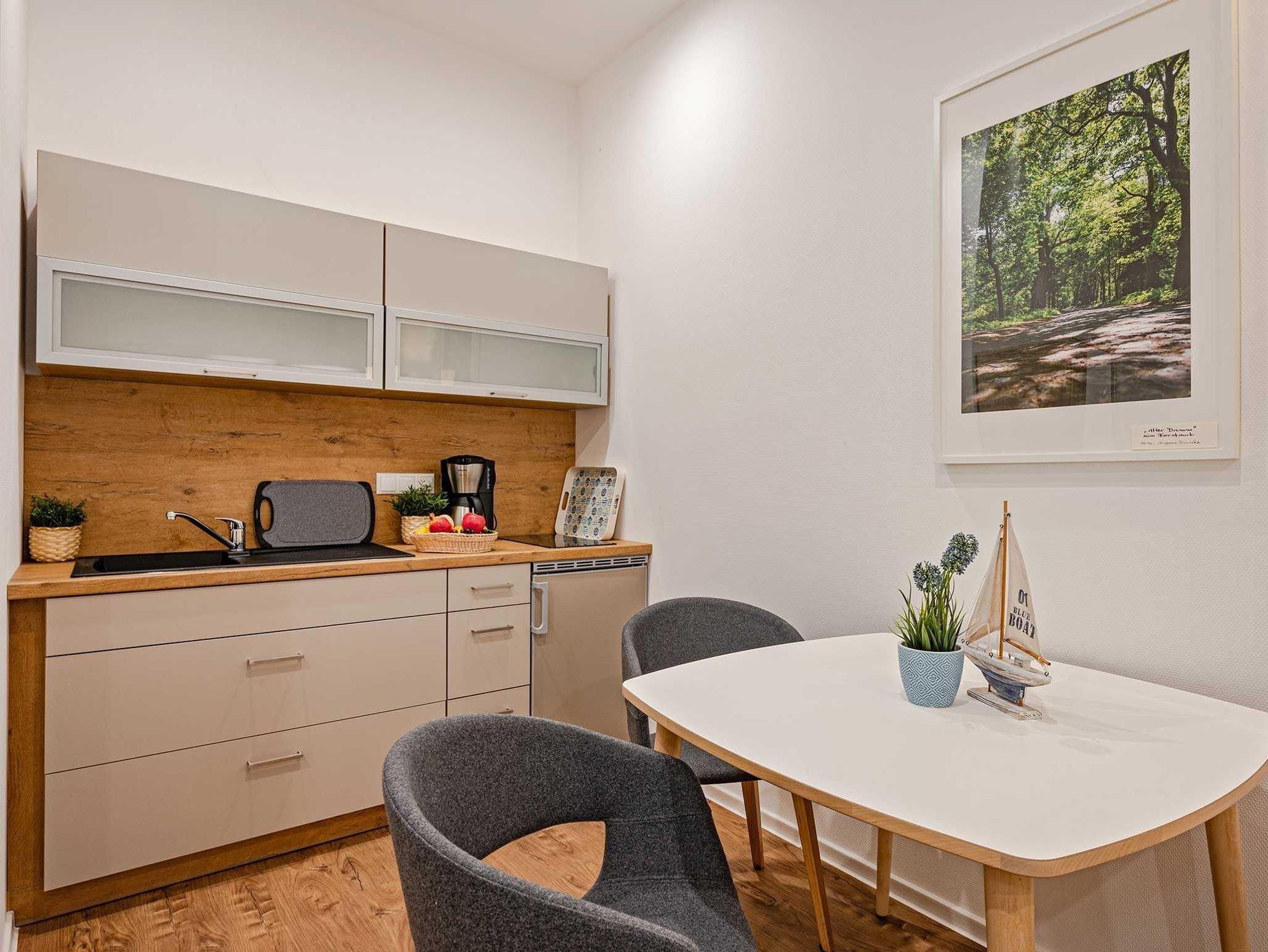 Sie besteht aus einem kombinierten Wohn-/Schlafraum mit integrierter Küchenzeile und einem Bad mit Dusche/WC.