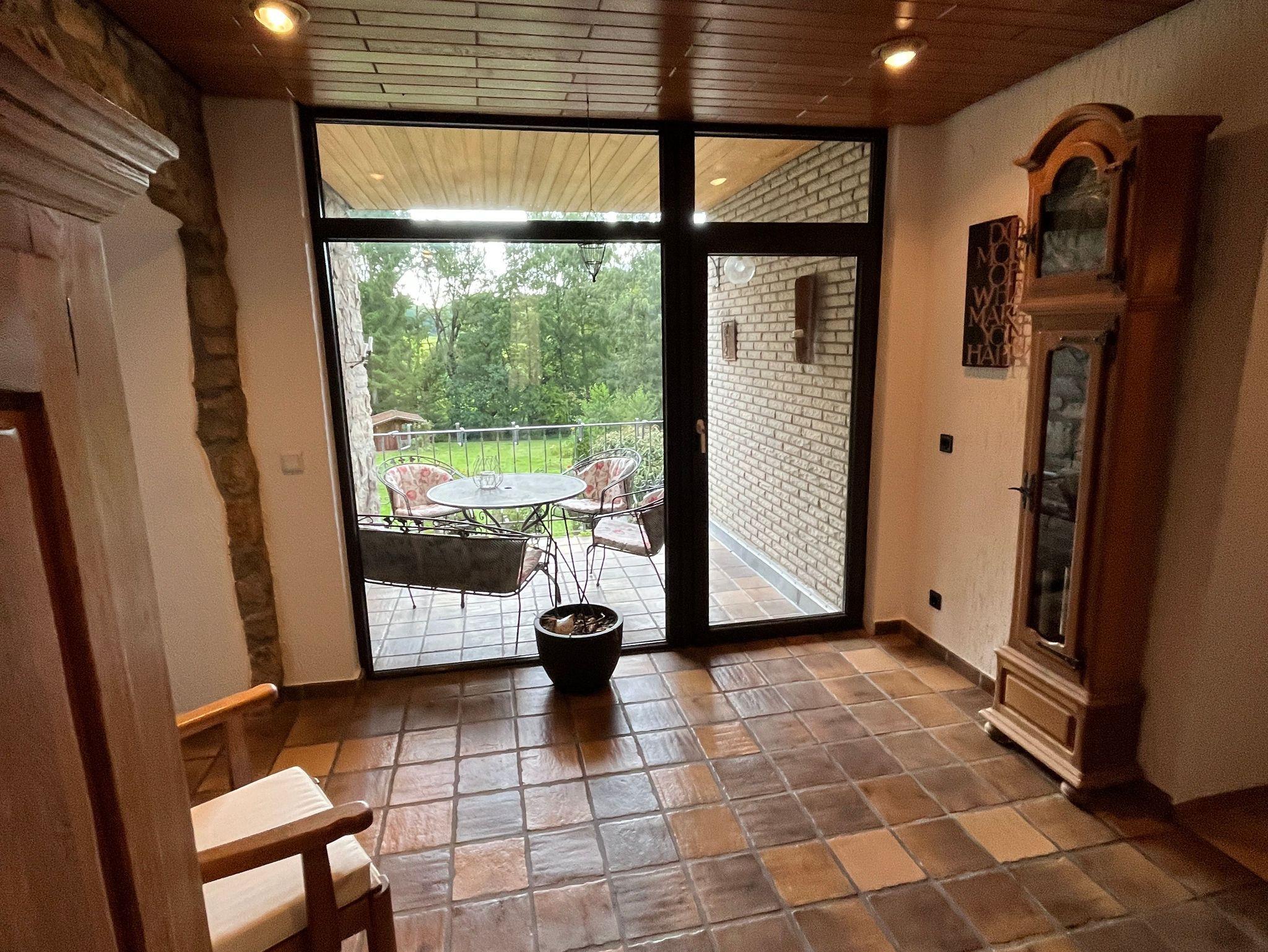 Sie betreten die schöne Ferienwohnung über einen eigenen überdachten Hauseingang. Nach Öffnen der Haustür betreten Sie zuerst die große Wohndiele mit ihrer großen Bruchsteineand und dem aufregenden Blick auf die große Loggia. Von hieraus eröffnet ein toller Blick auf das große Grundstück, den dort befindlichen Teich und die tolle Natur.