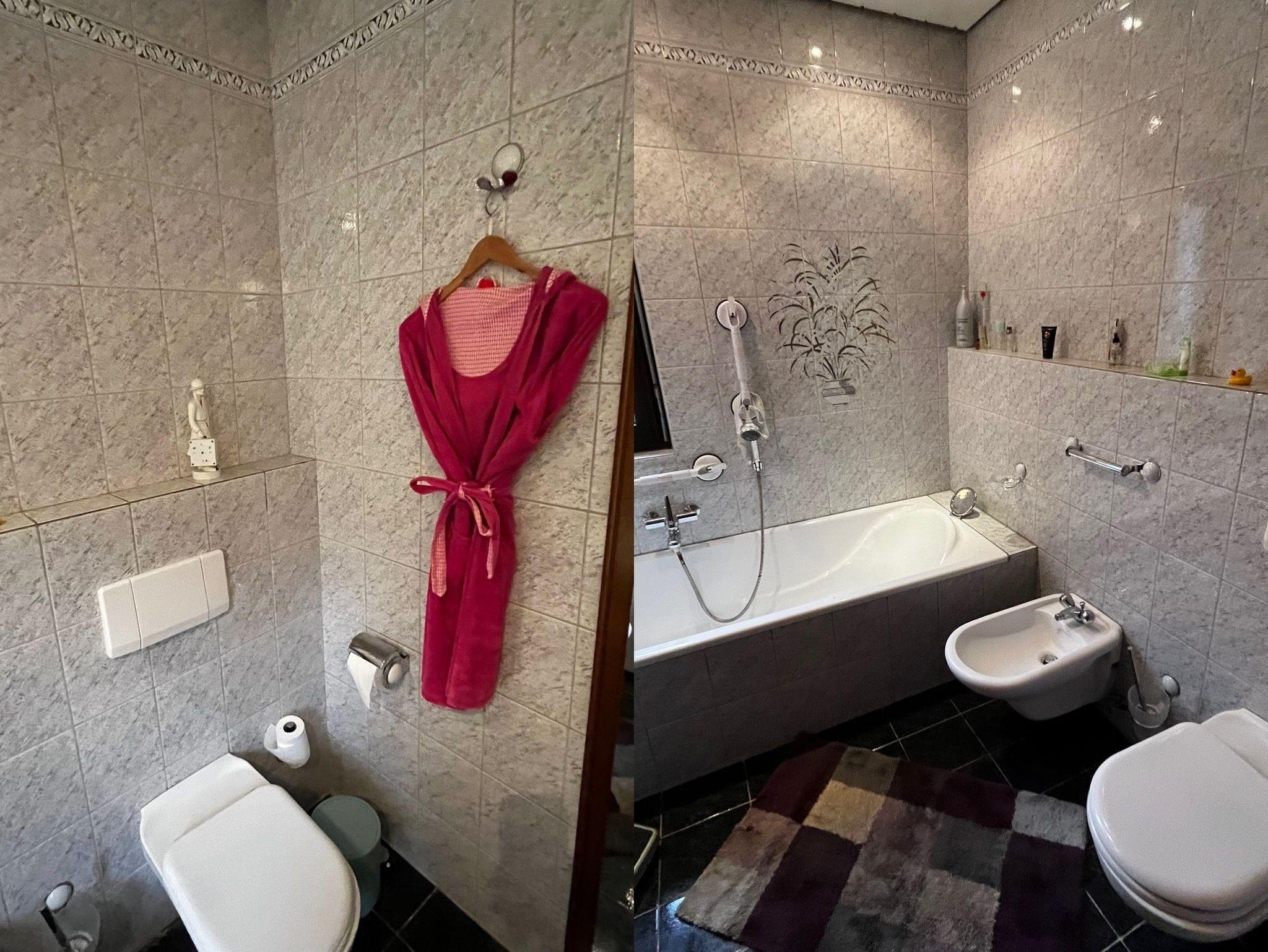 Dierekt neben dem Schlafzimmer liegt ihr helles Badezimmer mit Waschbecken, großem Spiegel, PD, Toilette und einer weißen, einladenden Badewanne. Das Bad verfügt natürlich über ein Fenster und Hologenspots in der weißen Decke.