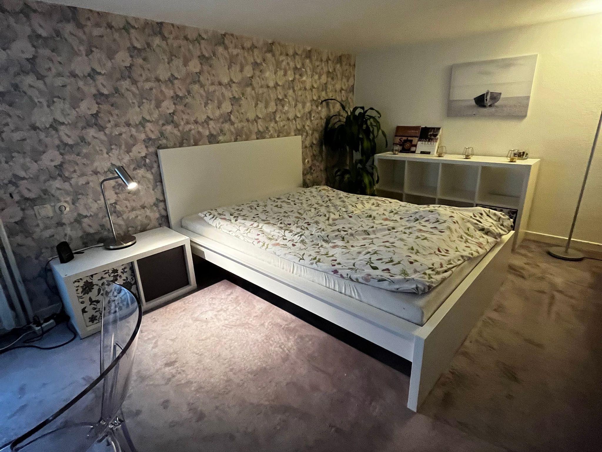 Auf dieser Etage befinden sich das mit einem Designermöbeln ausgestattete erste Schlafzimmer. Sie betreten es direkt von der Wohnduele aus.