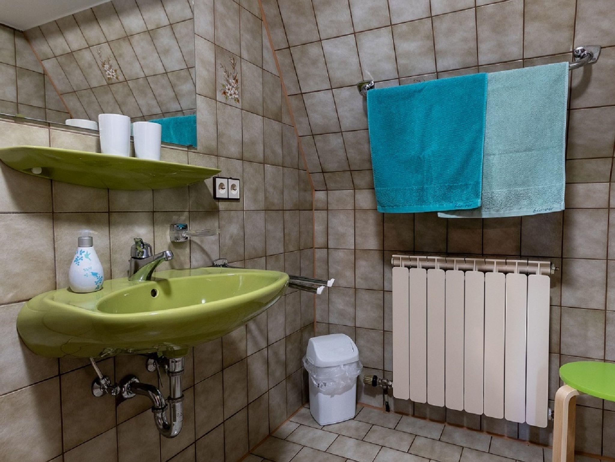 Das Badezimmer mit Dusche und einem Spiegel, ergänzen sich perfekt zum separate Toilettenraum.