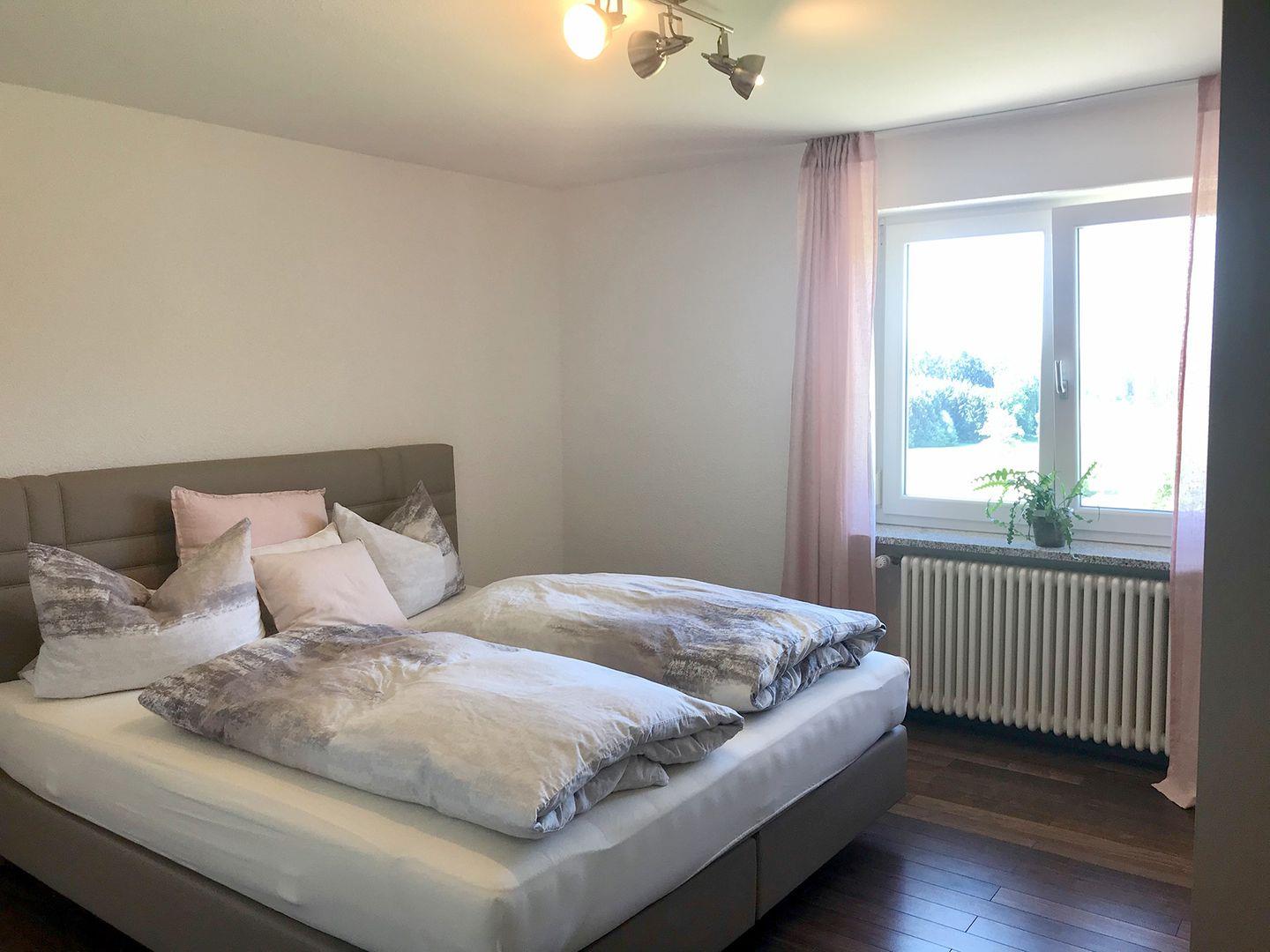 Die neu ausgebaute Ferienwohnung im 1. OG bietet auf ca. 55 m² modernen Komfort und überzeugt mit einem großzügigen Balkon sowie einem eigenen Stellplatz. Dank großer Panoramafenster genießen Sie eine fantastische Aussicht auf die ländliche Umgebung.