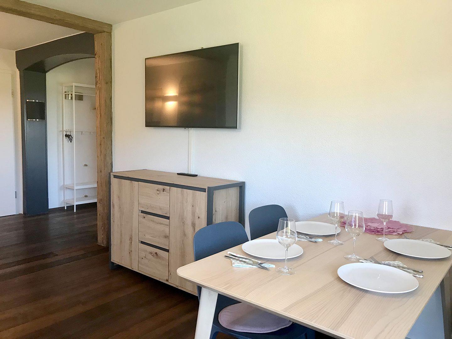 Die familienfreundliche Wohnung ist ideal für Paare oder Familien. Sie verfügt über einen großen Wohnbereich mit Esstisch, Schlafcouch und Fernseher. Die voll ausgestattete Küche umfasst Spülmaschine, Cerankochfeld, Backofen, Kaffeemaschine, Wasserkocher, Toaster und reichlich Geschirr. Das Schlafzimmer bietet ein komfortables Doppelbett (1,80 m x 2 m) und einen geräumigen Kleiderschrank.