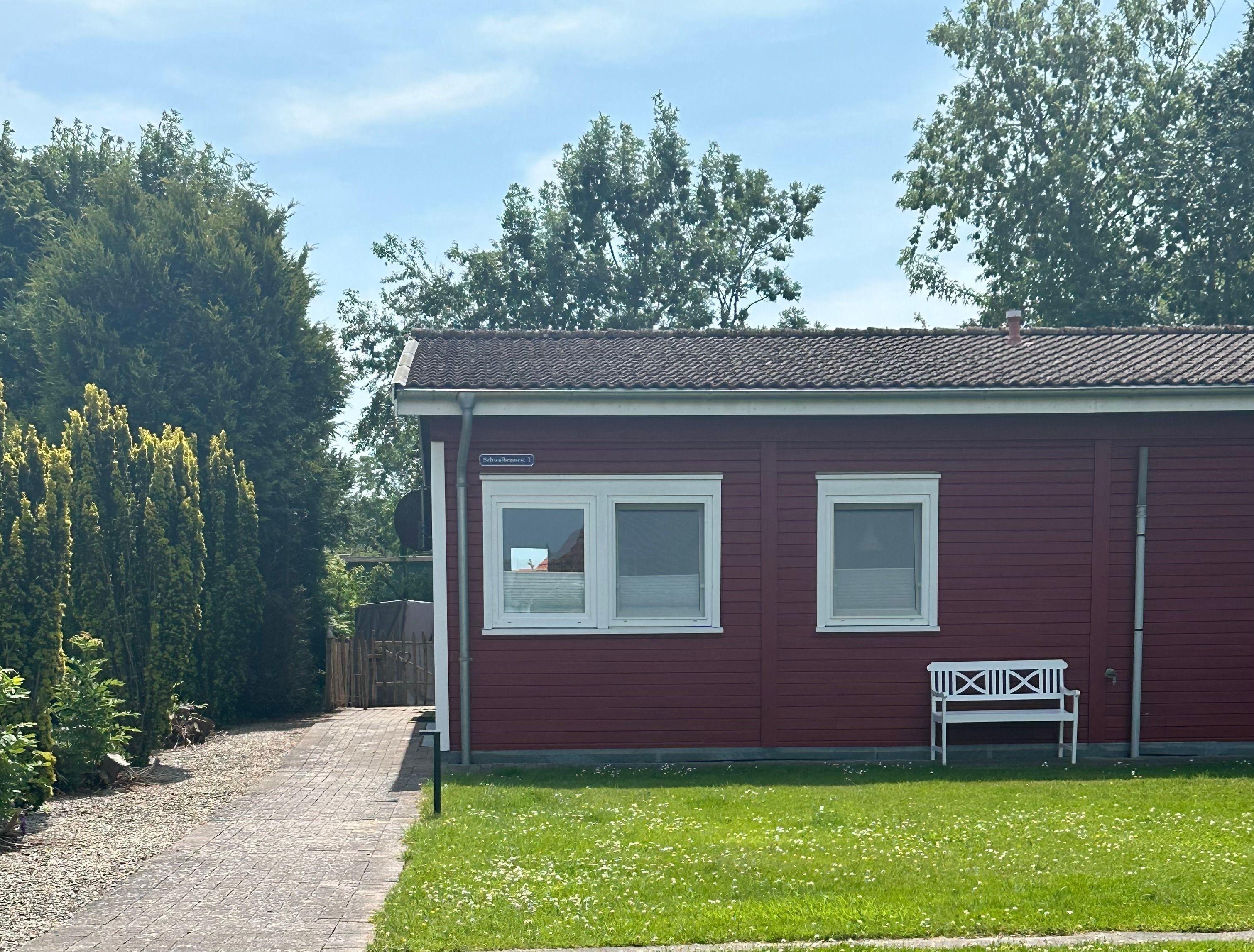Die eingezäunte Südterrasse ist mit einem Strandkorb ,Gartentisch mit 4Stühlen, einer Gartenbank, zwei Sonnenliegen und einem Holzkohle Grill ausgestattet .