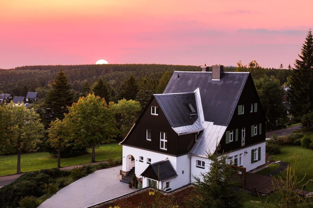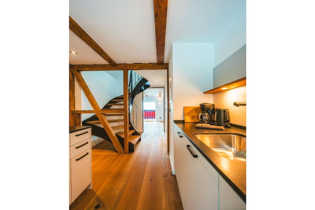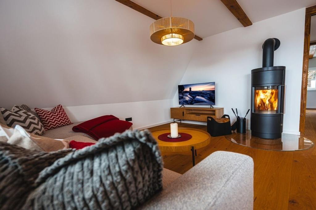 In unserem Maissonetteappartement kannst du auf 85m² mit bis zu 4 Personen durchatmen und einfach sein. Von zwei Balkonen genießt du den Weitblick bis ins Elbsandsteingebirge. Starte deinen Tag mit einer Tasse Kaffee auf dem Balkon und genieße den Sonnenaufgang über dem Erzgebirgskamm. In der großzügigen Küche findest du alles für gemeinsame Kochabende um danach vorm knisternden Kaminfeuer zu entspannen. Mach es Dir in der Loungeecke gemütlich und genieße den Ausblick auf einen klaren Sternenhimmel. Die beiden Schlafzimmer im Dachspitz sind nicht nur romantisch sondern bieten dir auch einen traumhaften Ausblick in den Wald oder die Ferne.