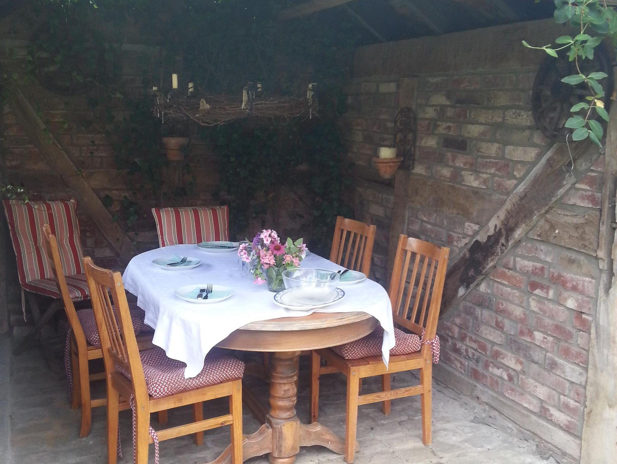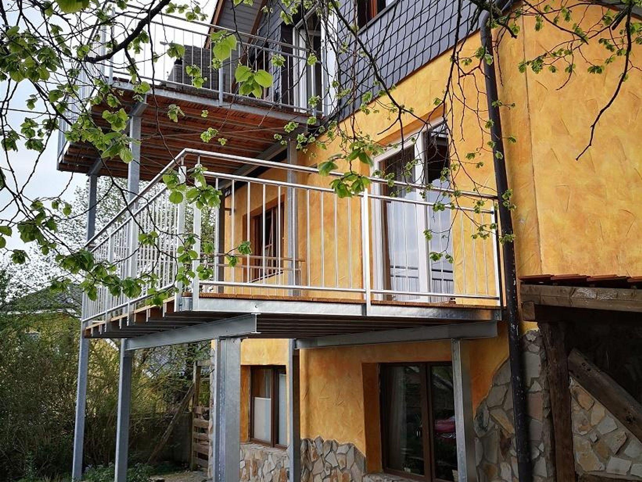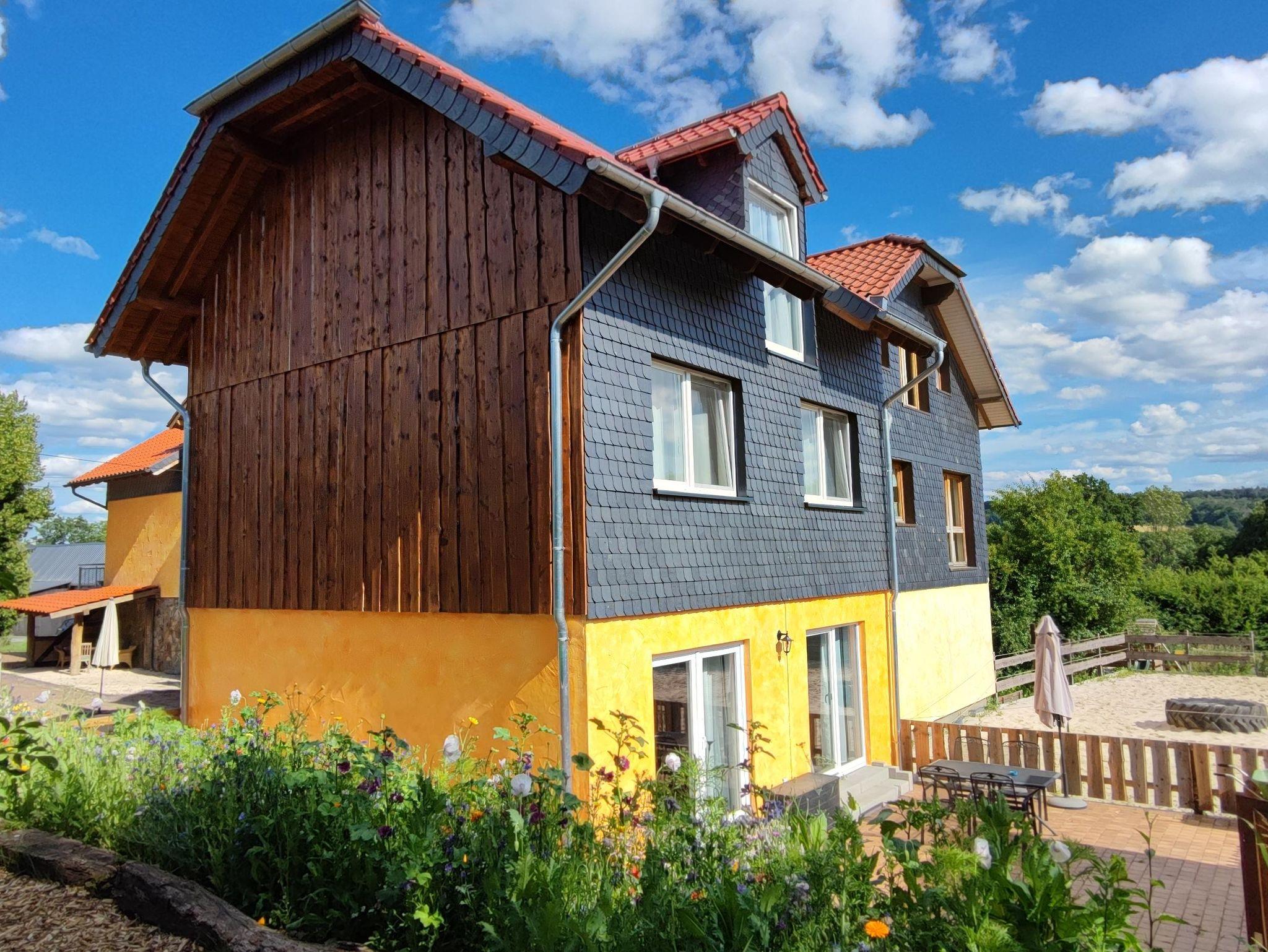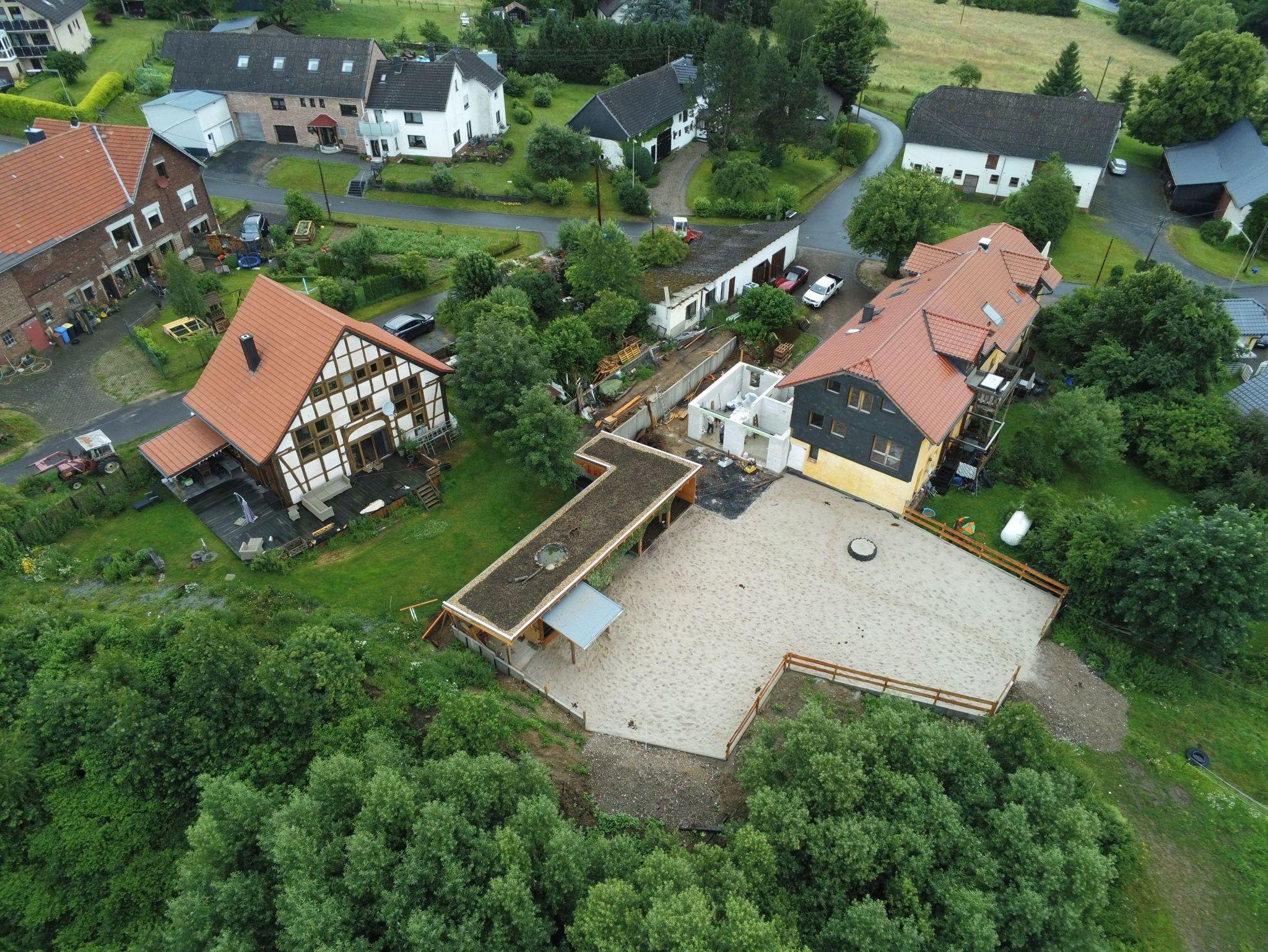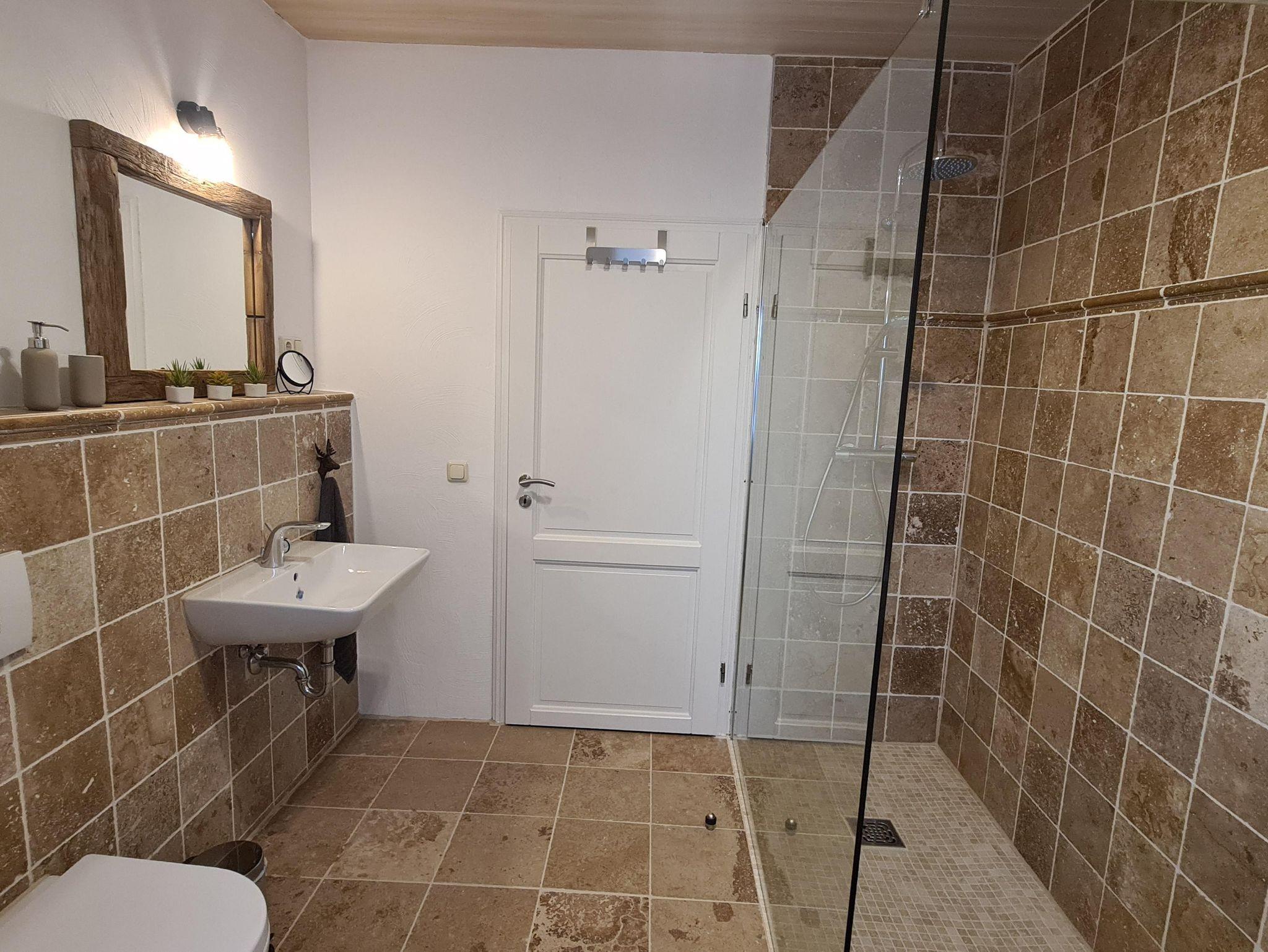 Im Jahr 1999 bauten wir diesen Gebäudeteil zu einer Mietwohnung aus. Zwischen dem Obergeschoss und dem Dachgeschoss wurde eine Zwischendecke eingezogen und es wurde ein komplett neues Dach aufgesetzt. 2021 begannen wir dann, diese Wohnung vollständig zu renovieren und zu einer neuen Ferienwohnung umzubauen. Auch hierbei legten wir wieder großen Wert auf natürliche Baustoffe sowie auch auf die Wiederverwertung alter Baustoffe: Sämtliche Wände wurden mit Lehmputz neu verputzt, der große Wohn-, Ess- und Küchenbereich wurde mit jahrhundertealten Tonfliesen neu gefliest, im Flur wurden ausgebaute Zementfliesen aus einem alten Westerwälder Fachwerkhaus neu verlegt und im Wohnzimmer wurde eine Fachwerkwand als Raumteiler bestehend aus alten Balken aus unserem Scheunenabriss sowie alten Ziegelsteinen aus einem Hausabriss erstellt. Auf die Nachhaltigkeit legten wir auch bei der Küche großen Wert, denn auch hier haben wir eine ältere Einbauküche mit massiven Eichenfronten wieder zu neuem Leben erweckt: Eingerahmt in Balken aus unserem Scheunenabriss, zum Teil mit den alten Ziegeln ausgemauert und vollständig mit Kreidefarbe versehen sieht sie aus wie neu. Des Weiteren kamen bei der Wohnungsrenovierung Antikmarmor- bzw. Travertinmarmorfliesen in verschiedenen Farben und Größen zum Einsatz (Schlafzimmer und Bad).