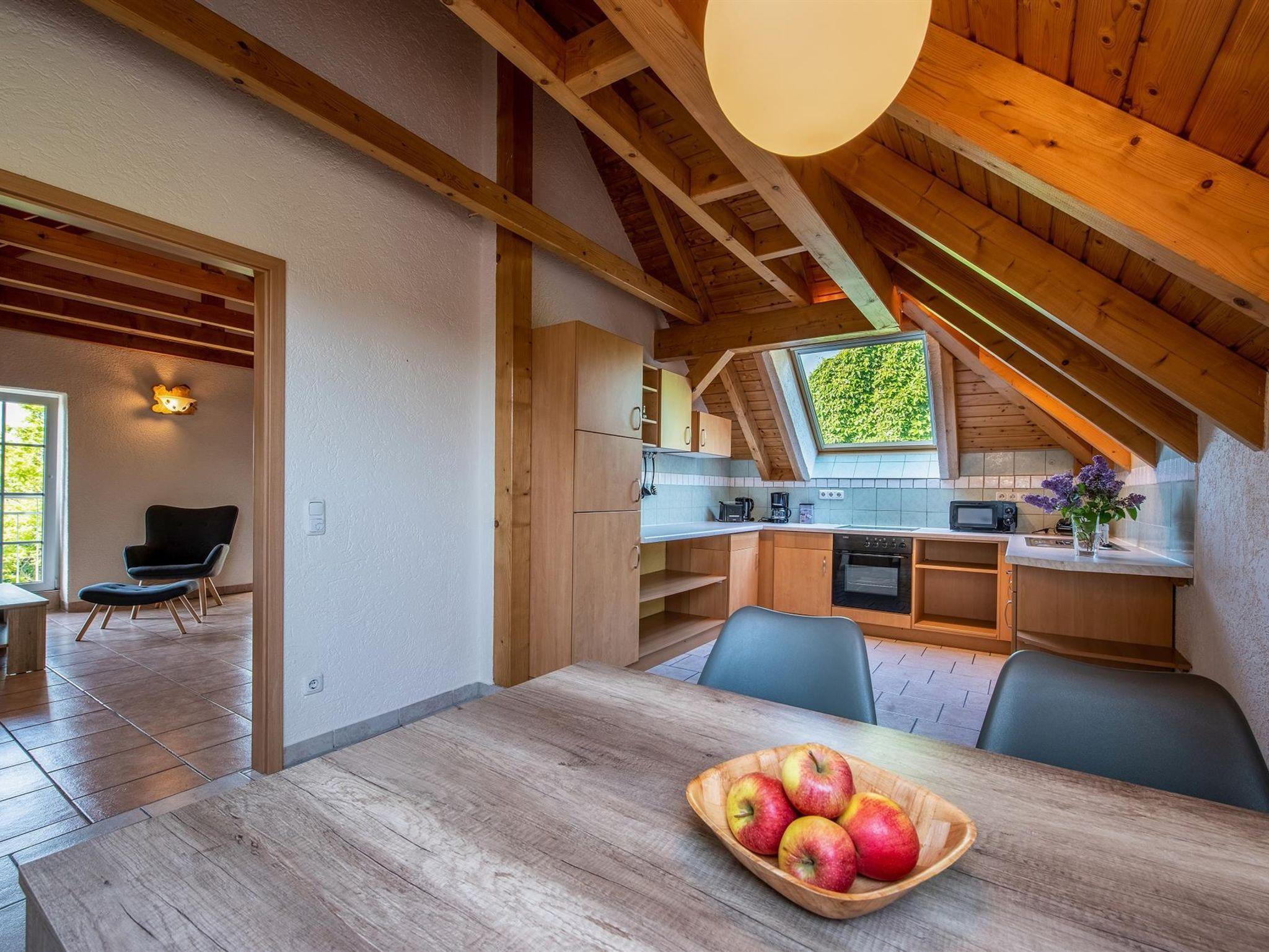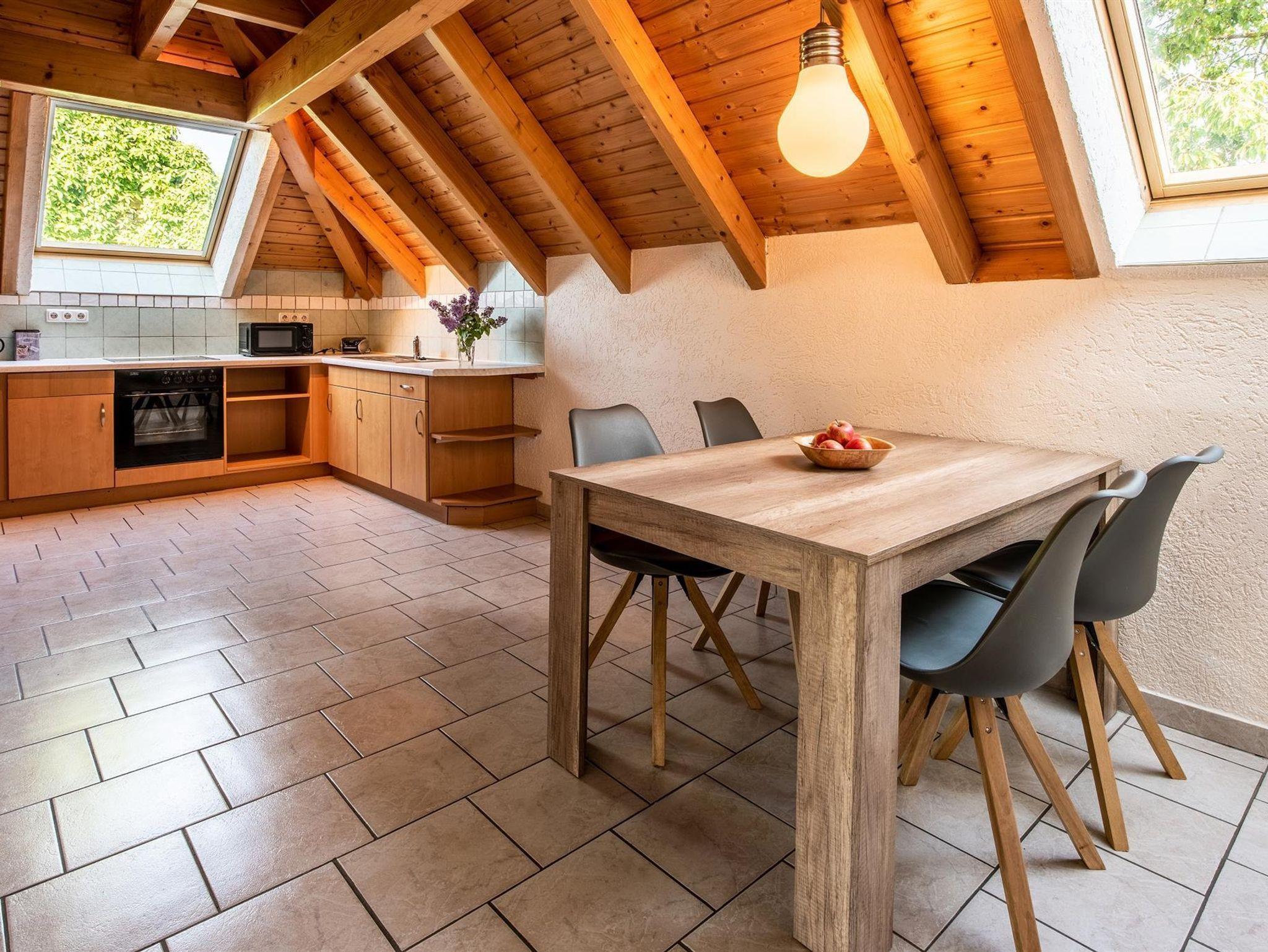 Die Küche ist für Selbstversorger und mit Herd, Backofen, Kühlschrank und Mikrowelle bestens ausgestattet. Für einen guten Start in den Tag lädt die Ausstattung mit Kaffeemaschine, Wasserkocher und Toaster sowie der große Esstisch mit vier Stühlen zu einem ausgedehnten und entspannten Frühstück ein.
