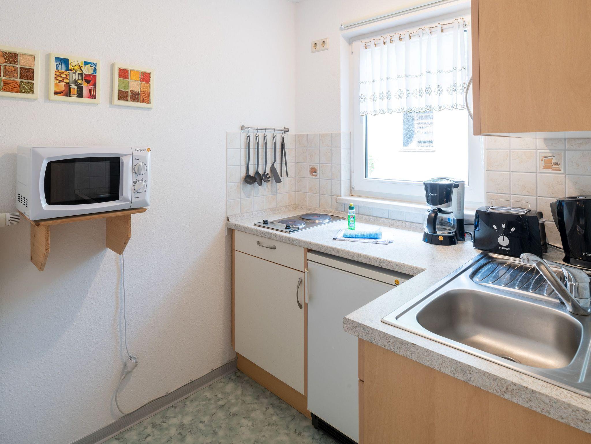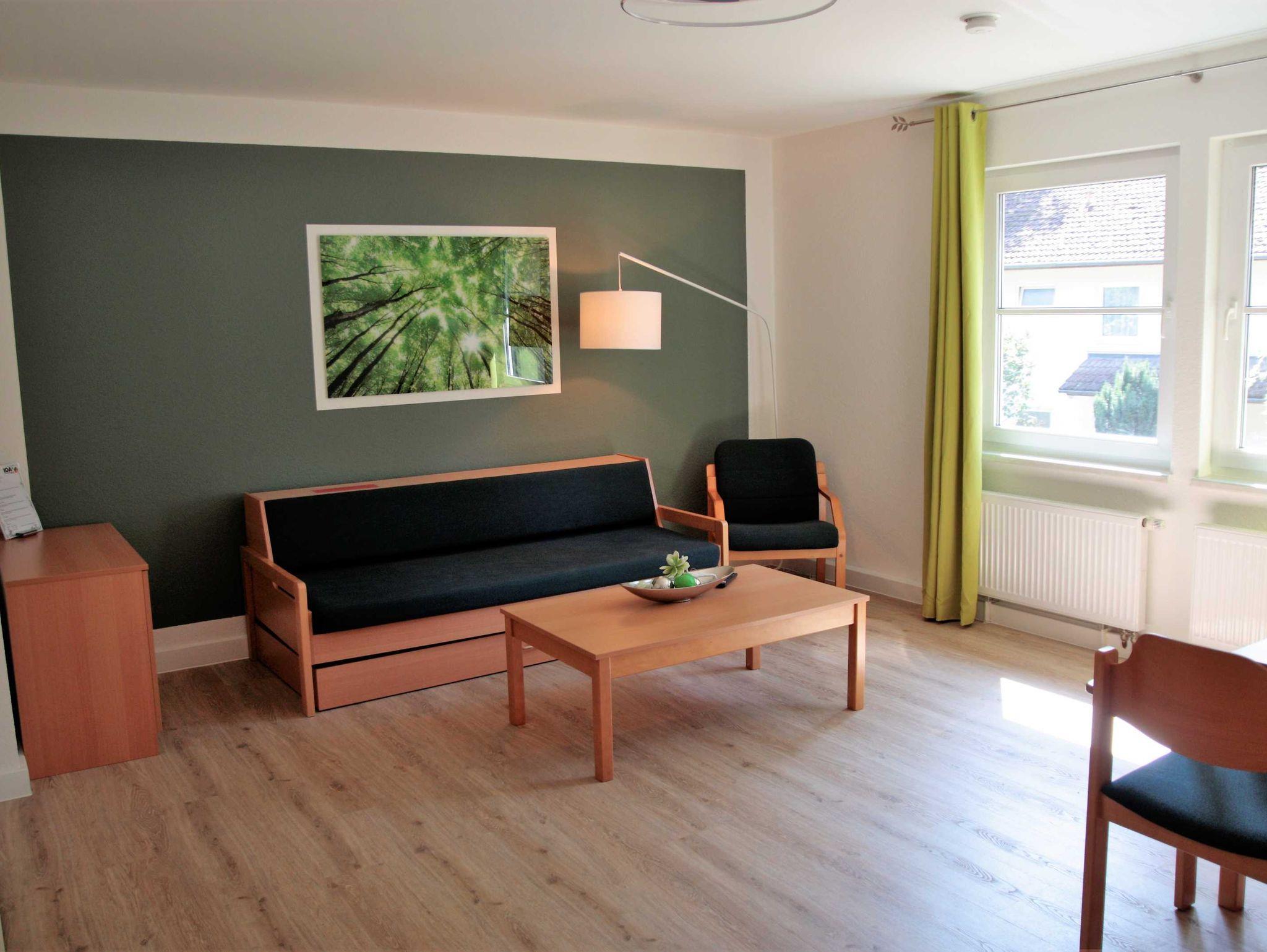 Die Ferienwohnung ist modern möbliert und voll ausgestattet mit einer Einbauküche, Badezimmer und TV. Außerdem verfügt die Ferienwohnung u. a. über schadstoffarme Bodenbeläge (Parkett/ Linoleum). Unsere Gäste können sich in der Ferienwohnung selbst verpflegen und selbst um die Raumpflege kümmern, oder sich nach Absprache von der alltäglichen Hausarbeit entlasten lassen, inklusive Teil- oder Vollverpflegung. Muss während des Aufenthalts im Ferienhaus Wäsche erledigt werden, so stehen hierfür auf dem IDA Gelände natürlich auch Waschmaschinen und Trockner zur Verfügung.