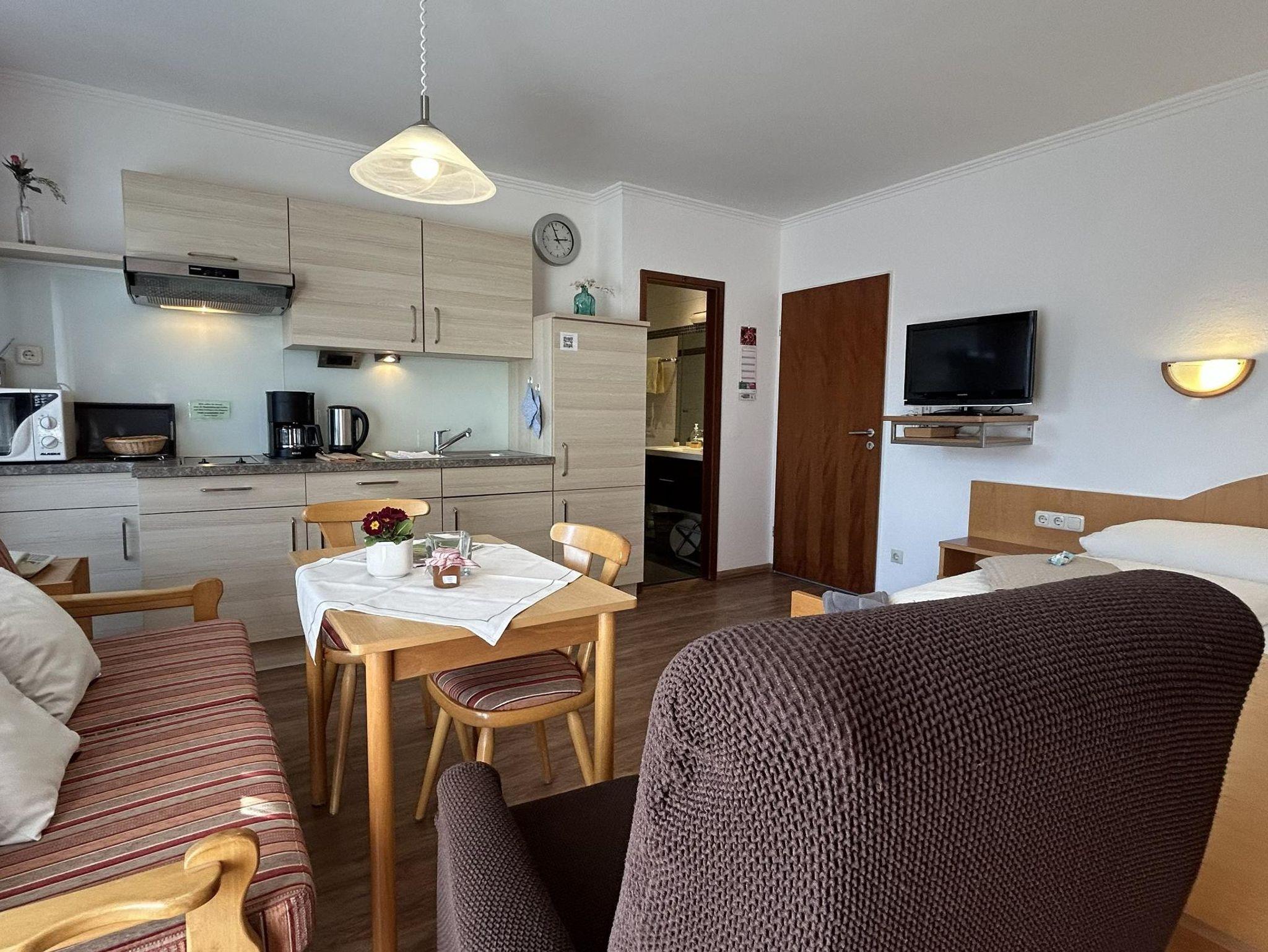 Helles Einraumappartement mit ca. 32 qm für 2 Personen im 1. Stock. Der Südbalkon sorgt für sonnige Stunden, während die neue Einbauküche und das modernisierte Bad mit WC ein hohes Maß an Wohnkomfort bieten. Kostenloses W-LAN und SAT-TV machen dieses Appartement zu einem gemütlichen Rückzugsort nach einem erlebnisreichen Tag.