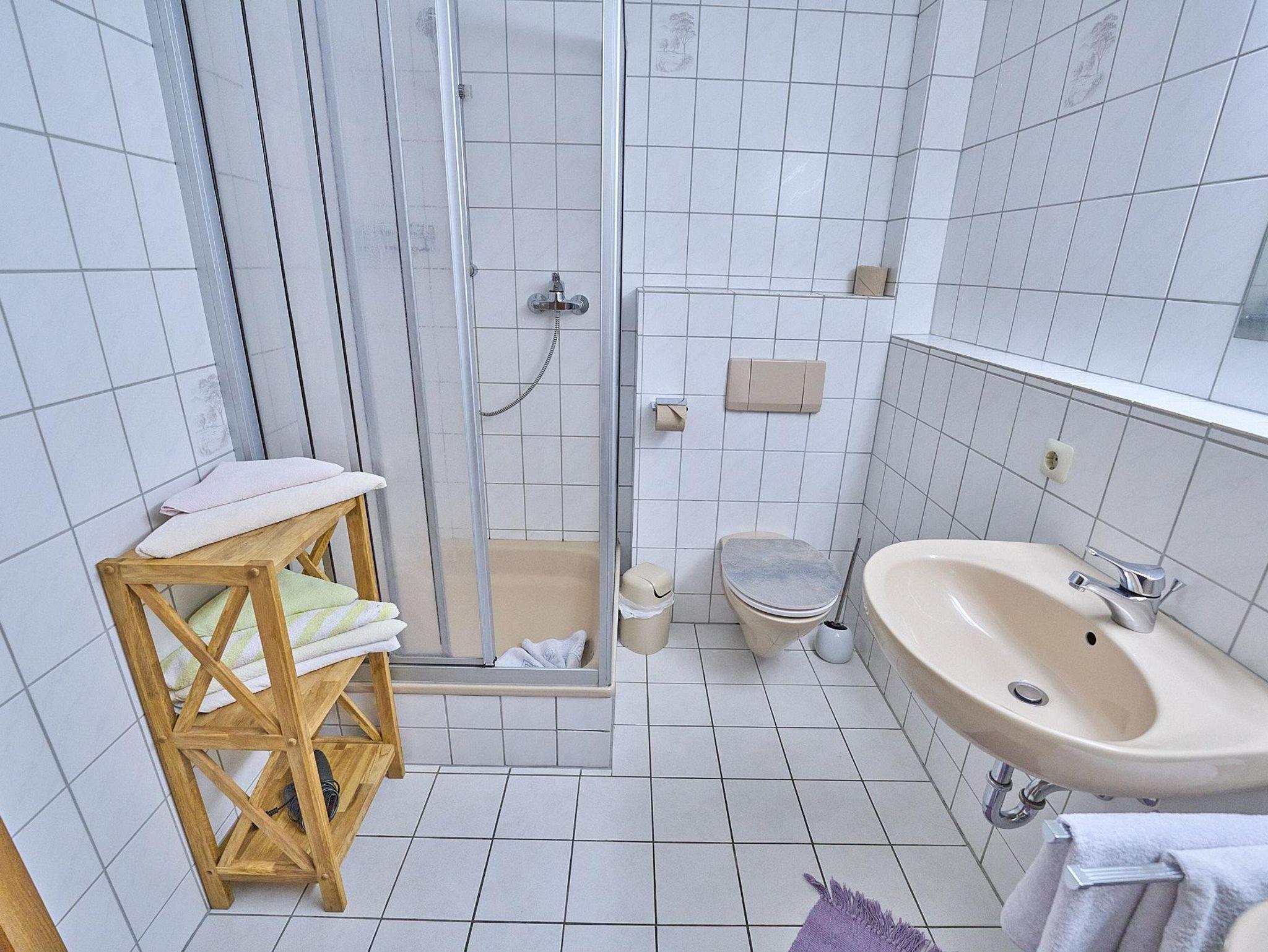 Bad/WC mit Dusche und Doppelwaschbecken (Haarfön)