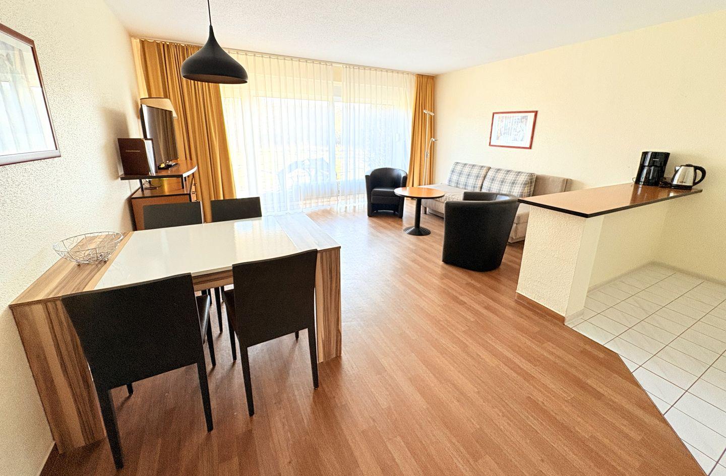 Der offene Wohnbereich mit bequemer Doppelschlafcouch und Sesseln lädt zum Entspannen ein. Dank der großen bodentiefen Fenster ist der Raum lichtdurchflutet und vermittelt ein angenehmes Wohngefühl.