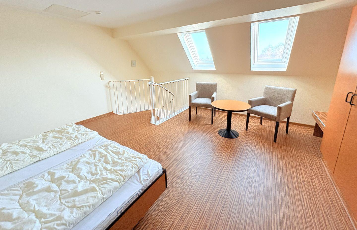 Über eine Wendeltreppe erreichen Sie das Dachgeschoss mit einem weiteren offenen Schlafbereich, ausgestattet mit Doppelbett und gemütlicher Sitzecke.