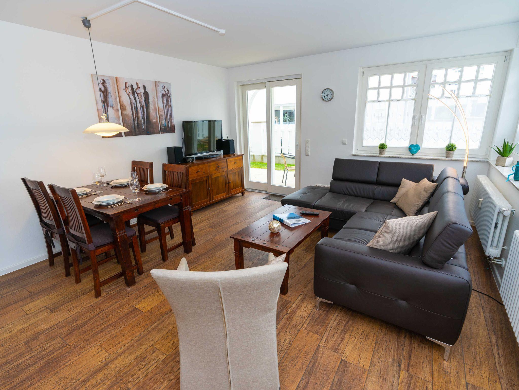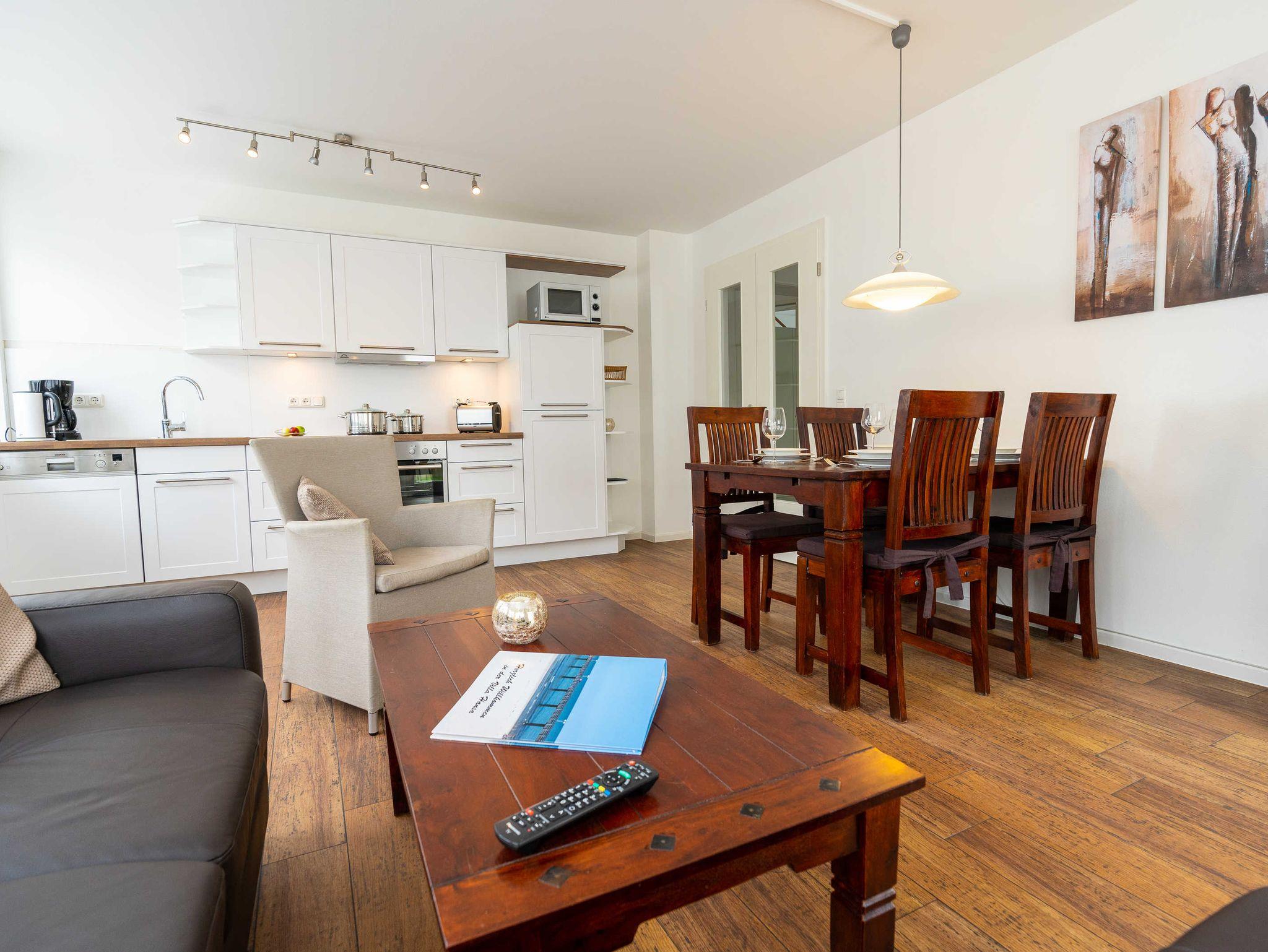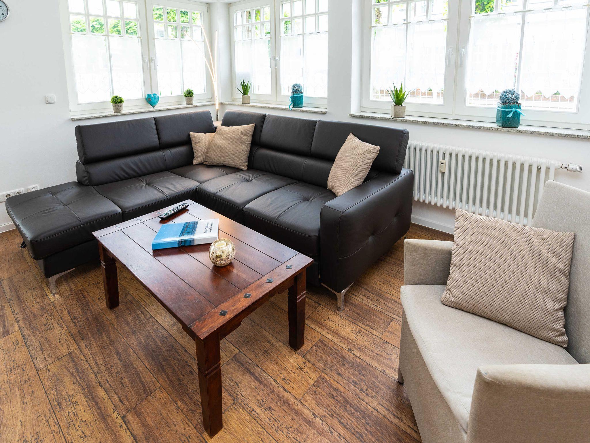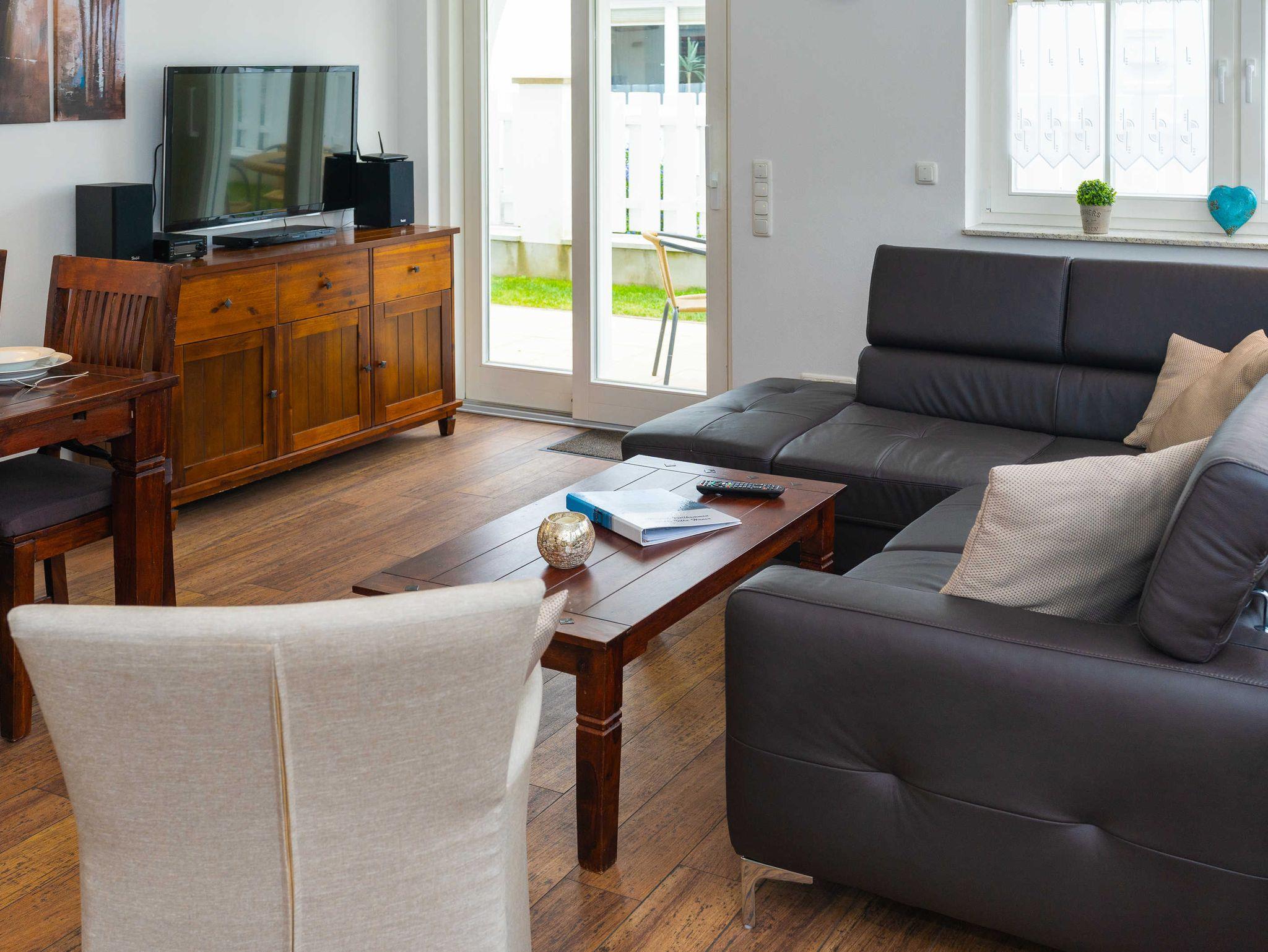 Ein geschmackvoll eingerichtetes Wohnzimmer mit hochwertiger Schlafmöglichkeit sorgt in der Komfort-Ferienwohnung Hansa für Ihre Wohlfühlatmosphäre. Es schließt sich eine nach Süd-Westen ausgerichtete Terrasse an, auf der sich der Sonnenschein fast den ganzen Tag über genießen lässt. Zu der komplett ausgestatteten Küche im Landhausstil gehören ein Kühlschrank mit Gefriermöglichkeit, ein Backofen, eine Mikrowelle und ein Geschirrspüler. Zwei gemütliche Schlafzimmer sind mit je einem Boxspring-Doppelbett eingerichtet. Des Weiteren gehören zwei gepflegte Duschbäder zur Ferienwohnung.