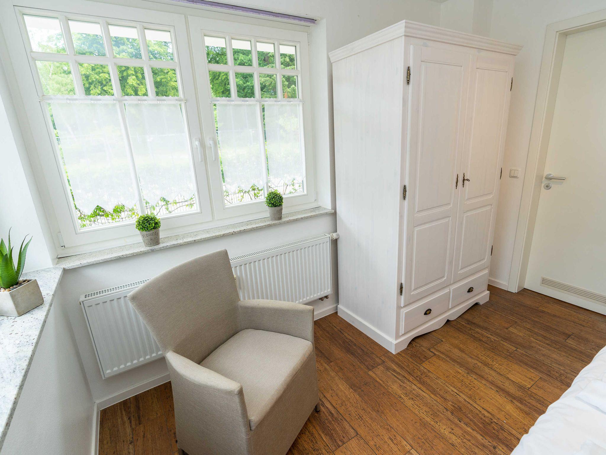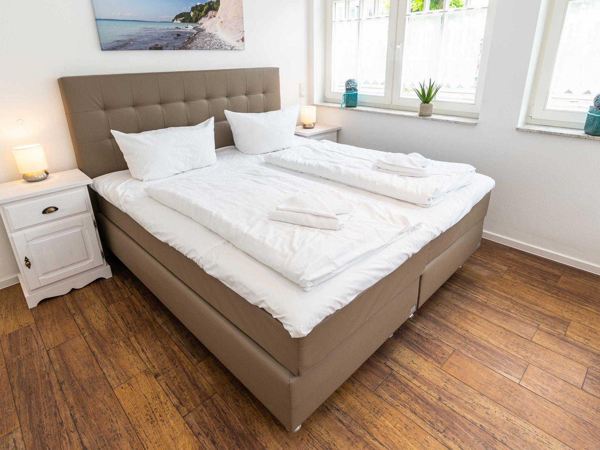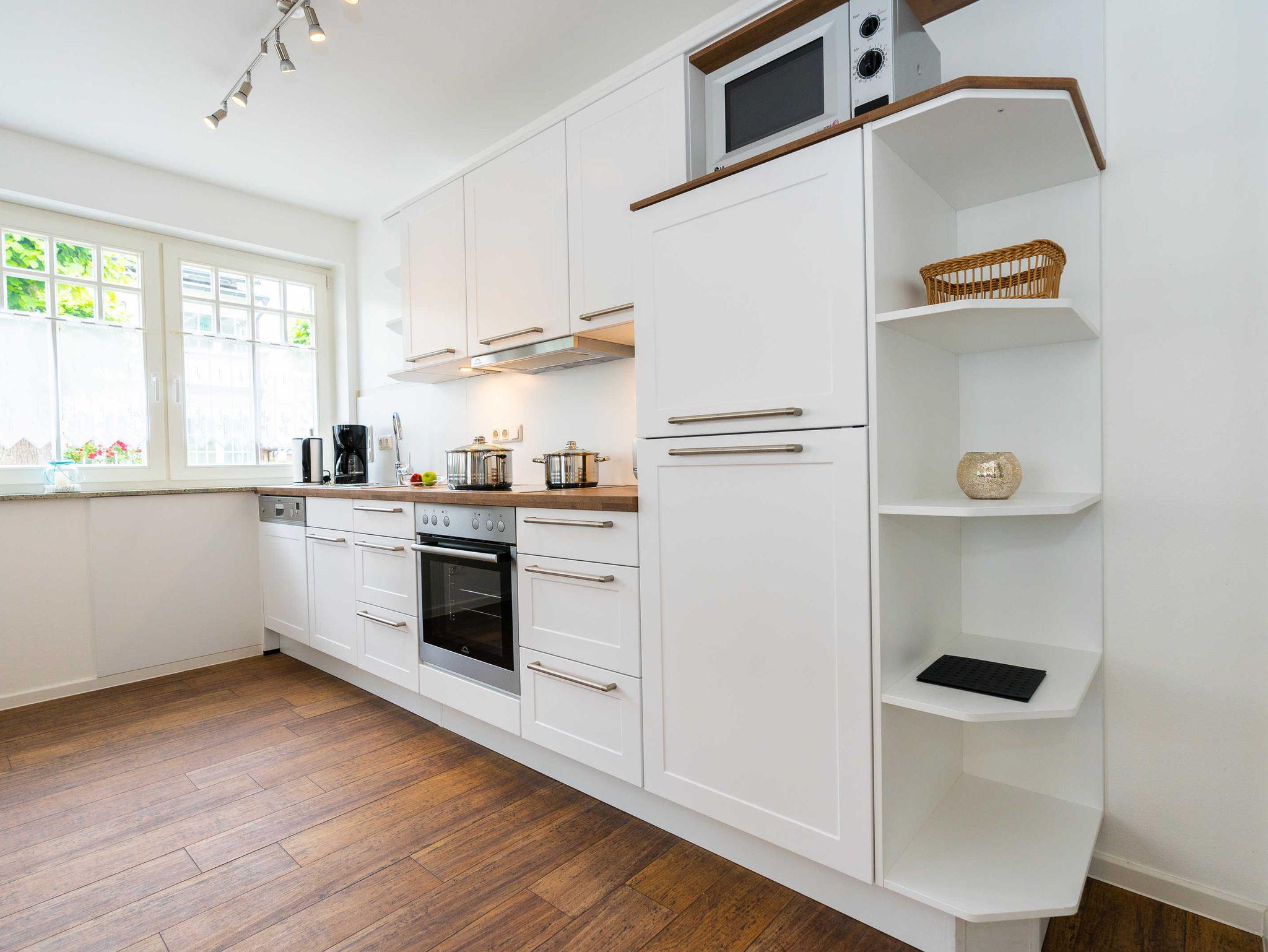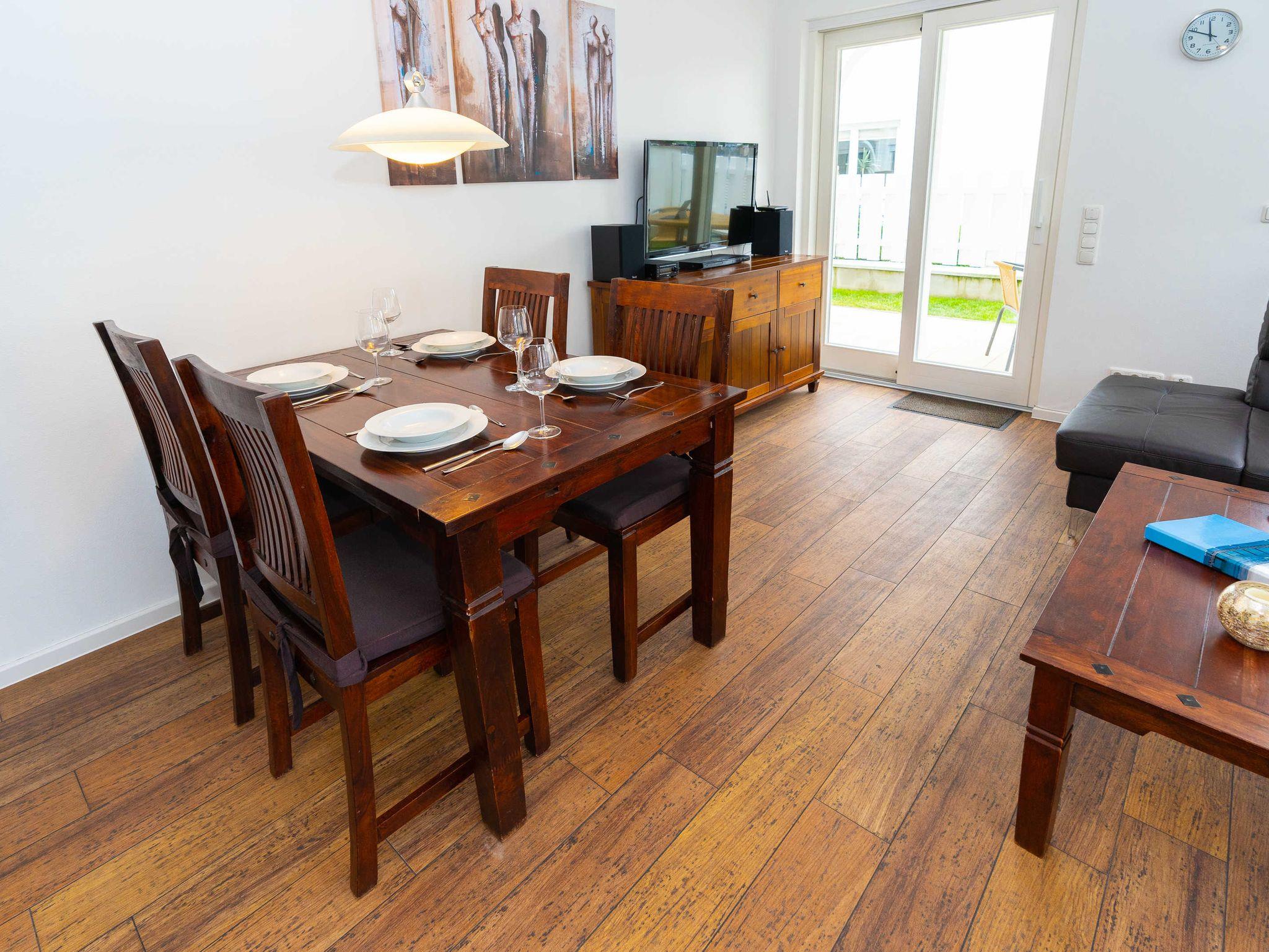 Ein geschmackvoll eingerichtetes Wohnzimmer mit hochwertiger Schlafmöglichkeit sorgt in der Komfort-Ferienwohnung Hansa für Ihre Wohlfühlatmosphäre. Es schließt sich eine nach Süd-Westen ausgerichtete Terrasse an, auf der sich der Sonnenschein fast den ganzen Tag über genießen lässt. Zu der komplett ausgestatteten Küche im Landhausstil gehören ein Kühlschrank mit Gefriermöglichkeit, ein Backofen, eine Mikrowelle und ein Geschirrspüler. Zwei gemütliche Schlafzimmer sind mit je einem Boxspring-Doppelbett eingerichtet. Des Weiteren gehören zwei gepflegte Duschbäder zur Ferienwohnung.