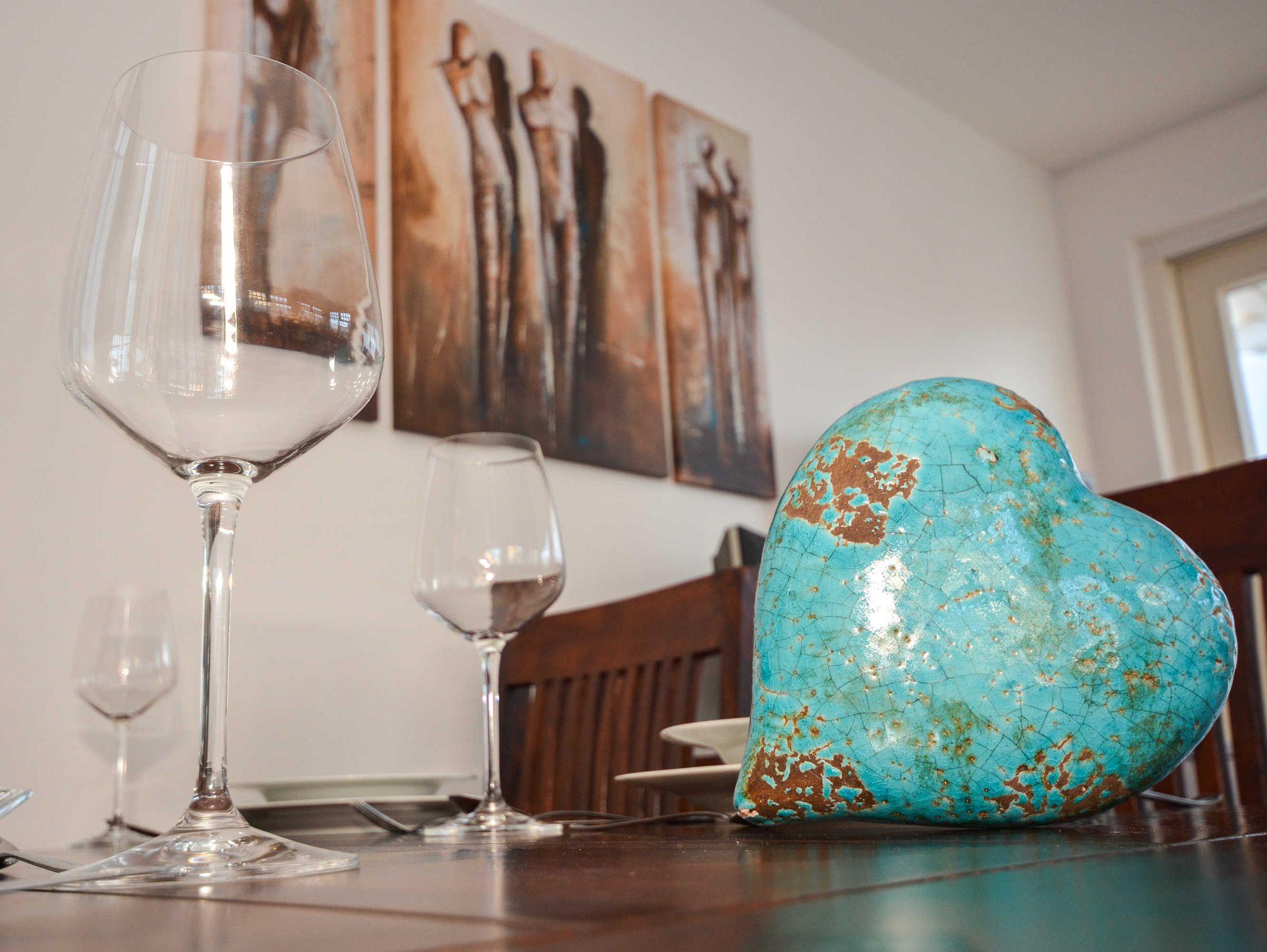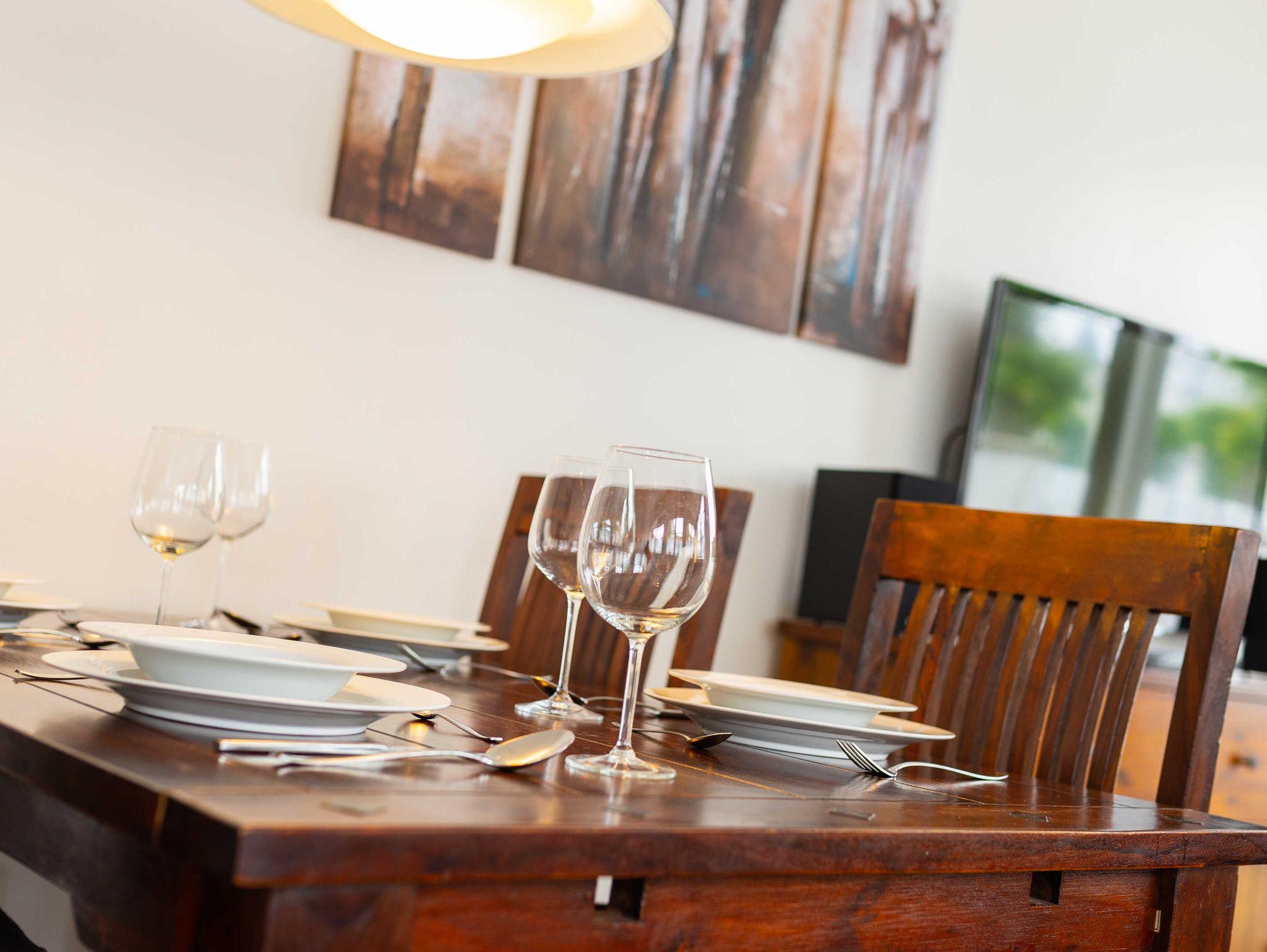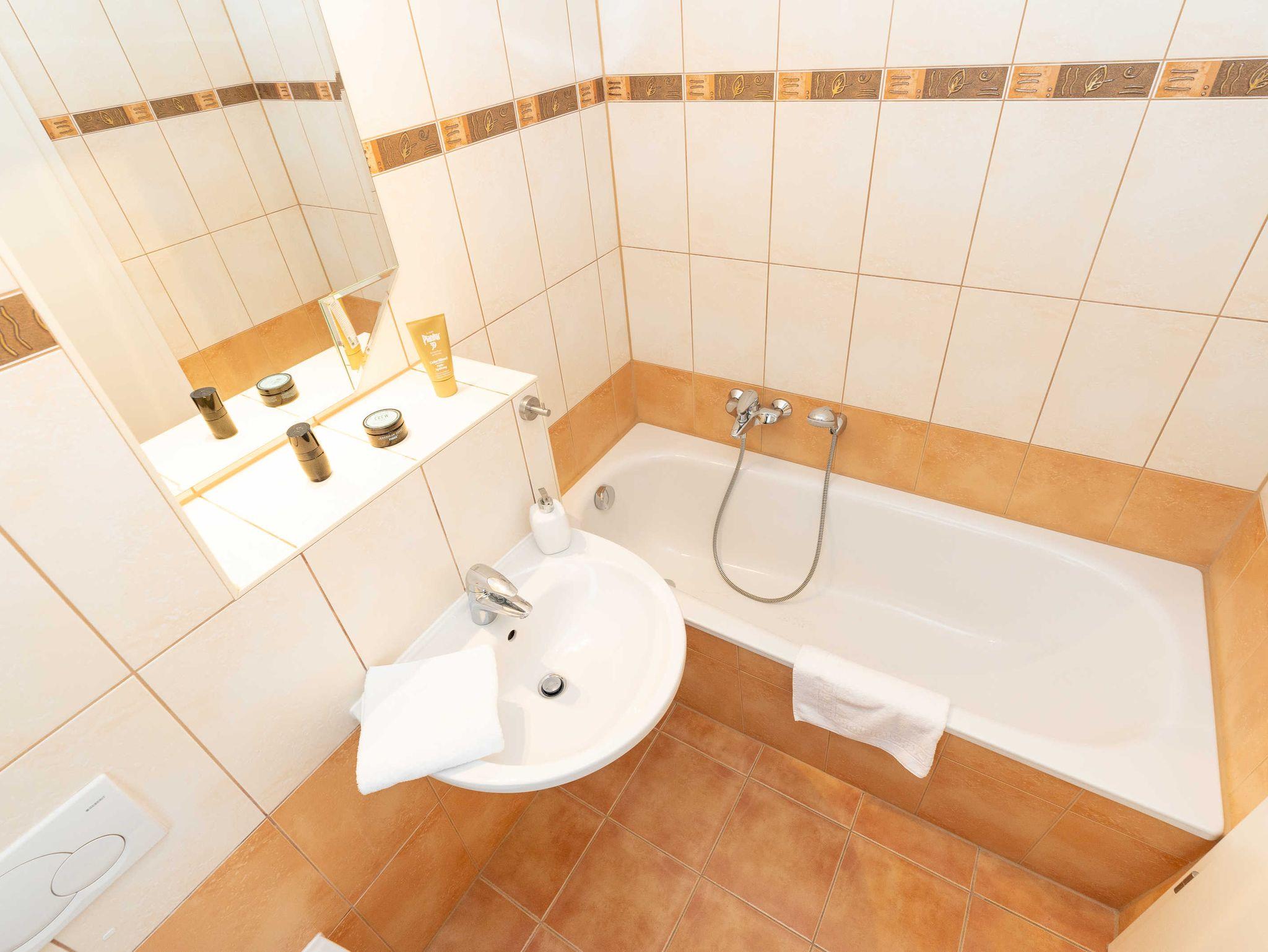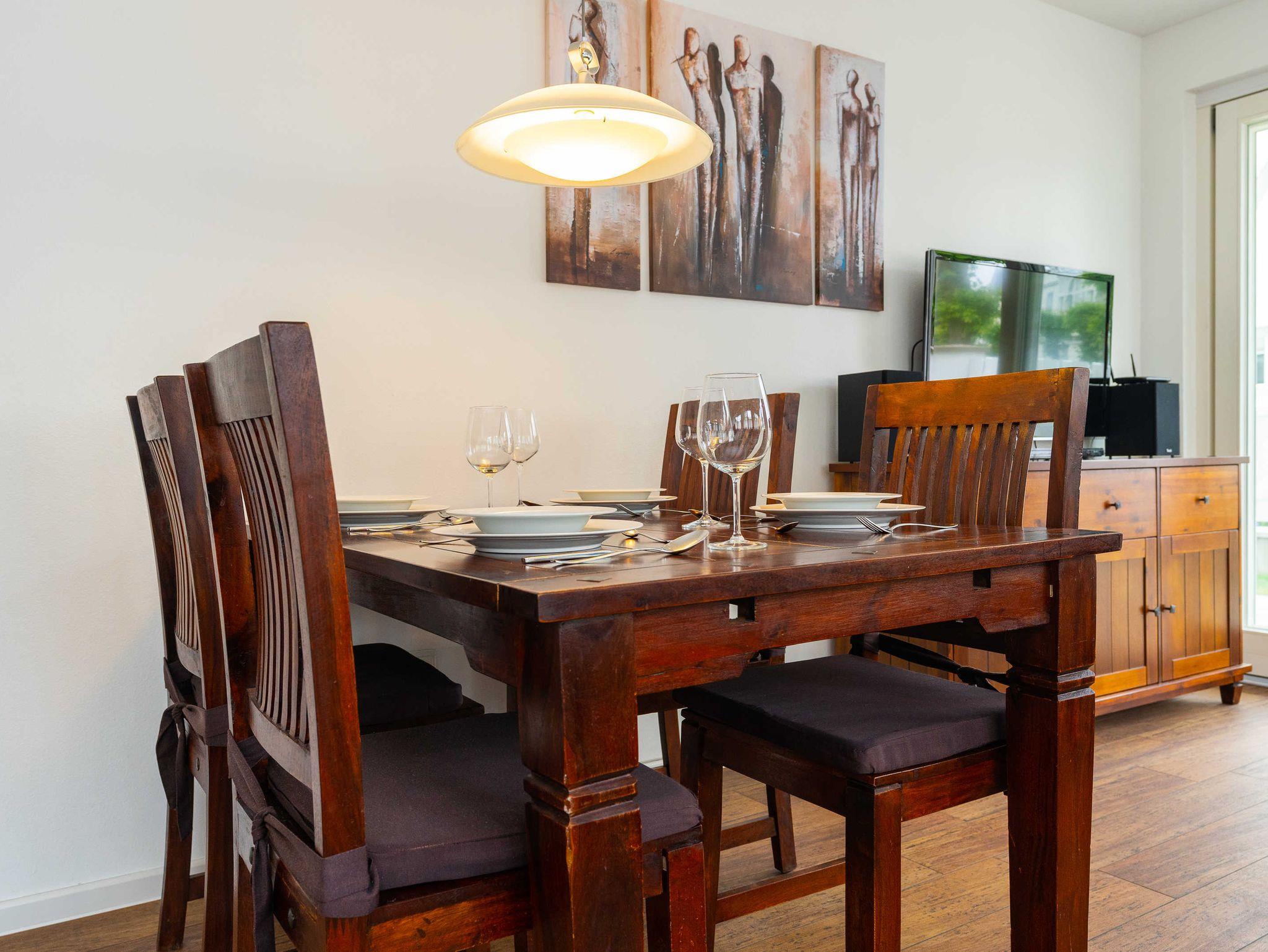 Ein geschmackvoll eingerichtetes Wohnzimmer mit hochwertiger Schlafmöglichkeit sorgt in der Komfort-Ferienwohnung Hansa für Ihre Wohlfühlatmosphäre. Es schließt sich eine nach Süd-Westen ausgerichtete Terrasse an, auf der sich der Sonnenschein fast den ganzen Tag über genießen lässt. Zu der komplett ausgestatteten Küche im Landhausstil gehören ein Kühlschrank mit Gefriermöglichkeit, ein Backofen, eine Mikrowelle und ein Geschirrspüler. Zwei gemütliche Schlafzimmer sind mit je einem Boxspring-Doppelbett eingerichtet. Des Weiteren gehören zwei gepflegte Duschbäder zur Ferienwohnung.
