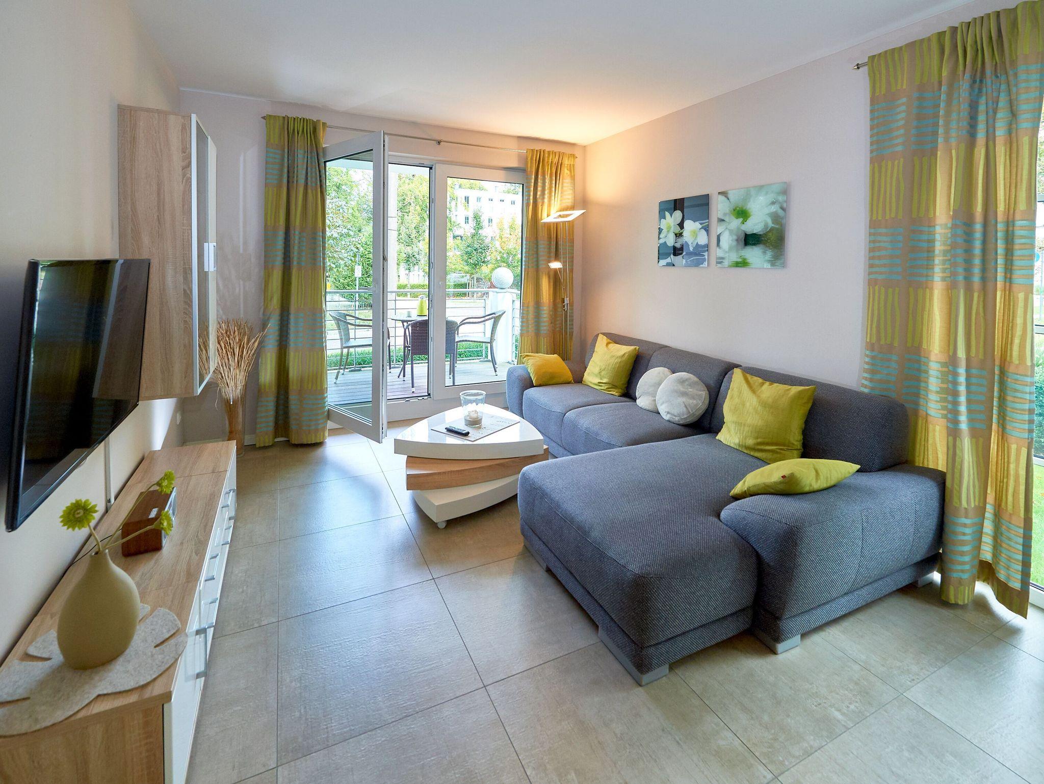 Das großzügige Wohn- und Esszimmer mit integrierter Küche ist geschickt in die verschiedenen Funktionsbereiche aufgeteilt. Bodentiefe Fenster, angenehme Farben, chice Dekorationen und die moderne Polstereckgruppe (mit Schlaffunktion 1,30 x 2,00m) vermitteln sofort ein Wohlgefühl. Für die mediale Unterhaltung stehen ein 55 Zoll Smart-TV, ein Tischradio und natürlich auch kostenfreies W-LAN zur Verfügung.