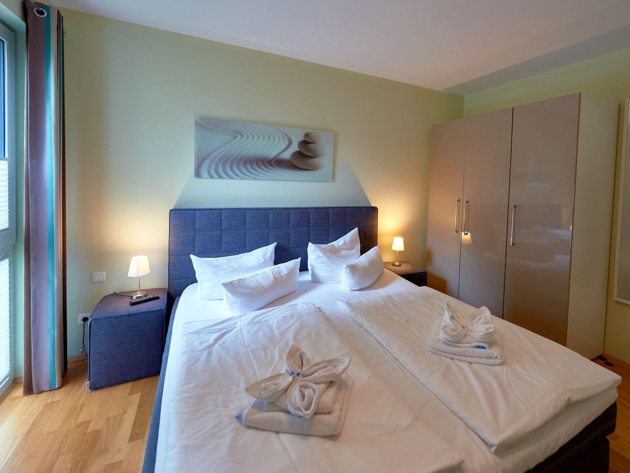 Im separaten Schlafzimmer mit großem Kleiderschrank und zusätzlichen Fernseher versprechen ein exklusives Boxspringbett in Komforthöhe von 55 cm sowie ein zusätzlicher Sessel mit Schlaffunktion (0,80 x 1,90m) für eine Person süße Träume. Allergiker freundliche Matratzen, Bettdecken und Kopfkissen sorgen für besten Schlafkomfort.