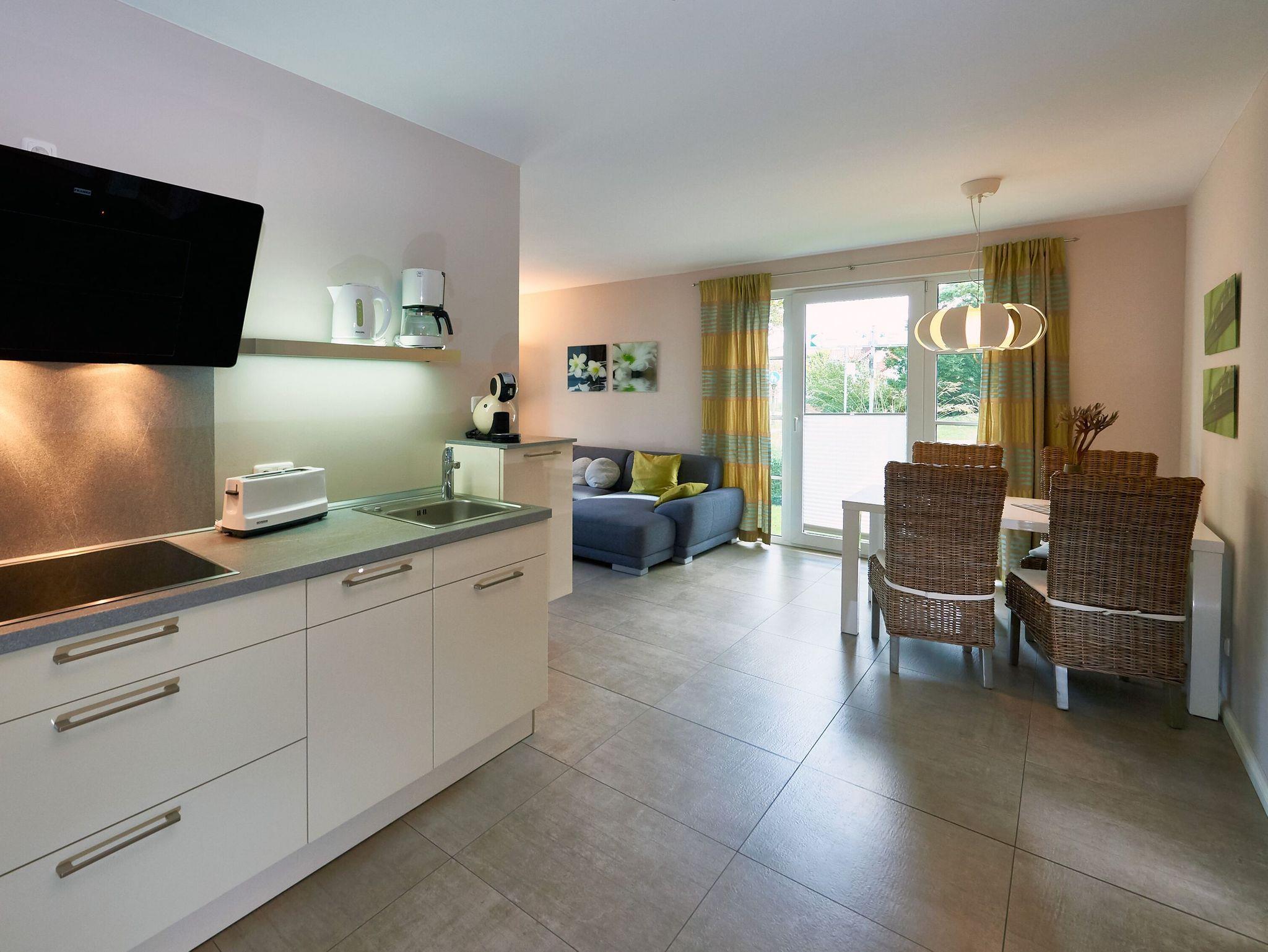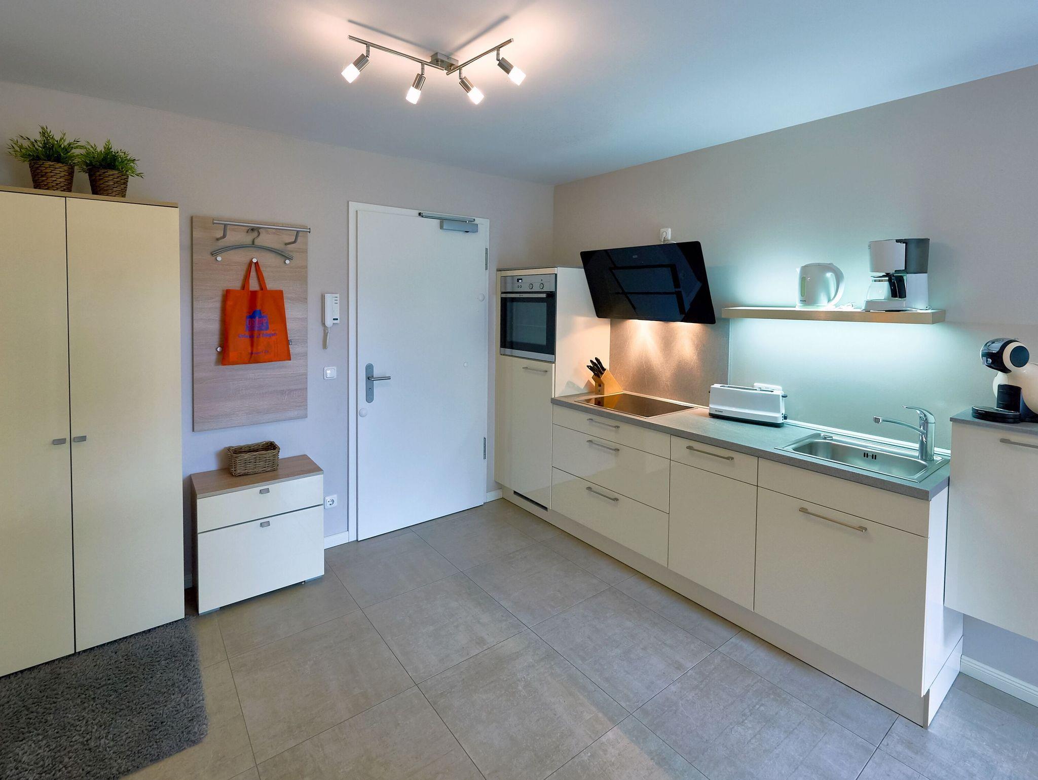 Die voll ausgestattete Küche überzeugt mit einem Ceranherd inkl. Abzugshaube, einem hochgestelltem Backofen, einem Kühlschrank mit Gefrierfach, einem Geschirrspülautomat sowie Kaffeemaschine, einer Dolce-Gusto Espressomaschine, Toaster, Wasserkocher etc. Der Esstisch bietet vier Personen Platz zum gemeinsamen Dinieren. Bis zum nächsten Bäcker für die frischen Frühstücksbrötchen sind es übrigens nur wenige Gehminuten.