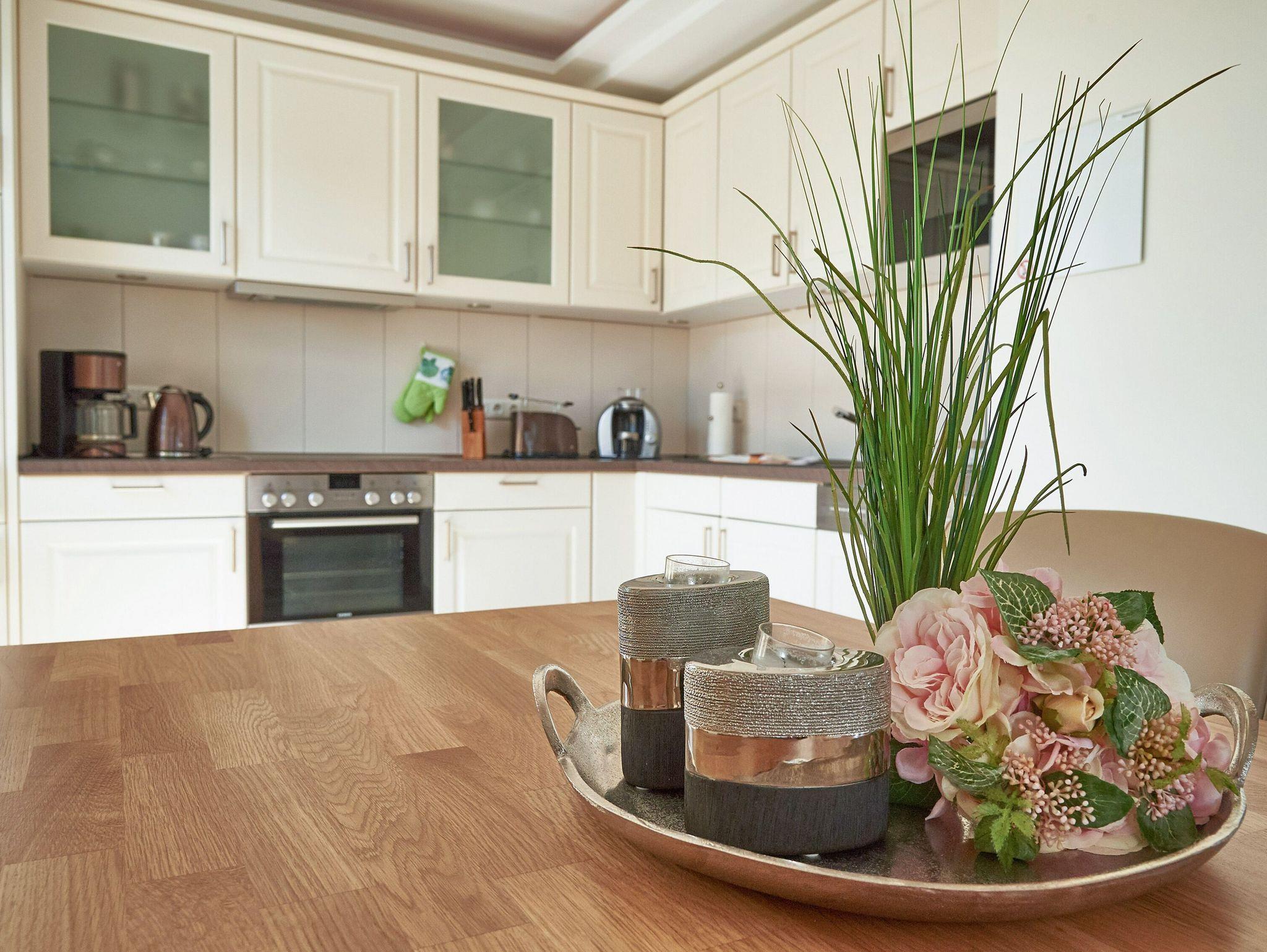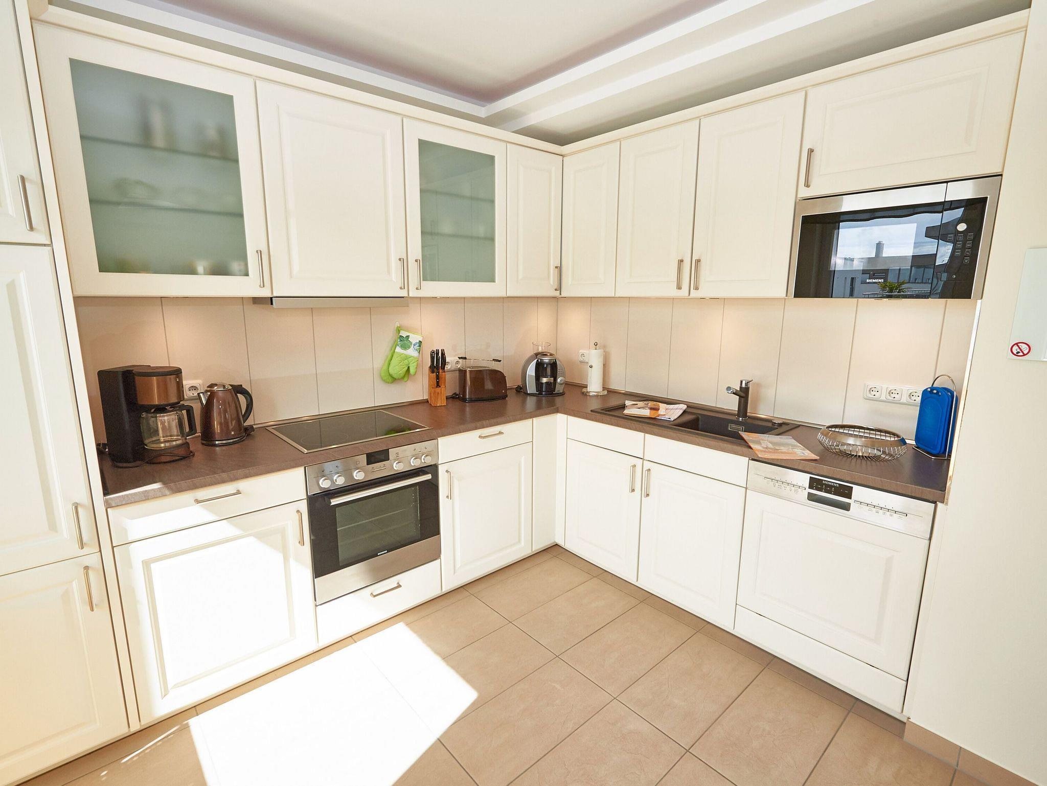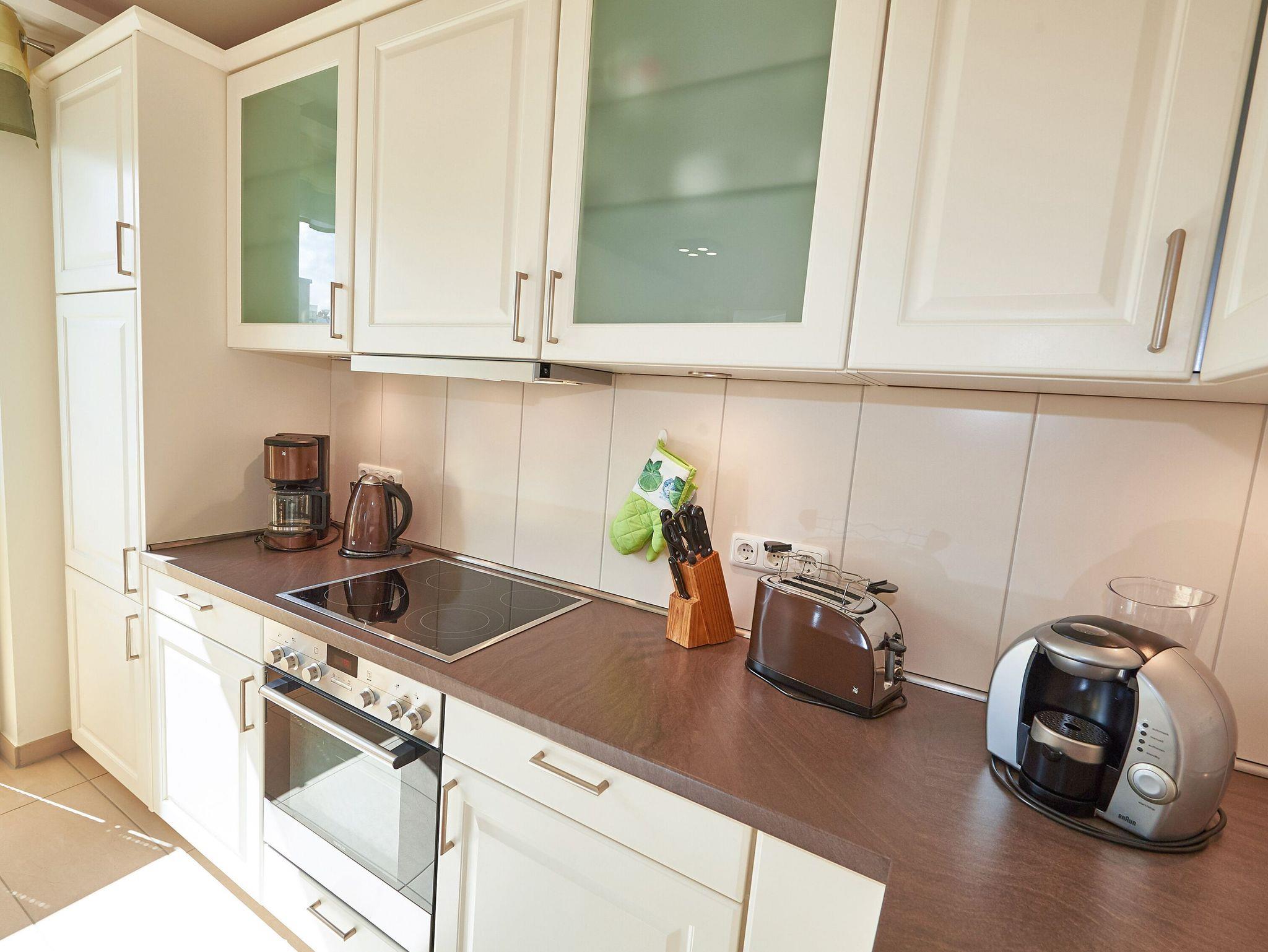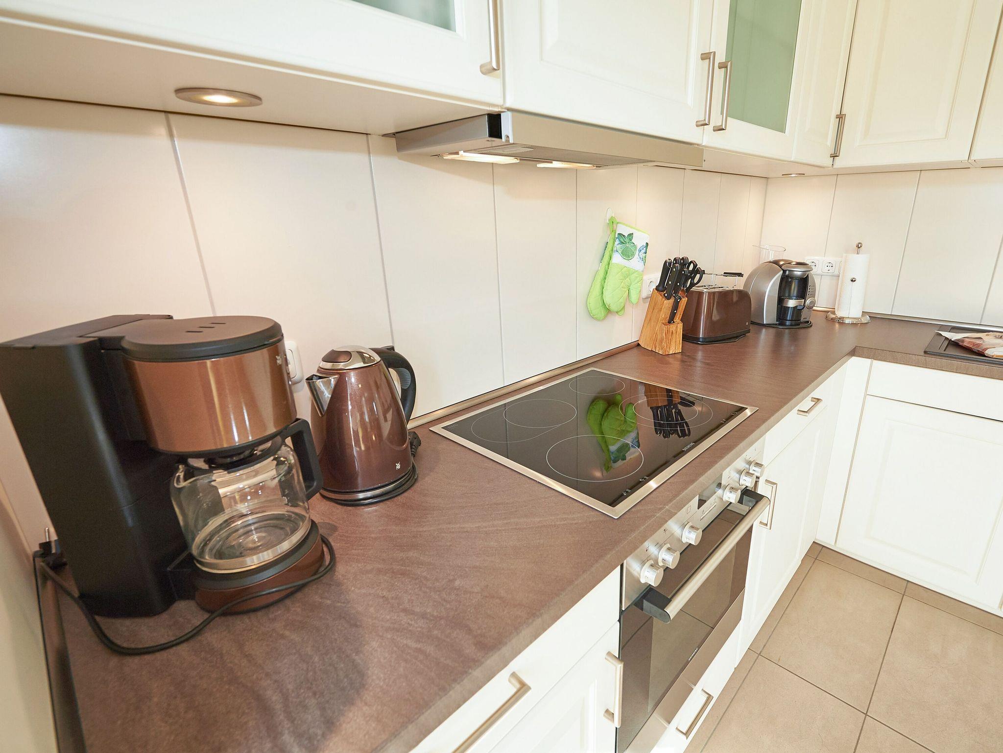 Vom Eingangsflur aus gelangen Sie in den modern ausgestatteten Wohnbereich mit zwei hellen Ledercouchen (eine davon ist eine hochwertige Schlafcouch für zwei Personen) sowie zum Essbereich mit der modernen Einbauküche. Die geflieste Küche ist mit einem Kühlschrank mit Gefrierfach, einem Backofen, einem 4-Platten-Cerankochfeld, einer Mikrowelle und einer Geschirrspülmaschine ausgestattet. Eine Tassimo-Kaffeemaschine sowie diverses Küchenaccessoires (Eierkocher, Toaster, Wasserkocher, Kaffeemaschine, usw.) lassen keinen Komfort vermissen.