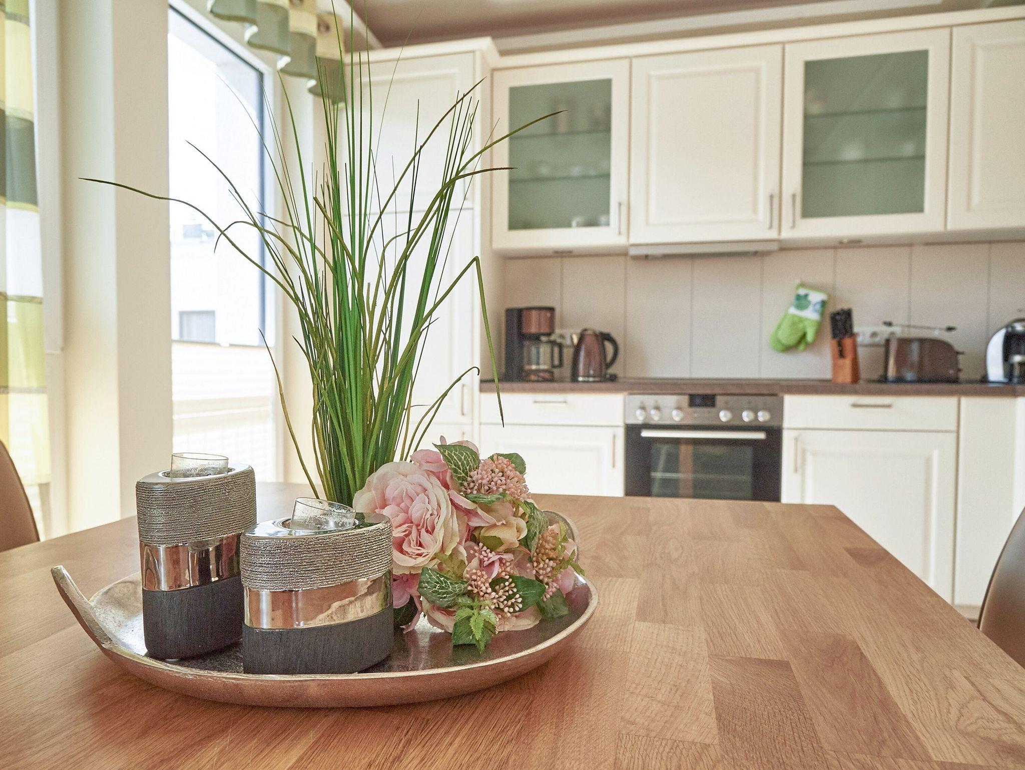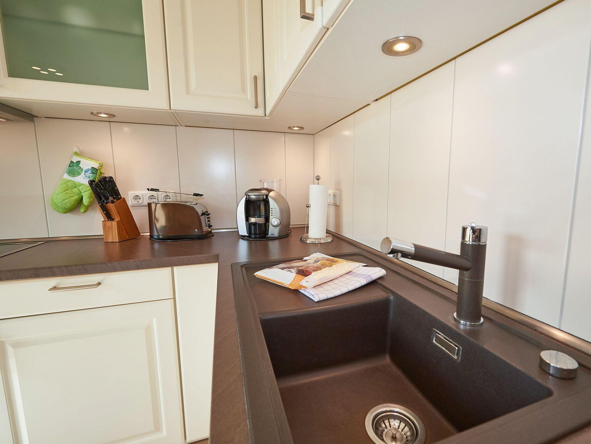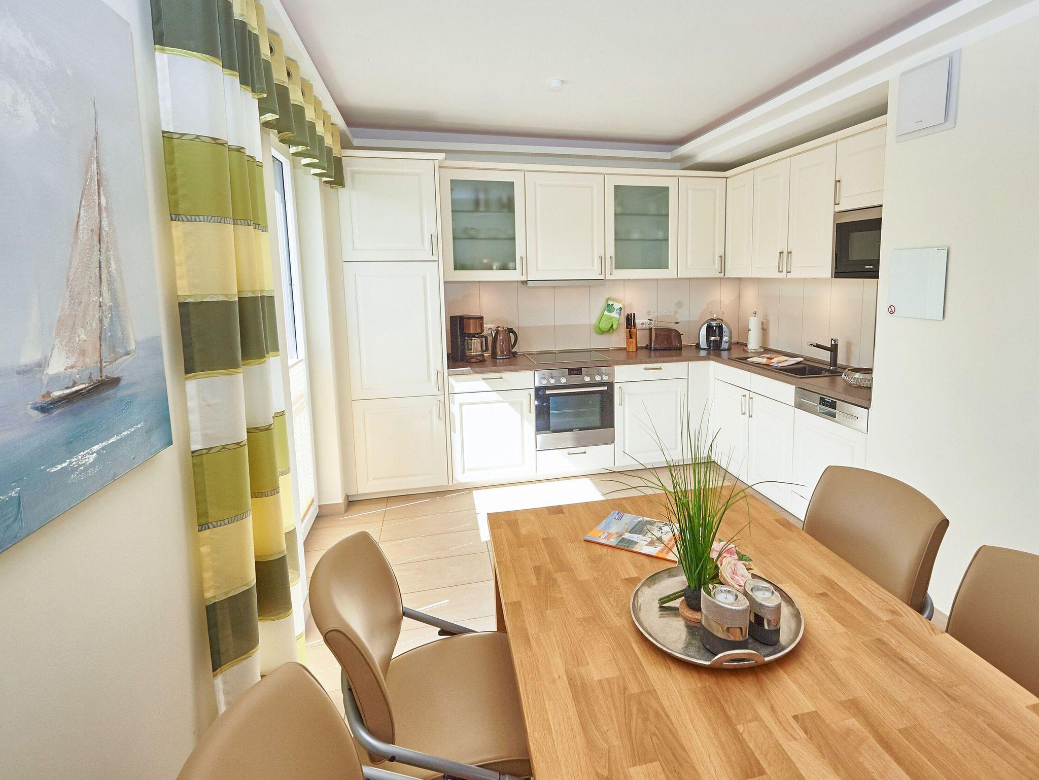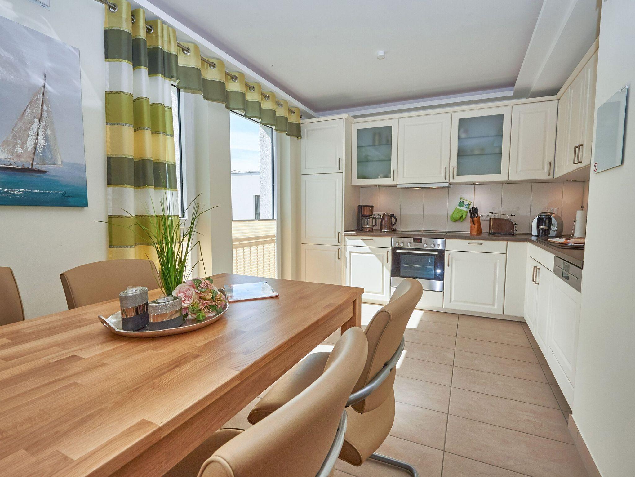 Vom Eingangsflur aus gelangen Sie in den modern ausgestatteten Wohnbereich mit zwei hellen Ledercouchen (eine davon ist eine hochwertige Schlafcouch für zwei Personen) sowie zum Essbereich mit der modernen Einbauküche. Die geflieste Küche ist mit einem Kühlschrank mit Gefrierfach, einem Backofen, einem 4-Platten-Cerankochfeld, einer Mikrowelle und einer Geschirrspülmaschine ausgestattet. Eine Tassimo-Kaffeemaschine sowie diverses Küchenaccessoires (Eierkocher, Toaster, Wasserkocher, Kaffeemaschine, usw.) lassen keinen Komfort vermissen.