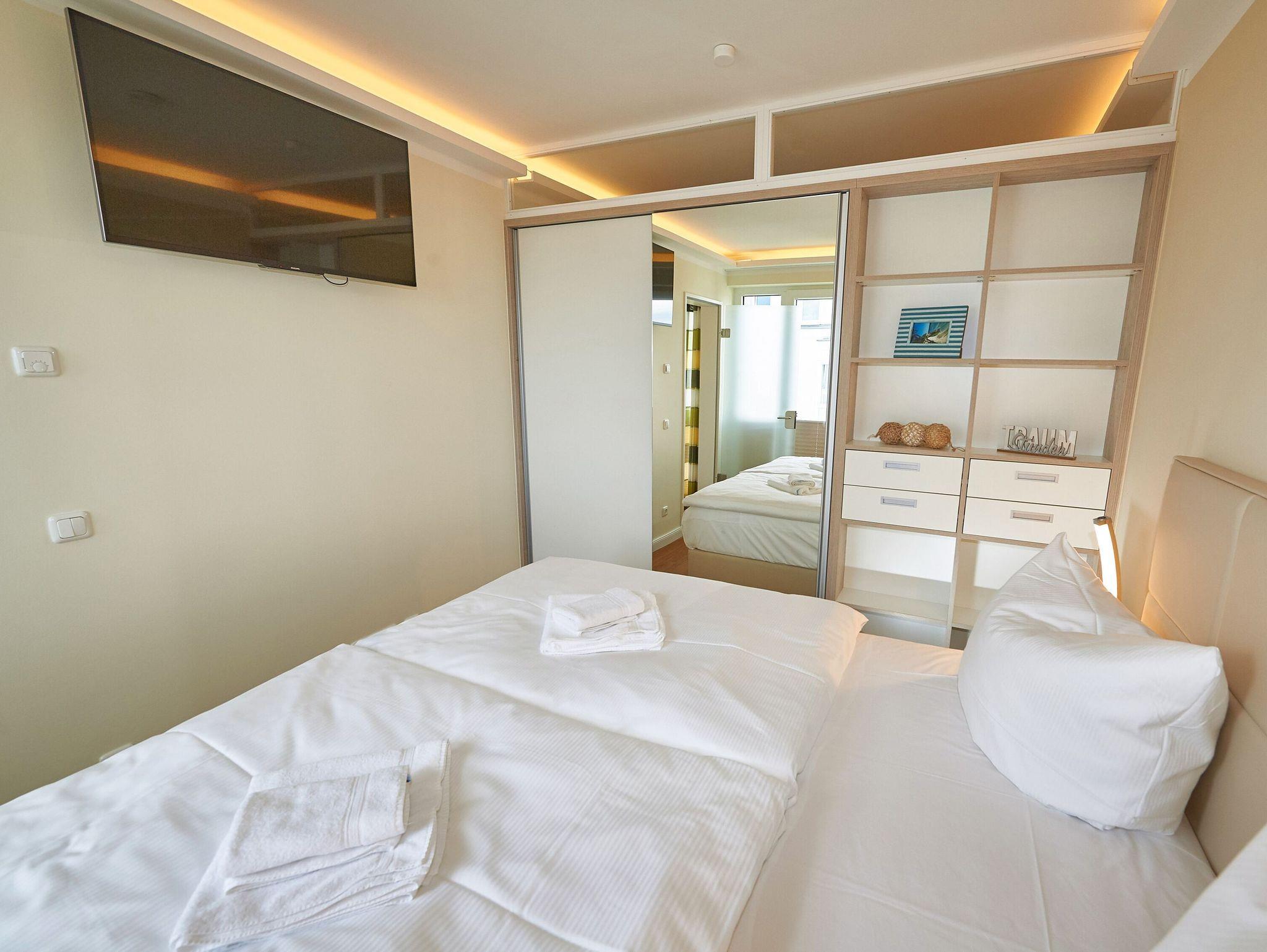 Das Schlafzimmer Ihres Urlaubsdomizils ist mit einem hochwertigen Boxspringbett (1,60 x 2,00 m) sowie einem weiteren Flachbildfernseher mit einer Diagonale von 107 cm und einem Radiowecker ausgestattet. Vom Schlafzimmer aus genießen Sie einen seitlichen Blick auf die rund 200 m entfernte Ostsee.