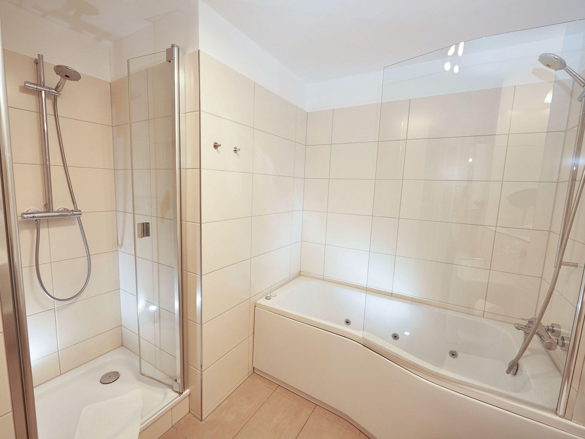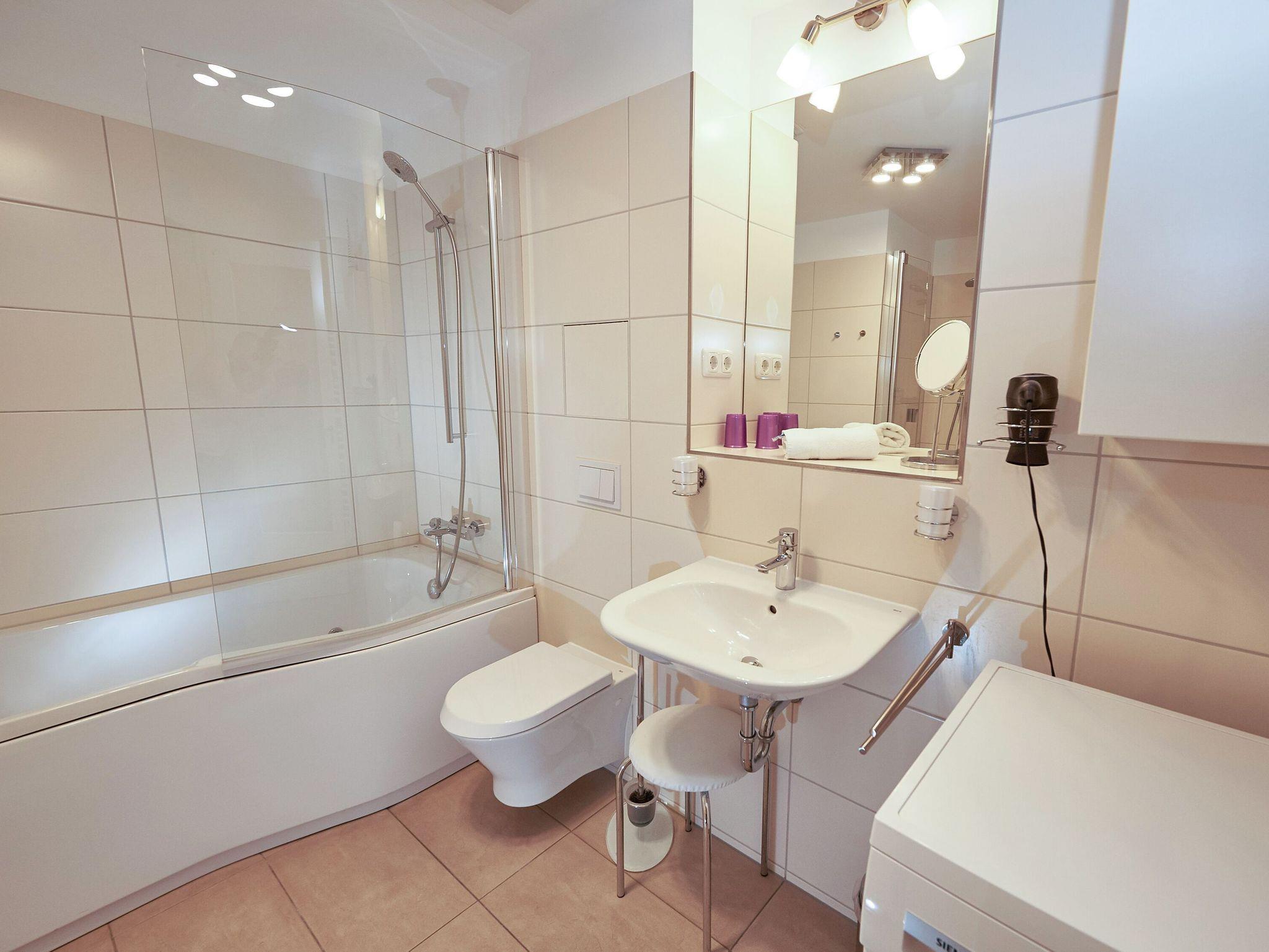 Auch das Badezimmer ist mit Dusche/WC, Badewanne, Fön und Schminkspiegel bestens ausgestattet.