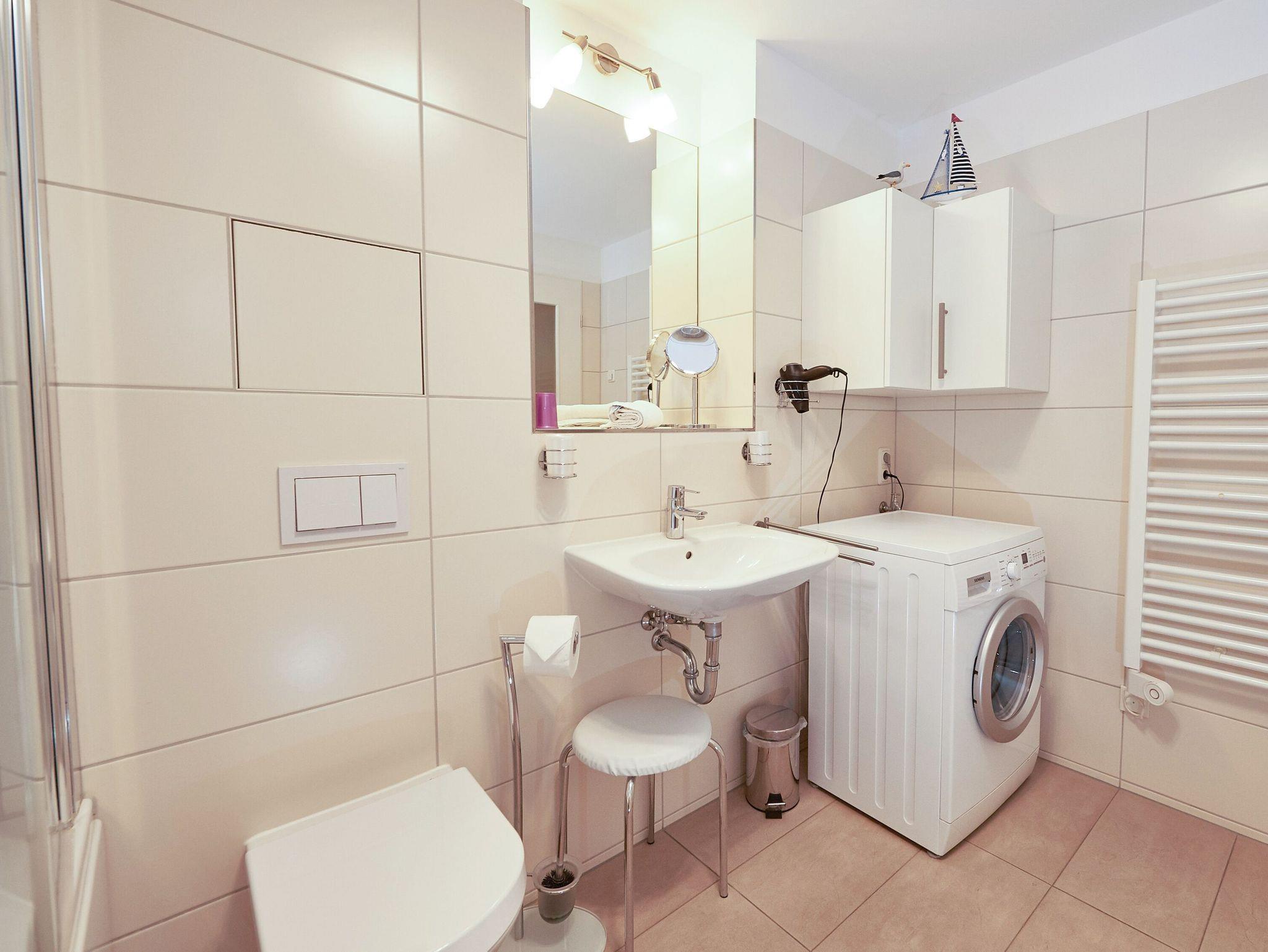 Ihre Ferienwohnung bietet Ihnen darüber hinaus den Komfort einer eigenen Waschmaschine nebst Bügeleisen und Bügelbrett, welche Sie kostenfrei benutzen können. Echtholzparkett (außer Küche), eine einzeln regulierbare Fußbodenheizung sowie die indirekte Voutenbeleuchtung unterstreichen den hochwertigen Gesamteindruck.