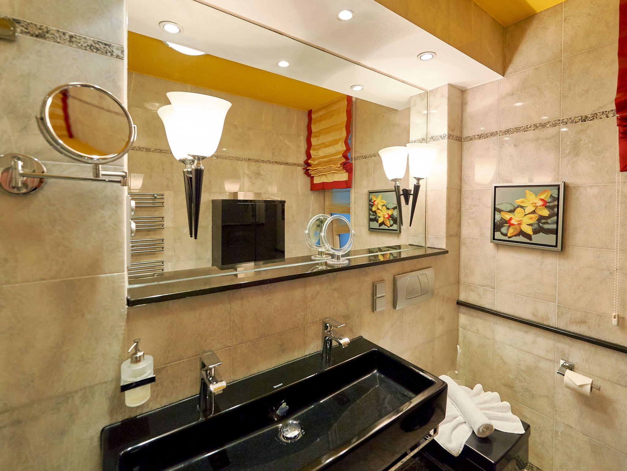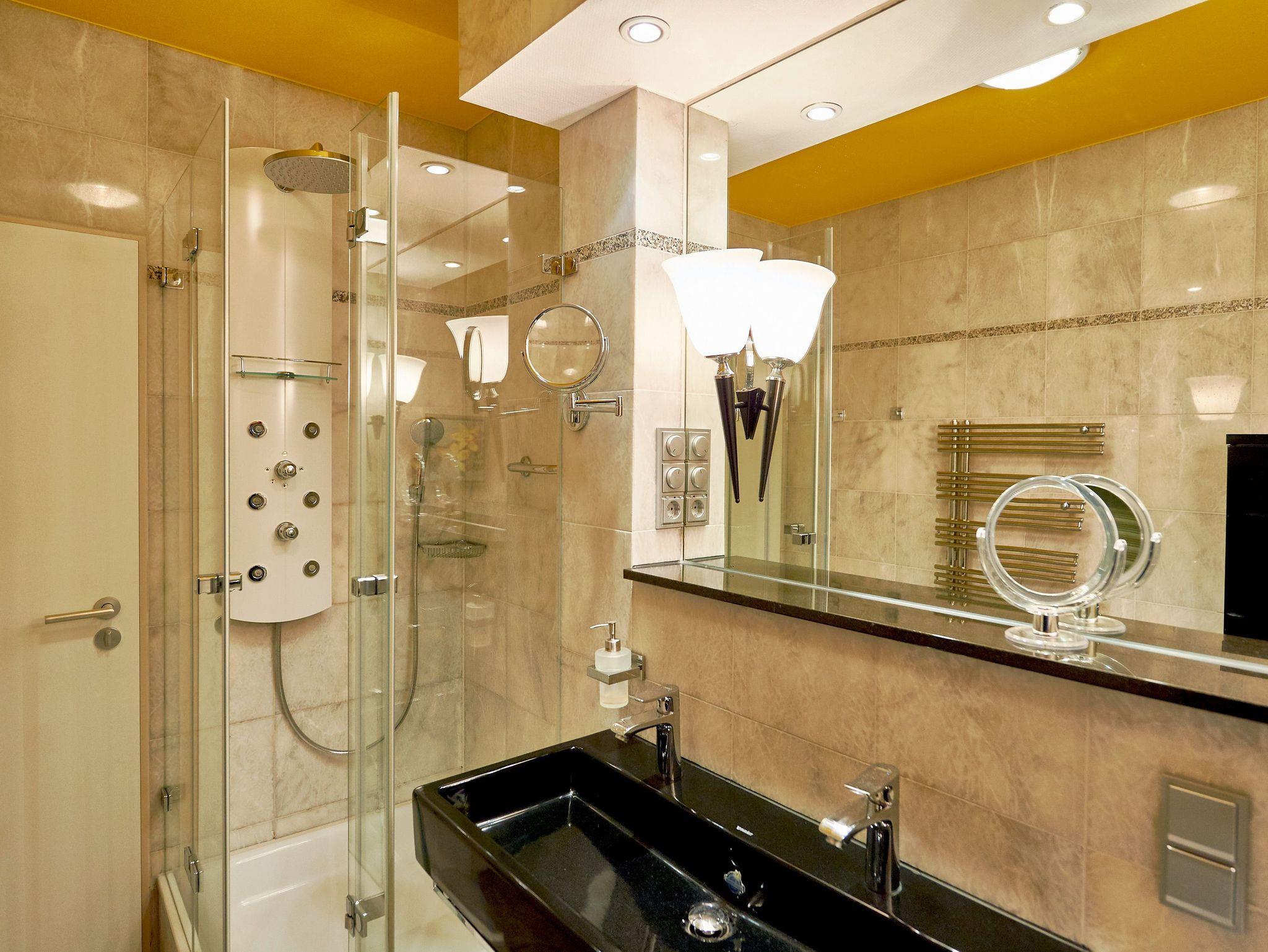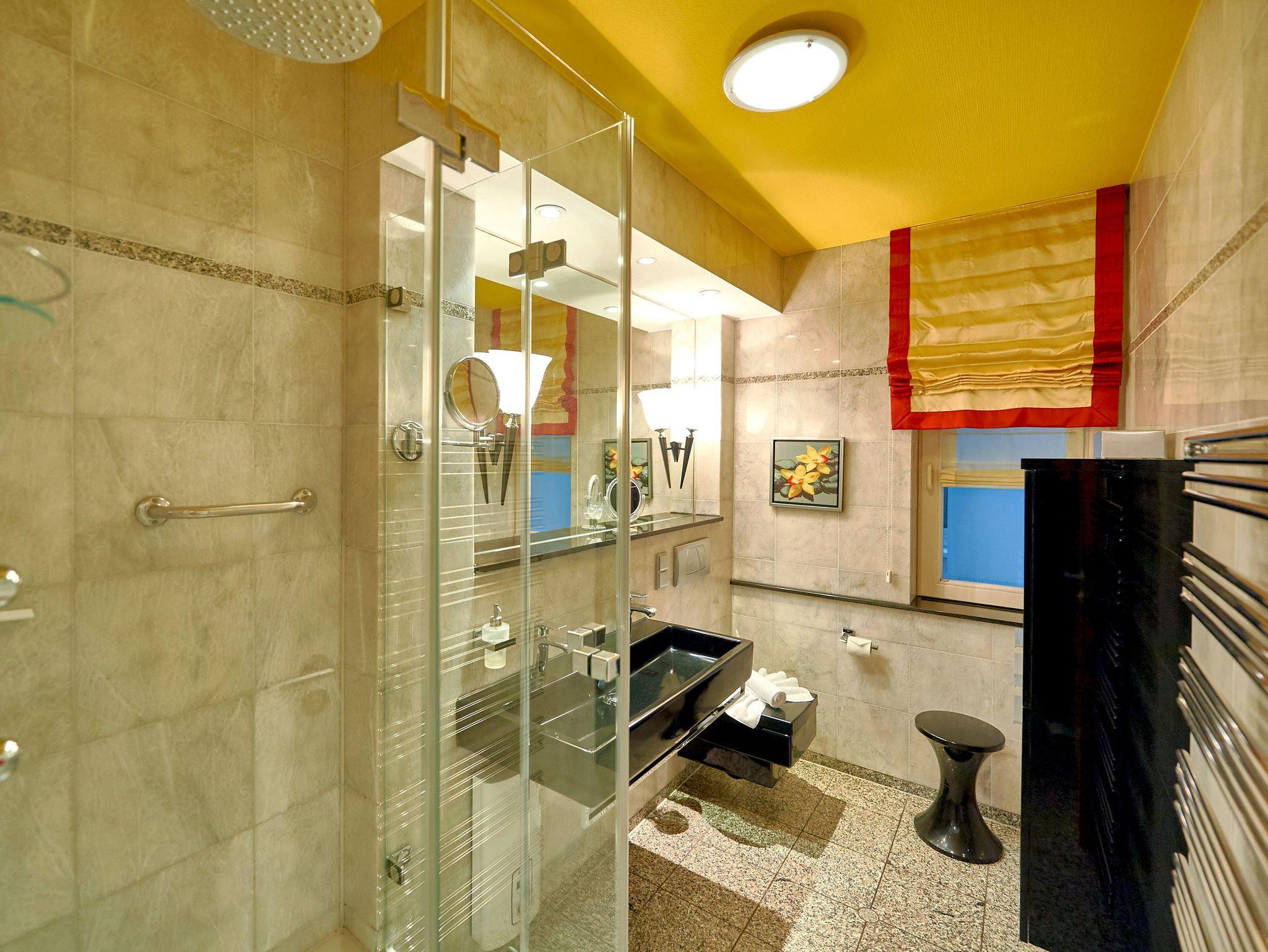 Mit schwarz-glänzendem Marmor und Granit geht es auch im Badezimmer sehr exklusiv und elegant zu. Hier stehen Ihnen ein großer Doppelwaschtisch, eine Dusche, ein beheizter Handtuchtrockner und ein WC zur Verfügung. Angenehmes Licht, ein Fenster, viele Ablageflächen, ein Fön und ein Kosmetikspiegel runden den schönen Gesamteindruck der Wohnung ab.